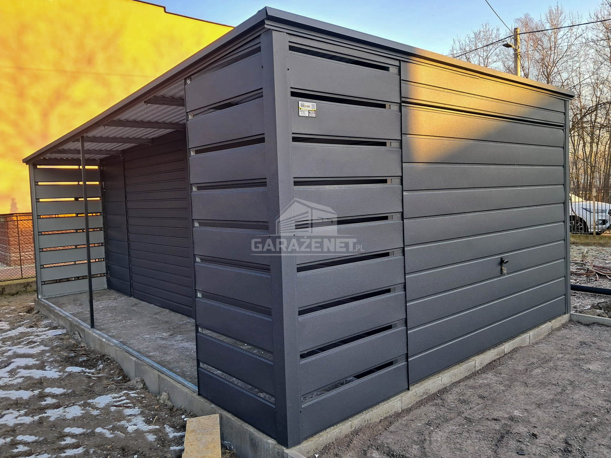 GARAŻ BLASZANY 3X6M + WIATA 1M - BRAMA UCHYLNA - DRZWI - ANTRACYT - DACH SPAD W TYŁ TS1048