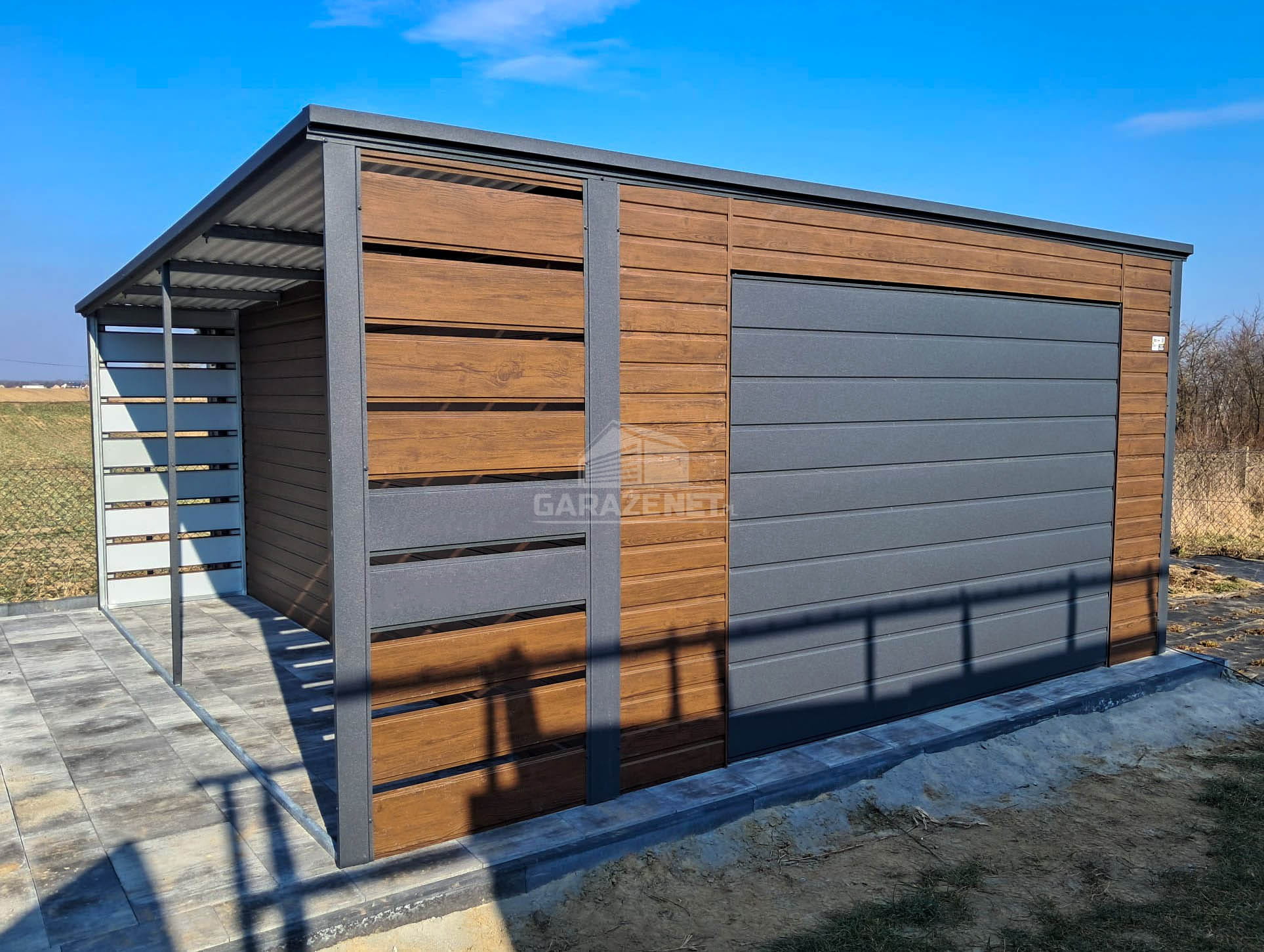 GARAŻ BLASZANY 4,5X6M + WIATA 1M - BRAMA UCHYLNA - DRZWI - OKNO - JASNY ORZECH DREWNOPODOBNY - RYNNY - DACH SPAD W TYŁ TS1063