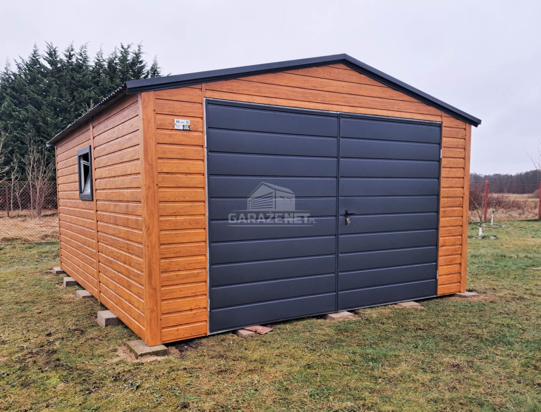 GARAŻ BLASZANY 4X5M - BRAMA DWUSKRZYDŁOWA - OKNO - JASNY ORZECH - DREWNOPODOBNY - DACH DWUSPADOWY TS1064