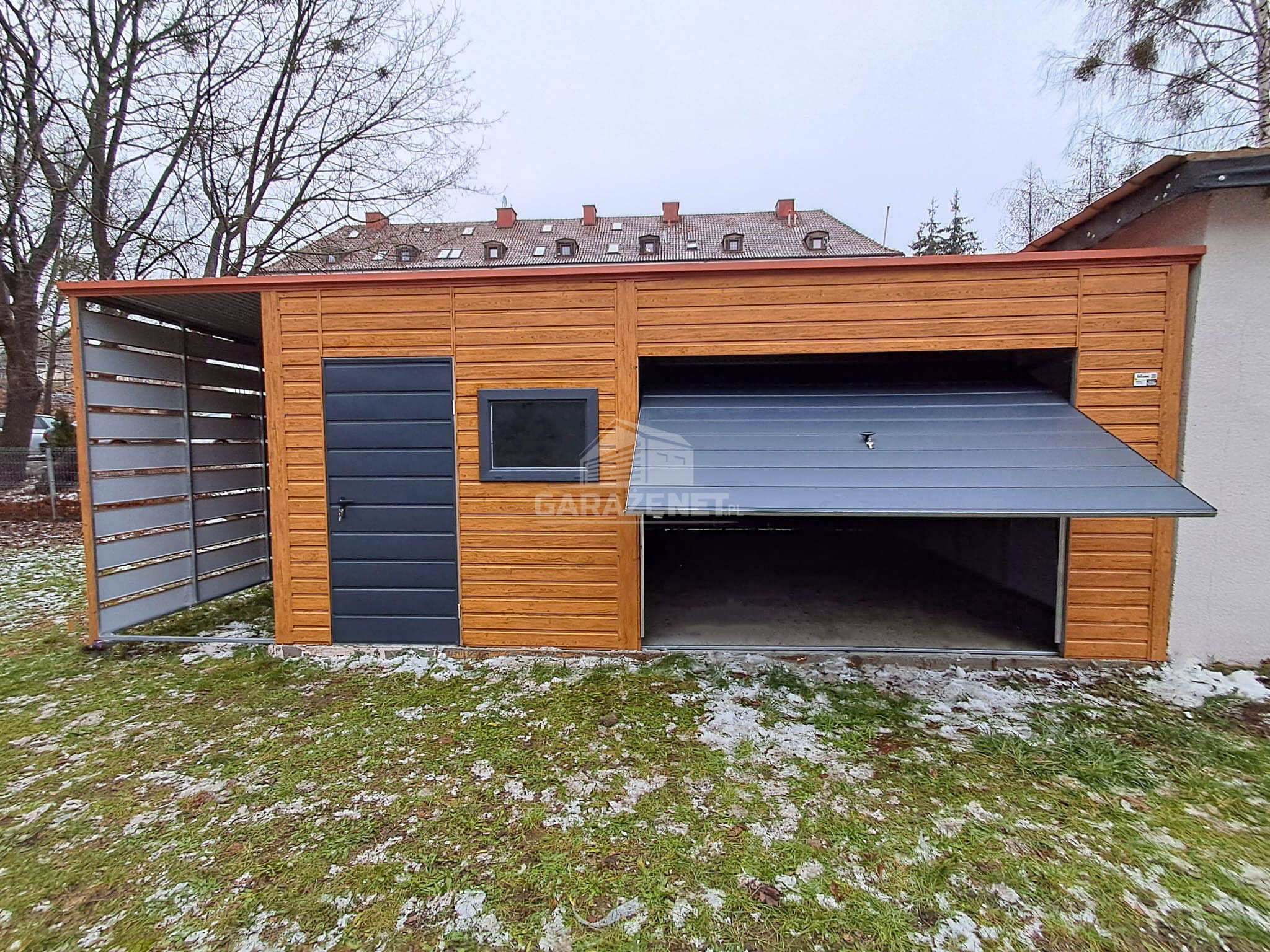 GARAŻ BLASZANY 6X6M + WIATA 1,5M - BRAMA UCHYLNA - DRZWI - OKNO - JASNY ORZECH - DREWNOPODOBNY - ANTRACYT - DACH SPAD W TYŁ TS1051