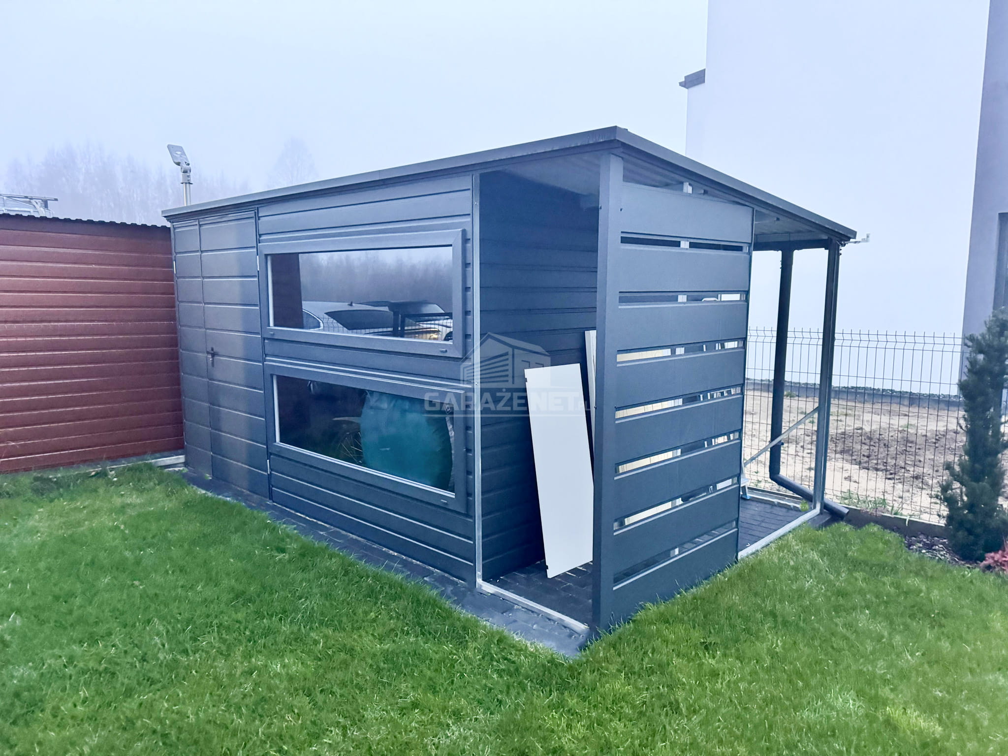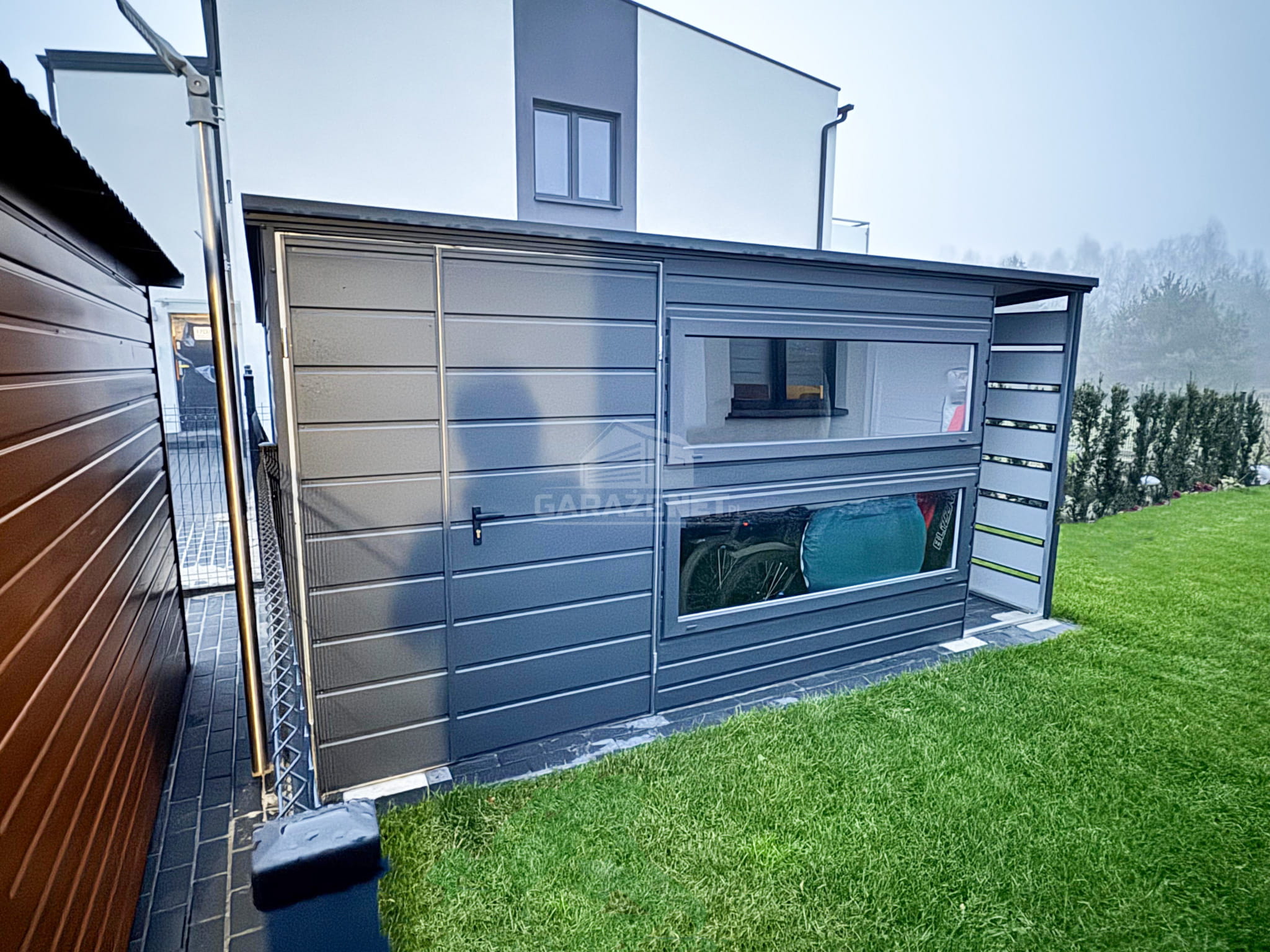 SCHOWEK - DOMEK OGRODOWY 3,8X2,5M + WIATA 0,7X2,5M - BRAMA DWUSKRZYDŁOWA - 2X OKNO - ANTRACYT - RYNNY - DACH SPAD W TYŁ TS963