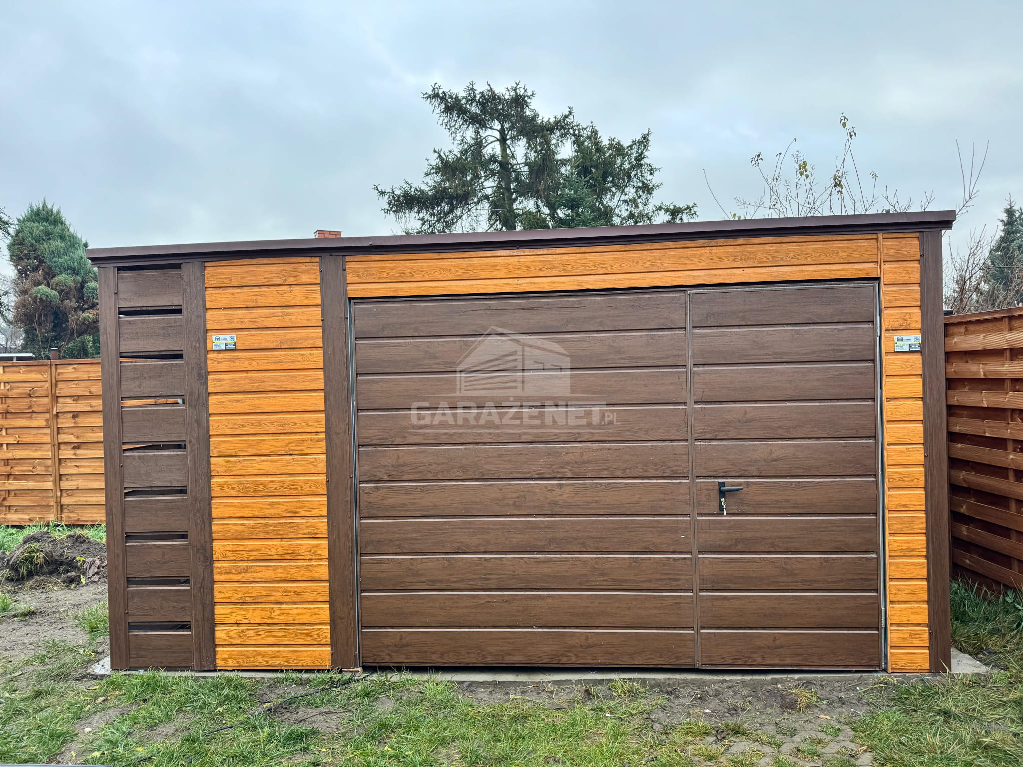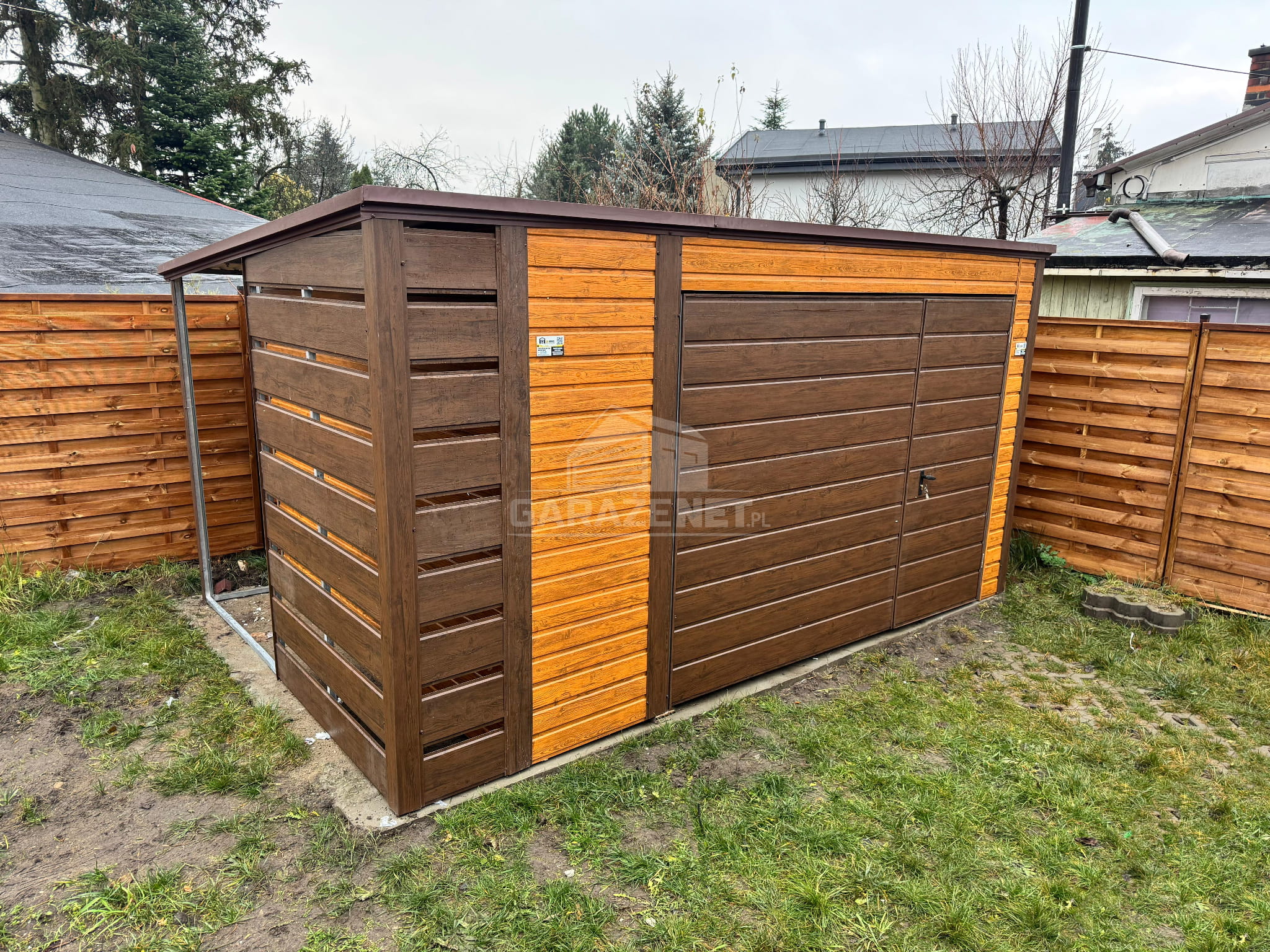 SCHOWEK - DOMEK OGRODOWY - GARAŻ 4X3M + WIATA 0,5M - BRAMA - JASNY ORZECH - CIEMNY ORZECH - DREWNOPODOBNY - DACH SPAD W TYŁ TS959