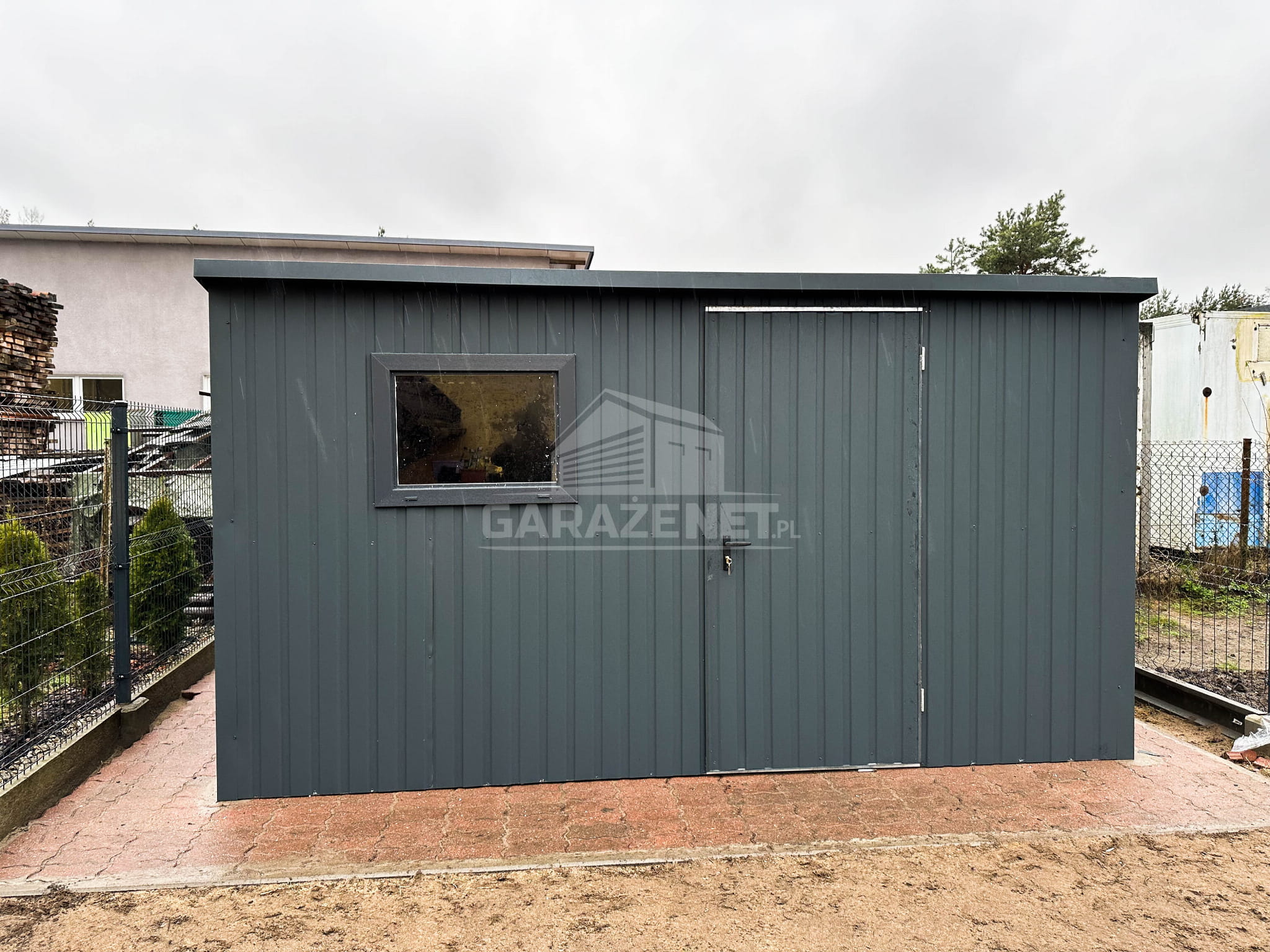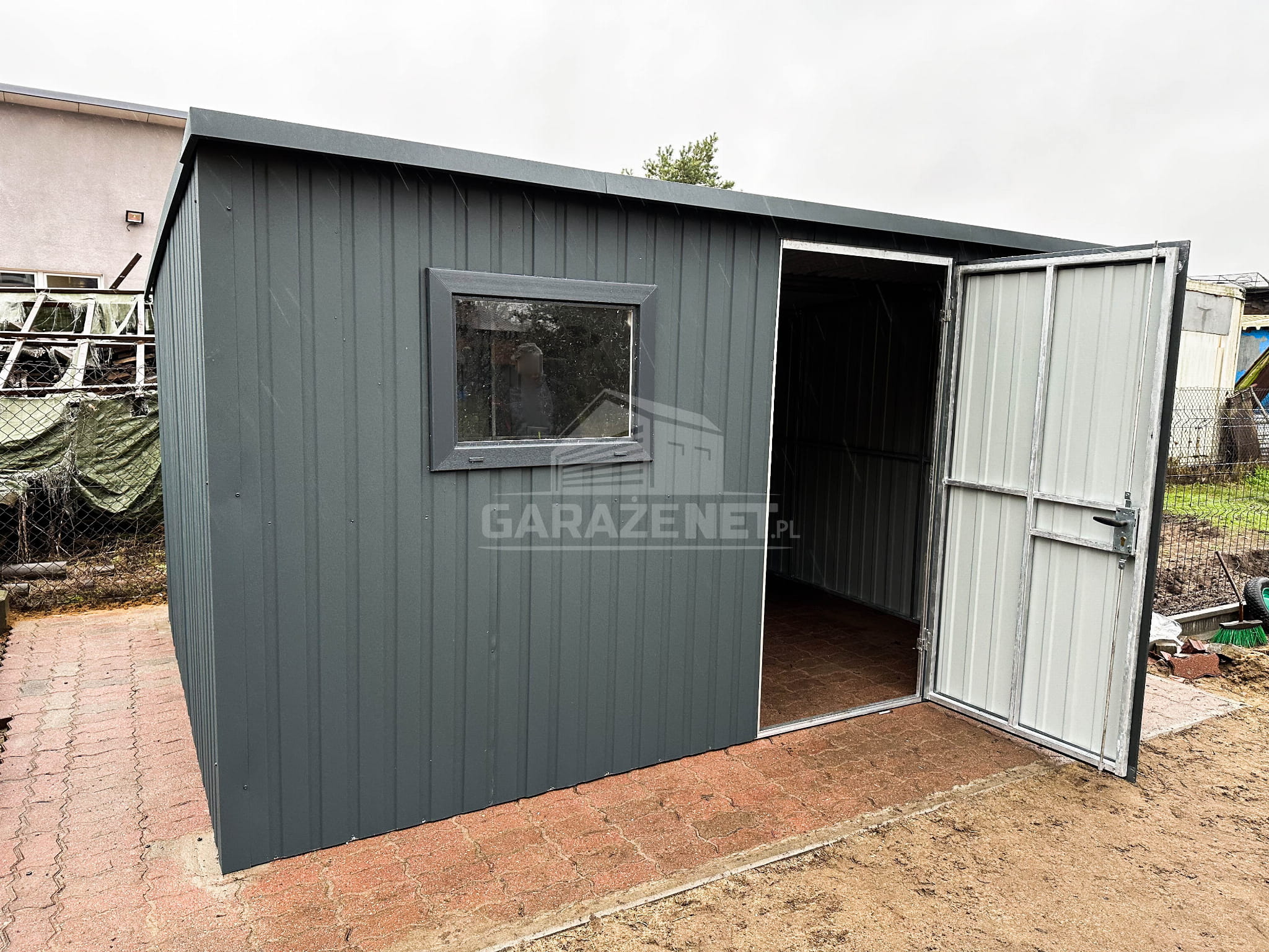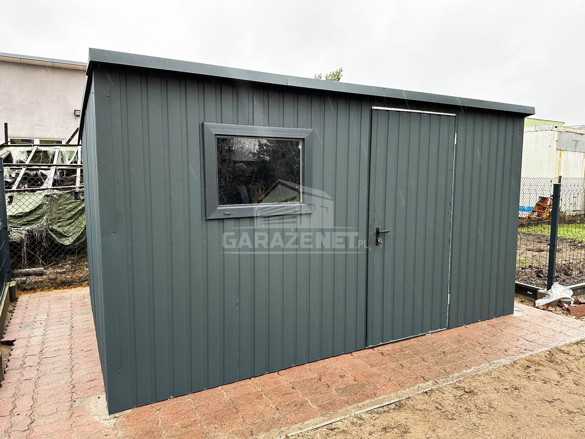 DOMEK OGRODOWY - SCHOWEK BLASZANY 4X4 - OKNO - DRZWI - ANTRACYT - DACH SPAD W TYŁ DG353