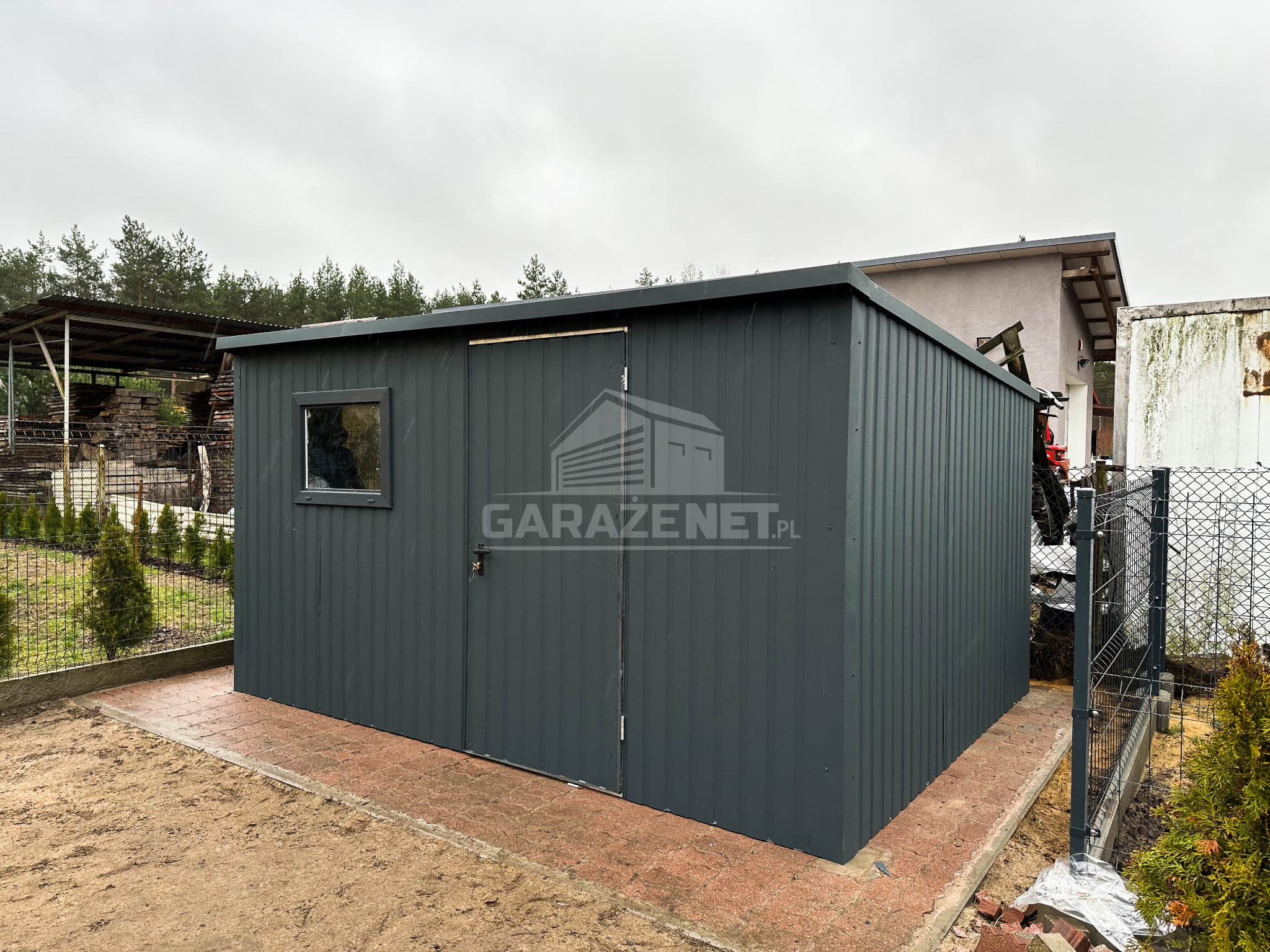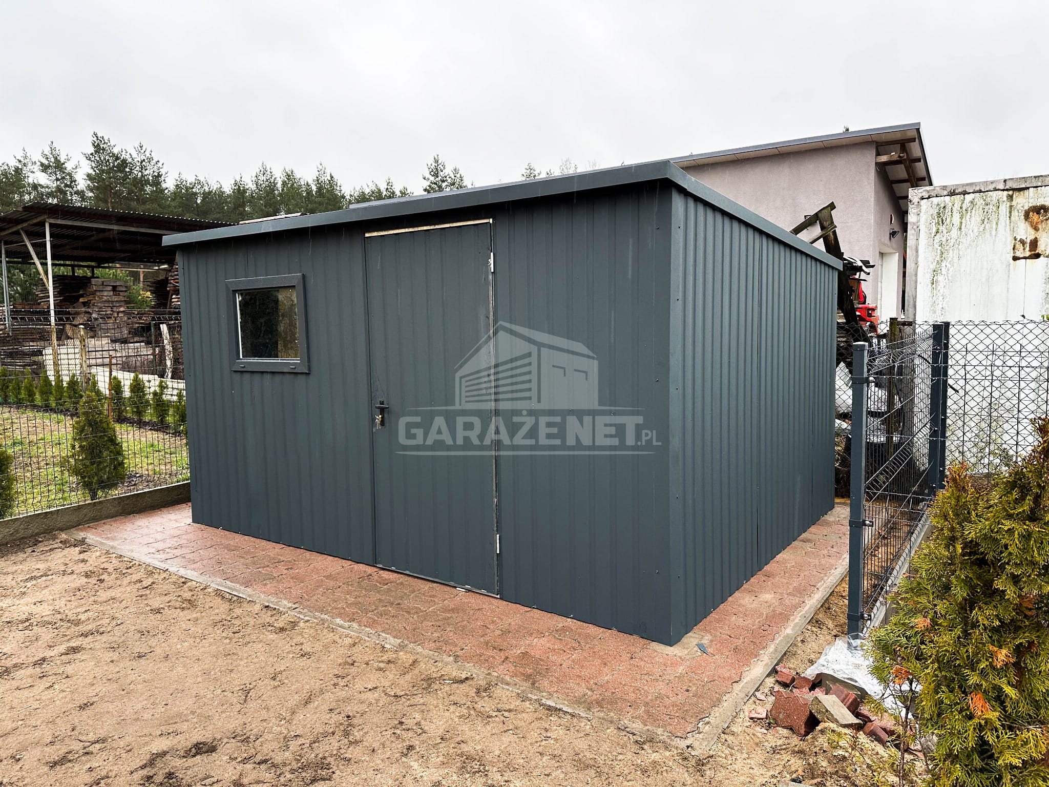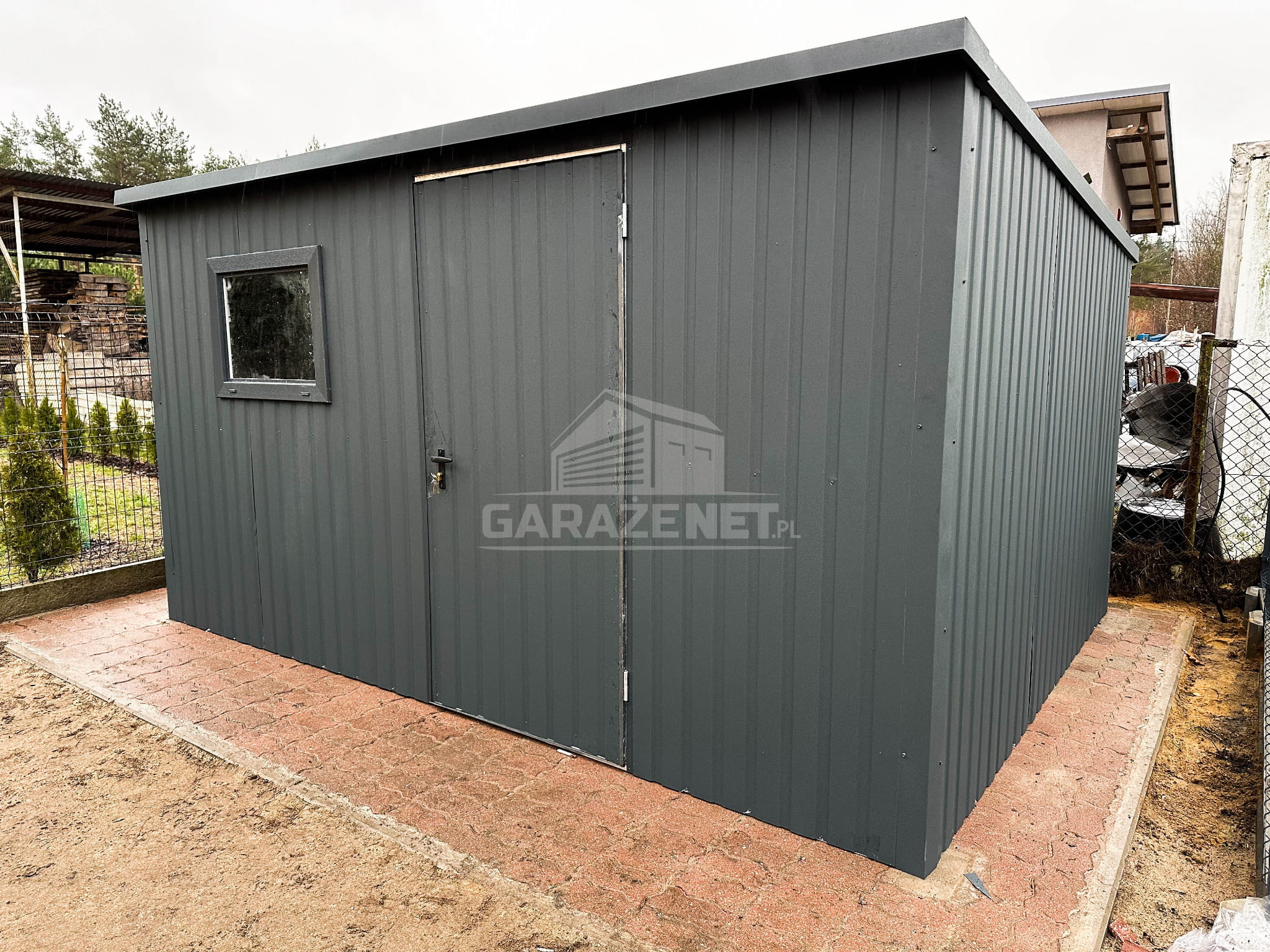 DOMEK OGRODOWY - SCHOWEK BLASZANY 4X4 - OKNO - DRZWI - ANTRACYT - DACH SPAD W TYŁ DG353