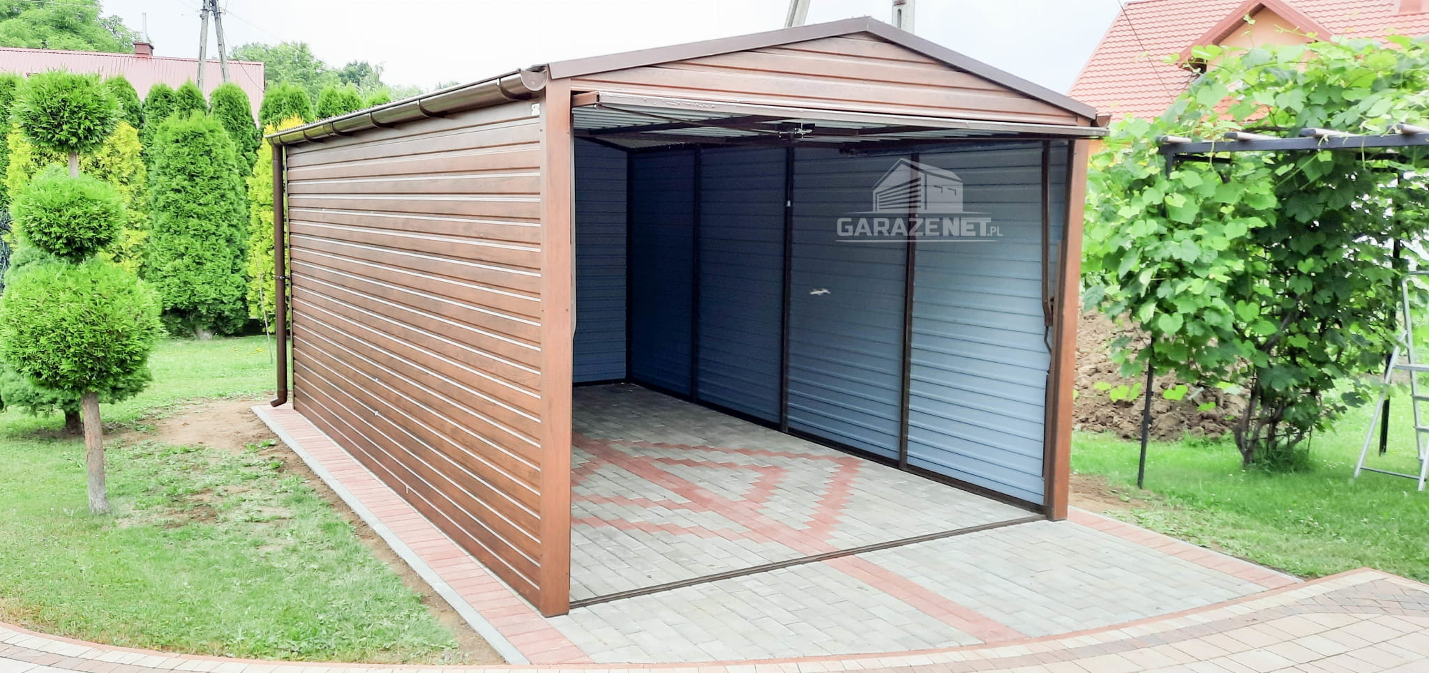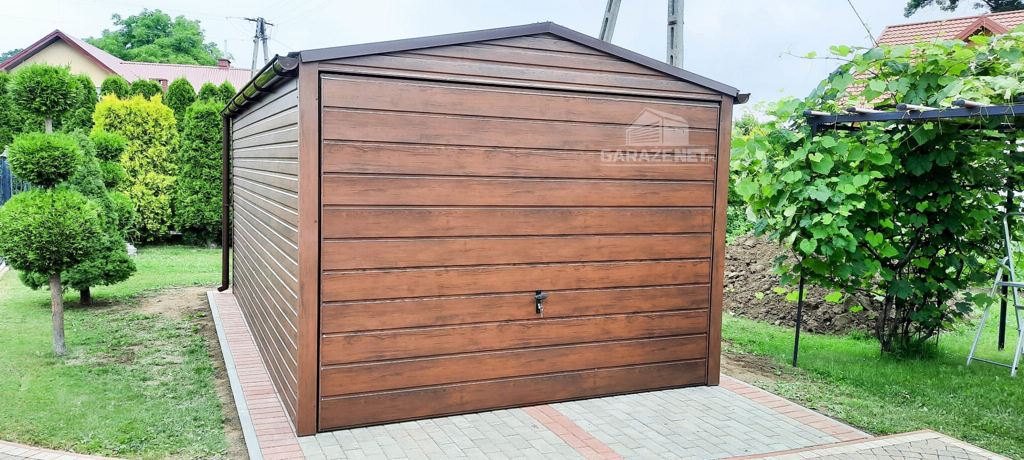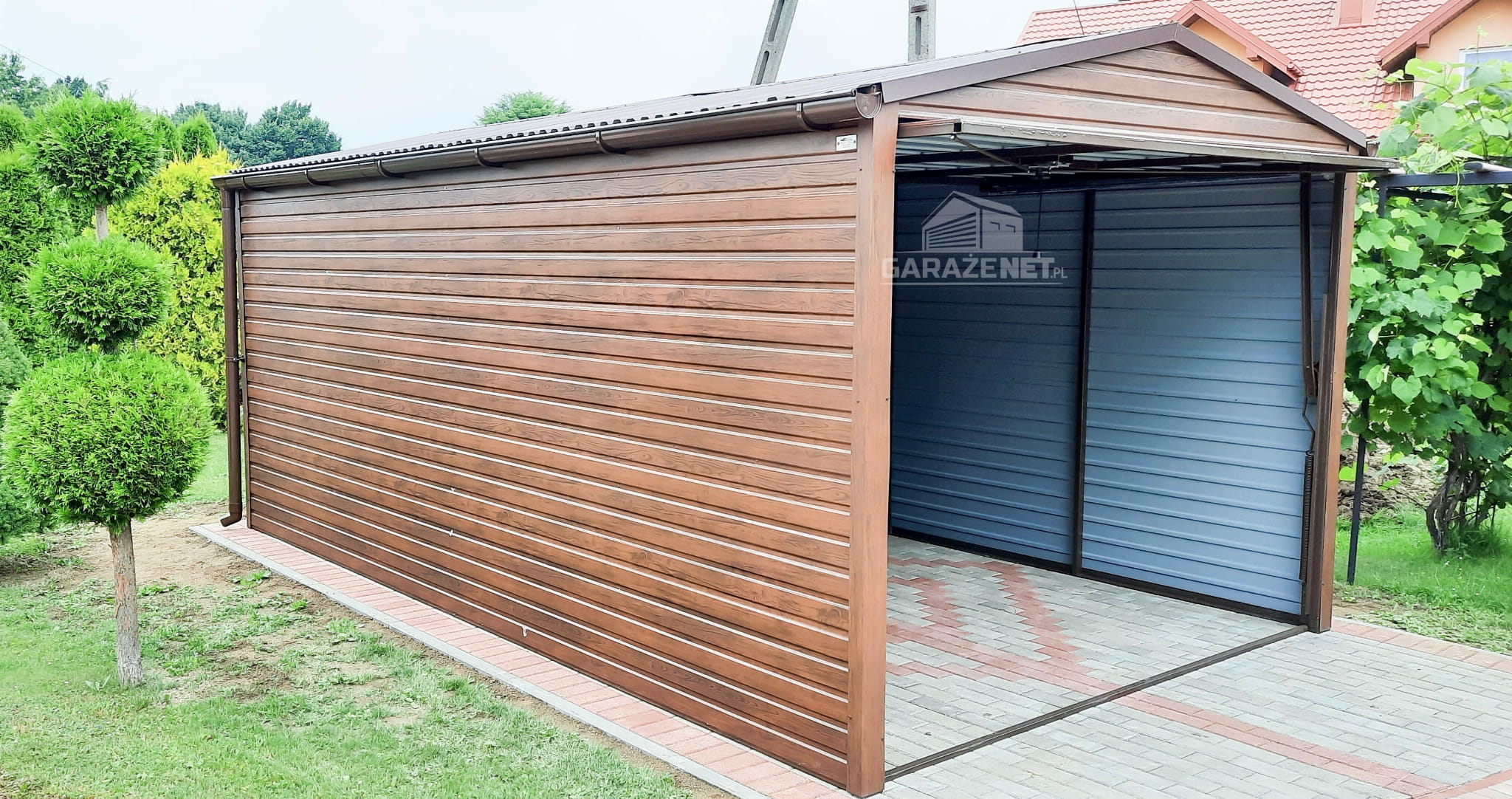 GARAŻ BLASZANY 3M X 6M POZIOM - DWUSPAD - BRAMA UCHYLNA - CIEMNY ORZECH RYNNY 3X6 GB247