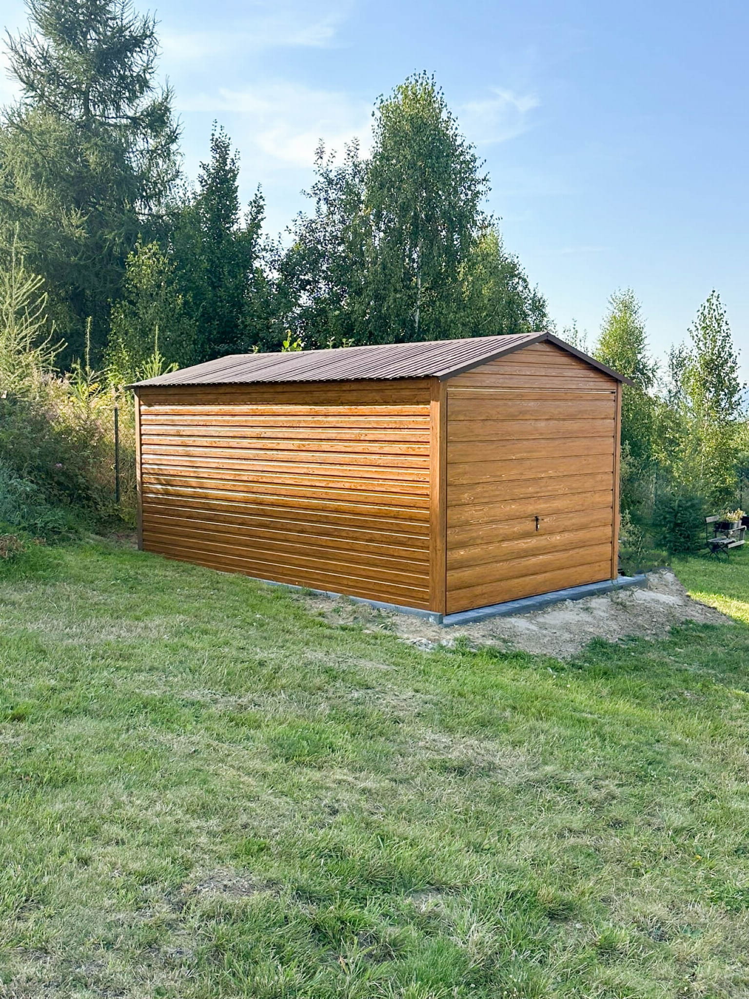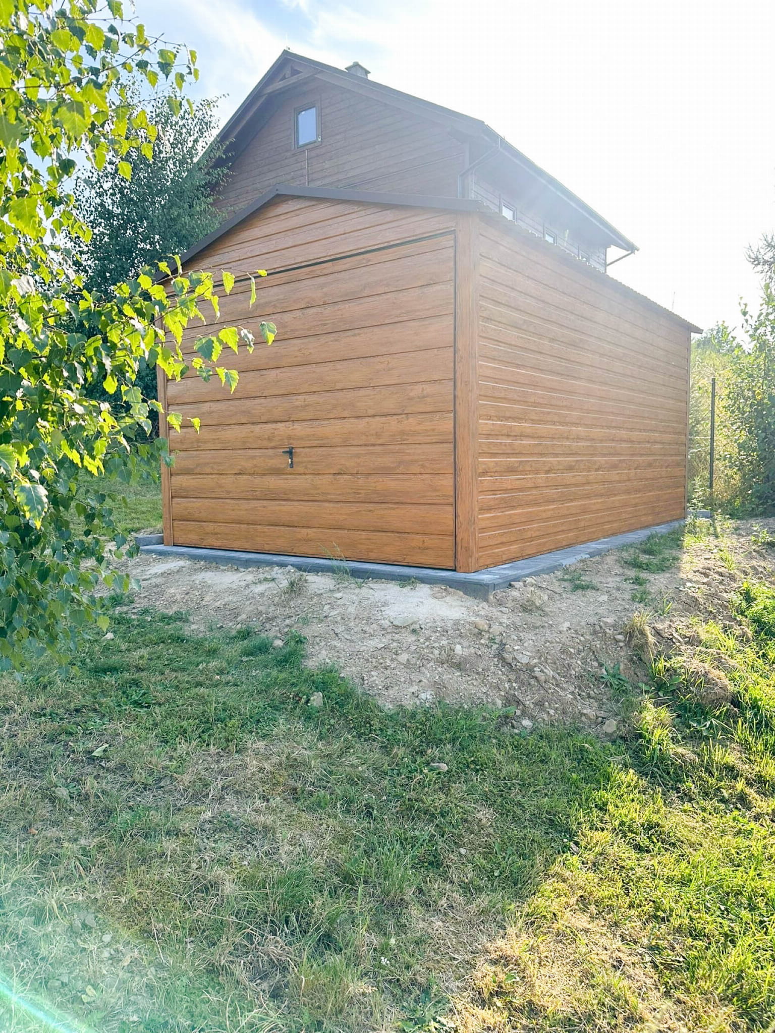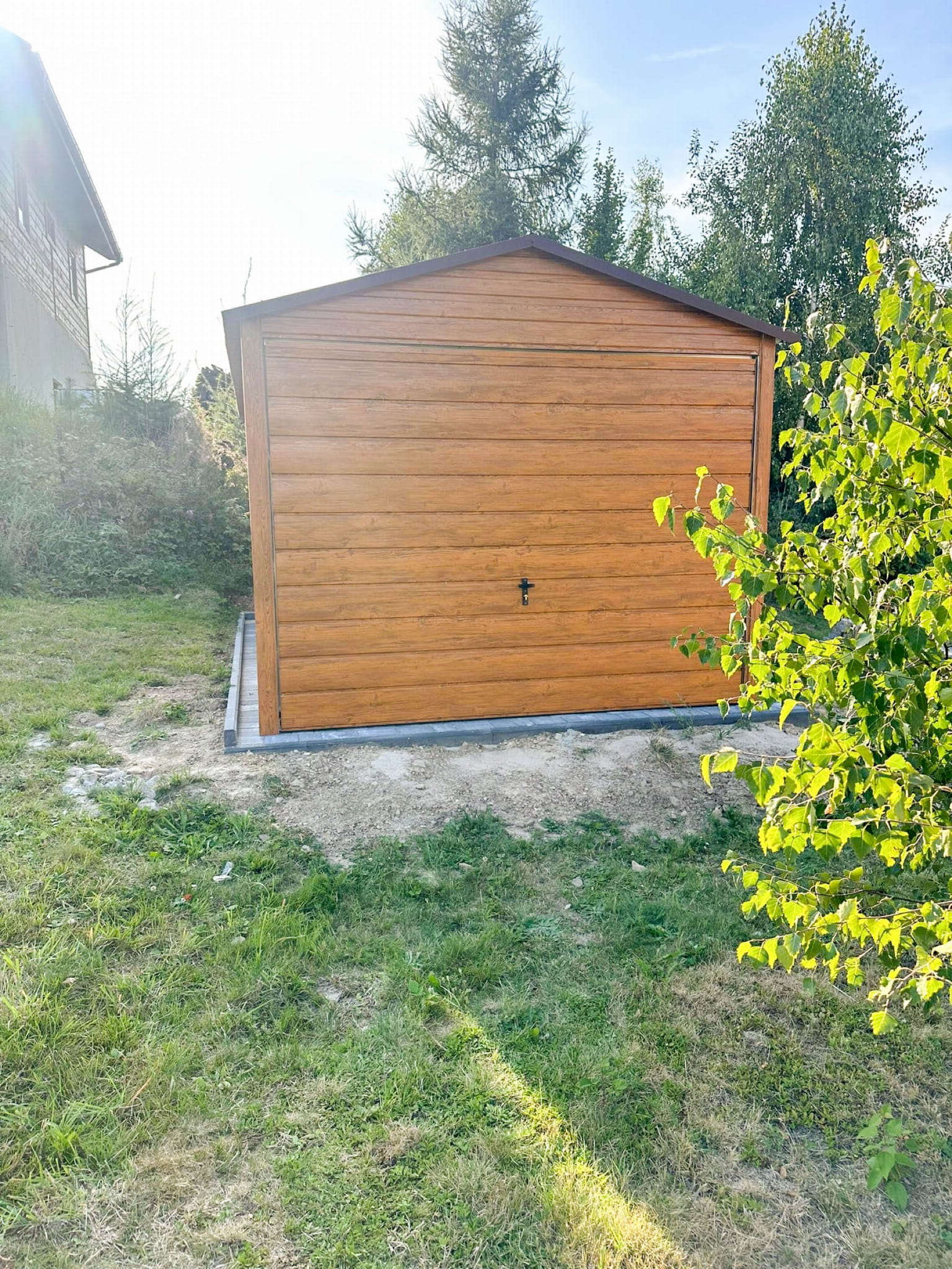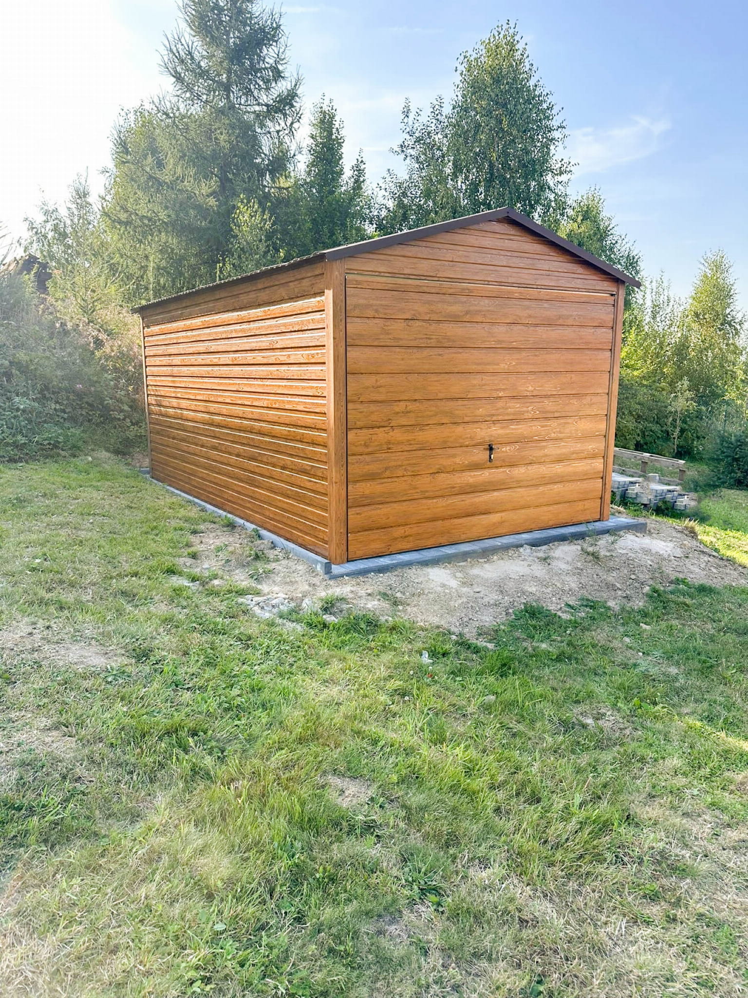 GARAŻ BLASZANY 3X5M - BRAMA UCHYLNA - JASNY ORZECH - DREWNOPODOBNY - DACH DWUSPADOWY TS782
