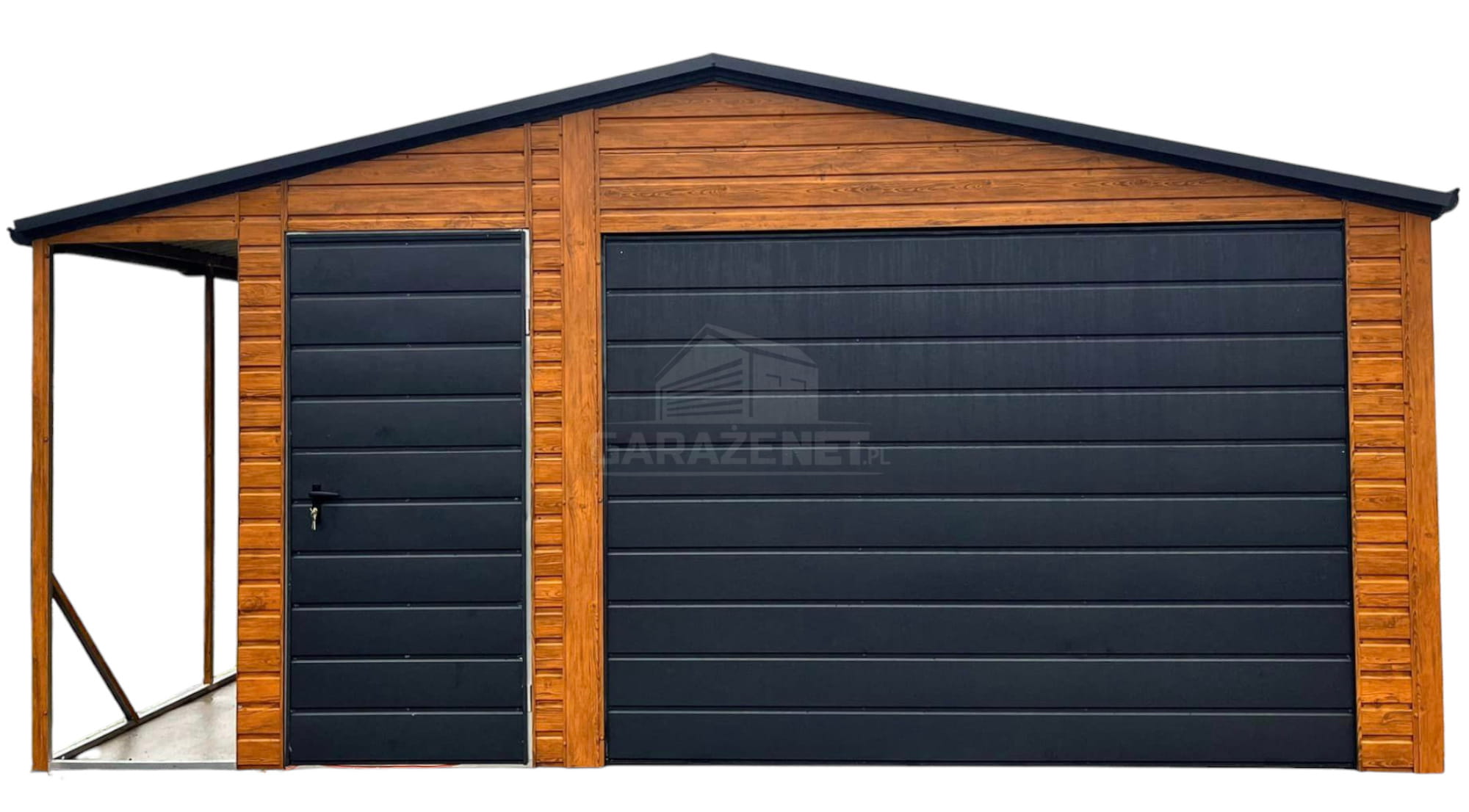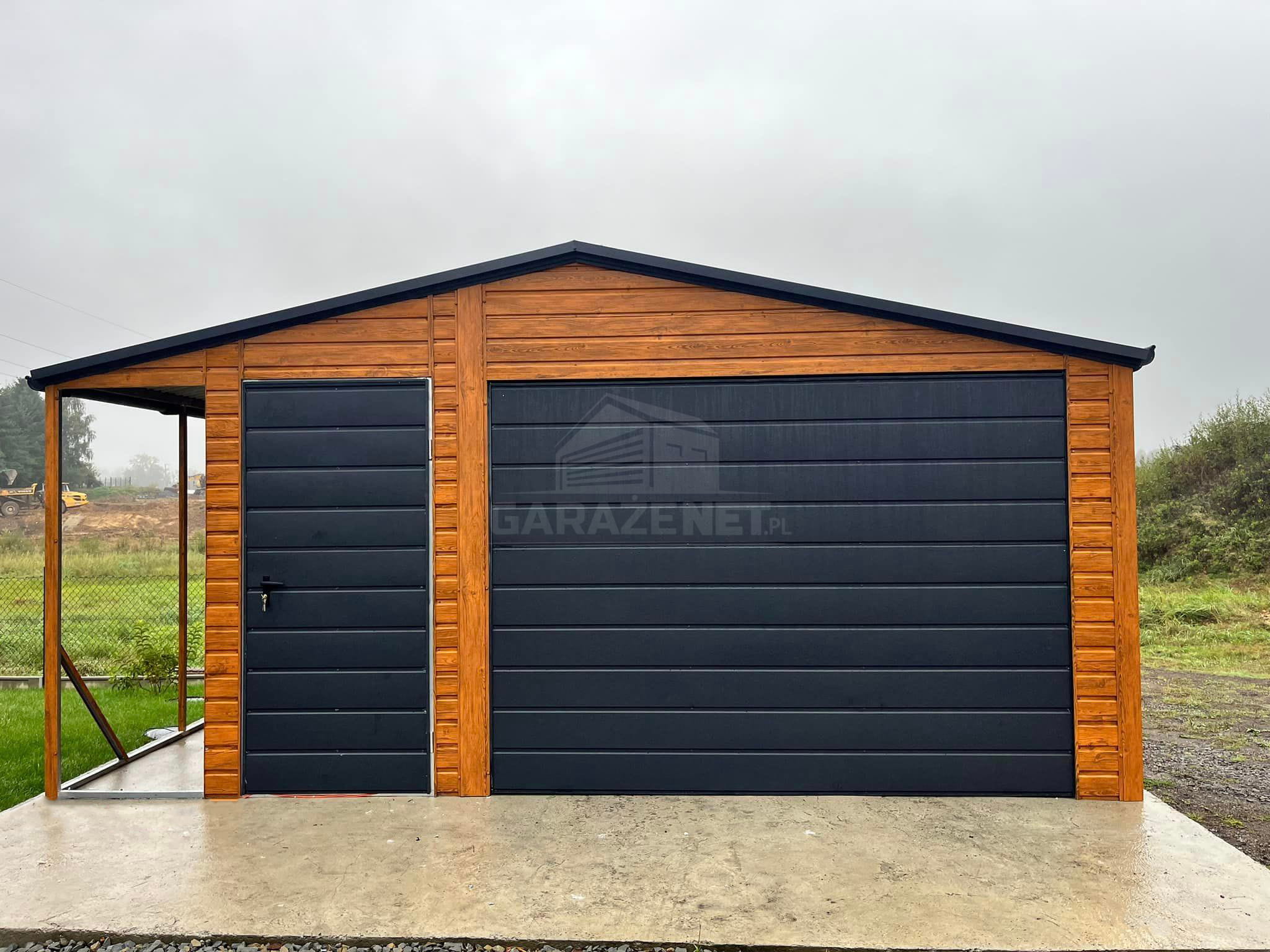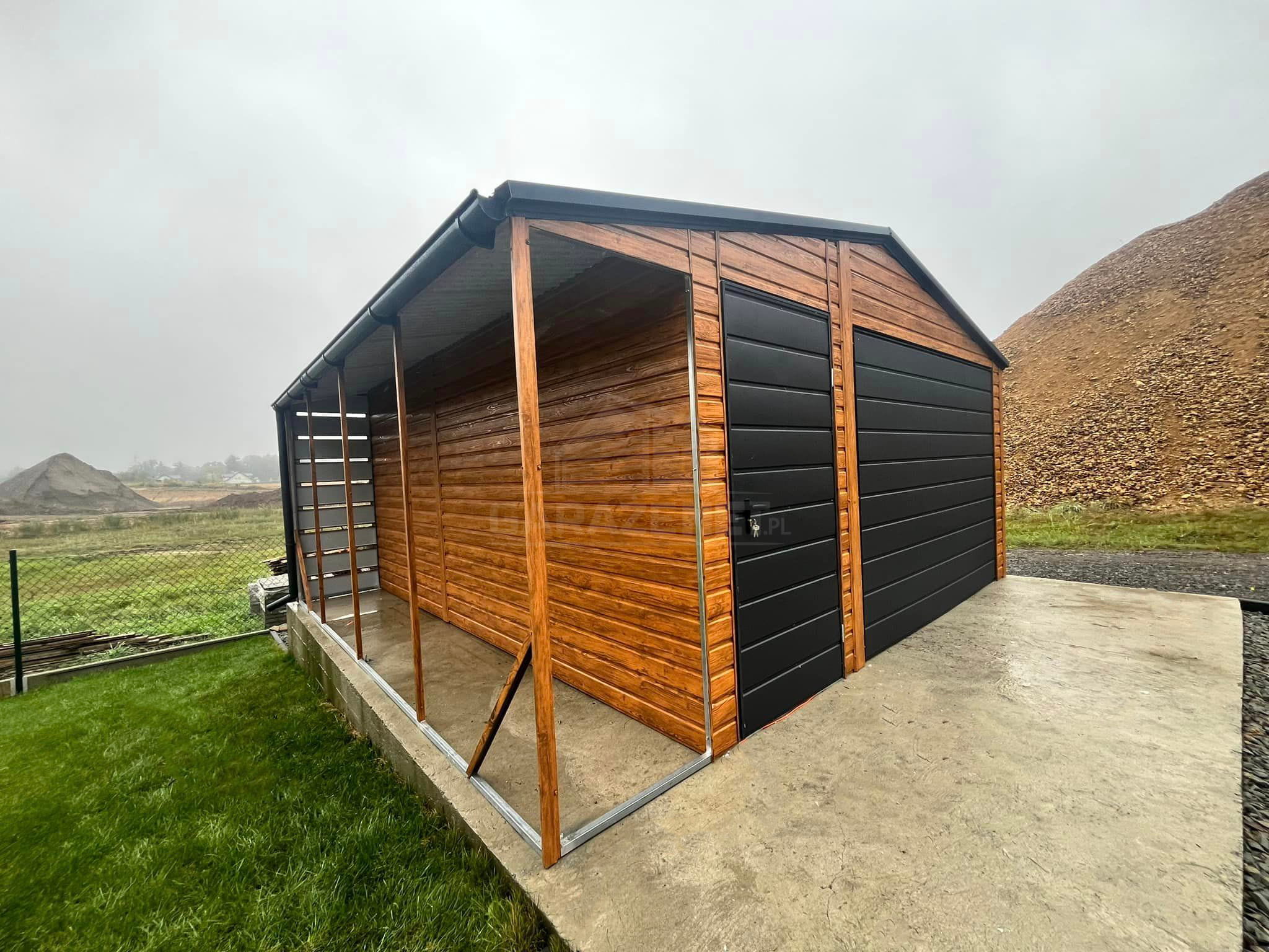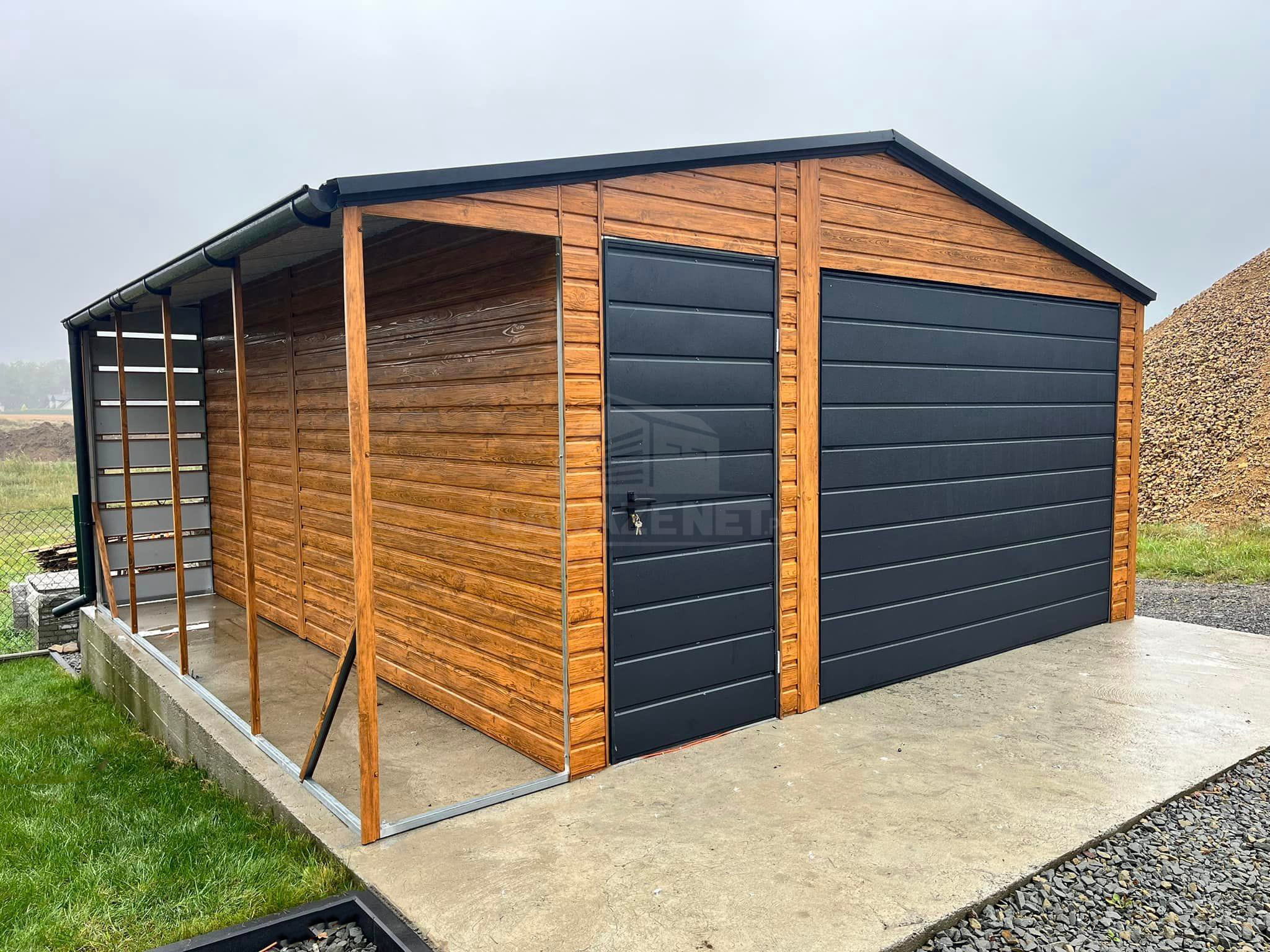 GARAŻ BLASZANY 4,5X5 + WIATA 1X5 BRAMA UCHYLNA - RYNNY- JASNY ORZECH - DREWNOPODOBNY - DACH DWUSPADOWY TS833