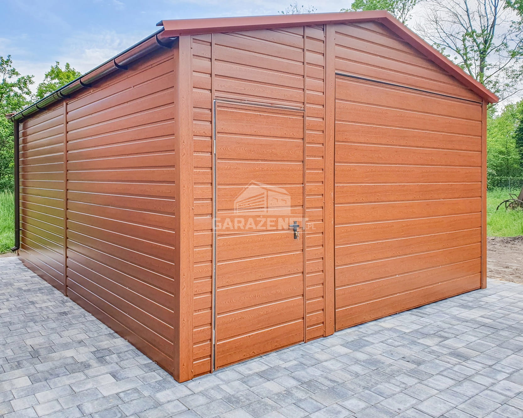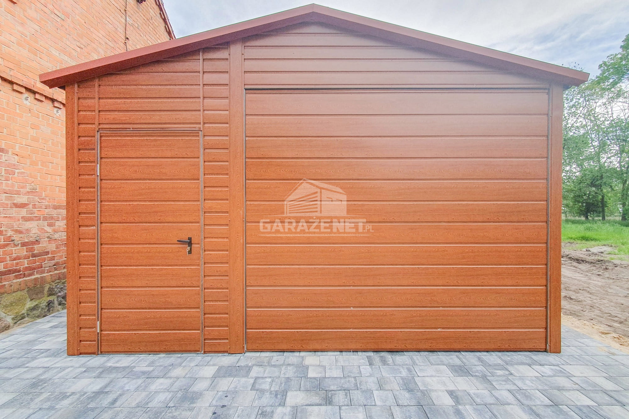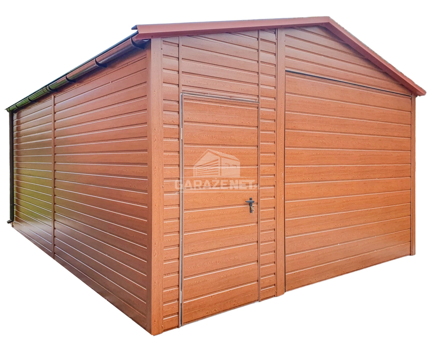 GARAŻ BLASZANY 4,5X6M - BRAMA UCHYLNA - DRZWI - OKNO - BLACHODACHÓWKA - RYNNY - ZŁOTY DĄB - DREWNOPODOBNY - DACH DWUSPADOWY TS728