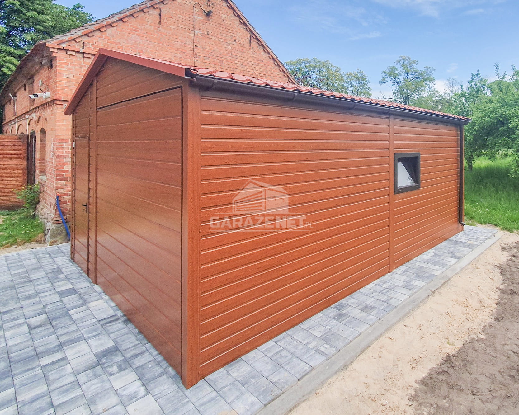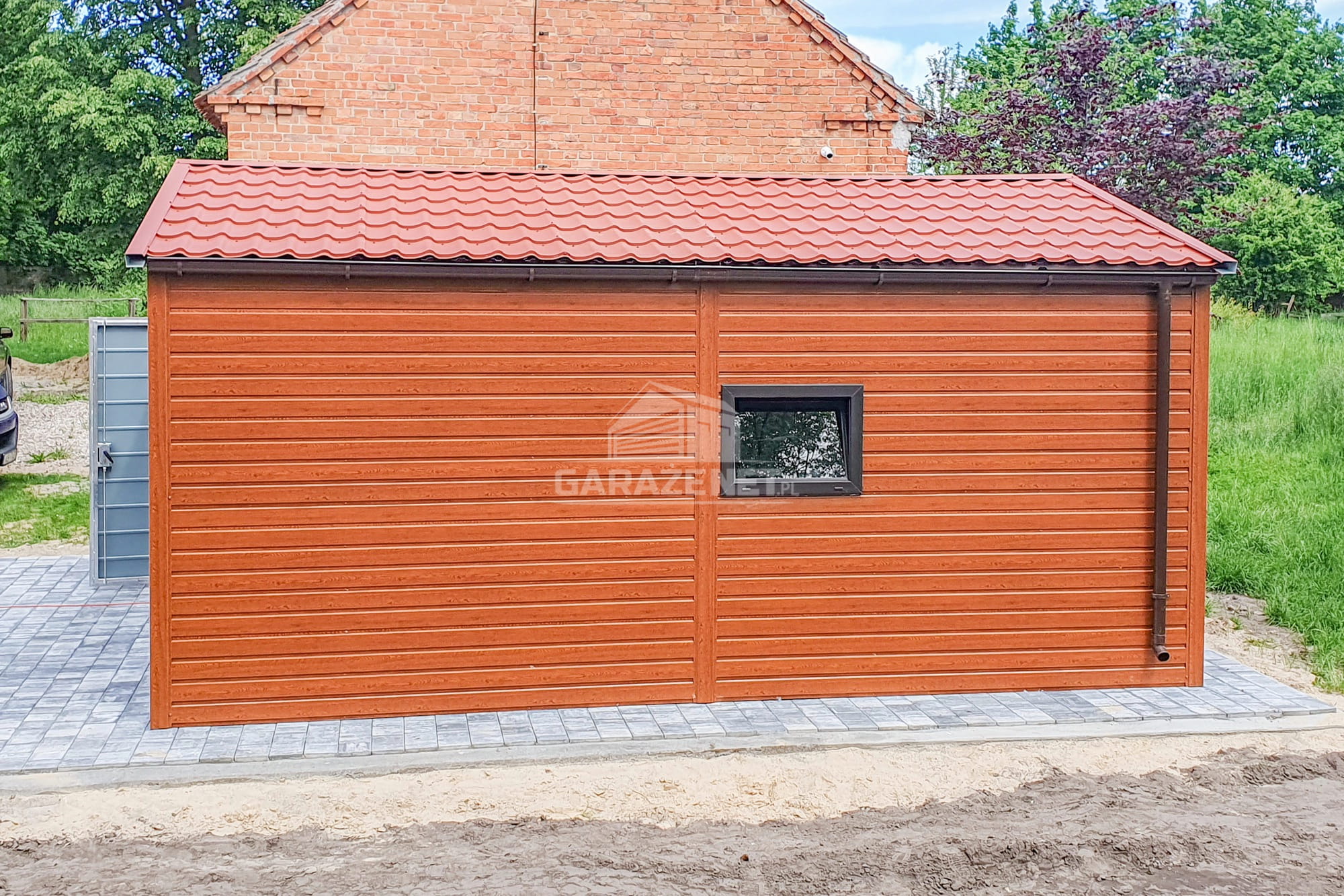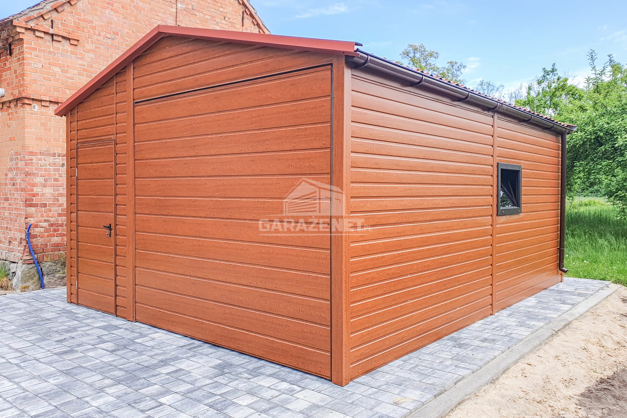 GARAŻ BLASZANY 4,5X6M - BRAMA UCHYLNA - DRZWI - OKNO - BLACHODACHÓWKA - RYNNY - ZŁOTY DĄB - DREWNOPODOBNY - DACH DWUSPADOWY TS728