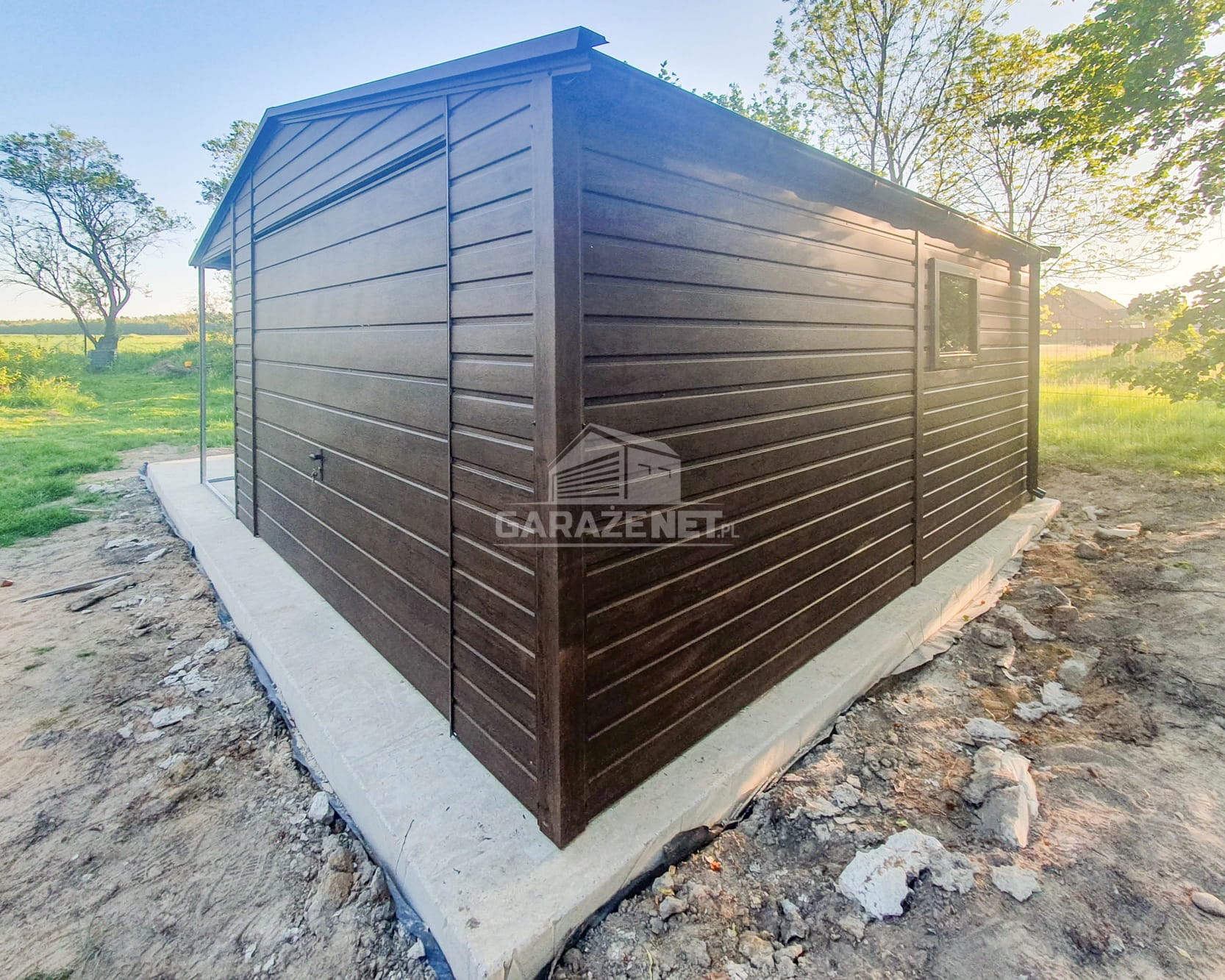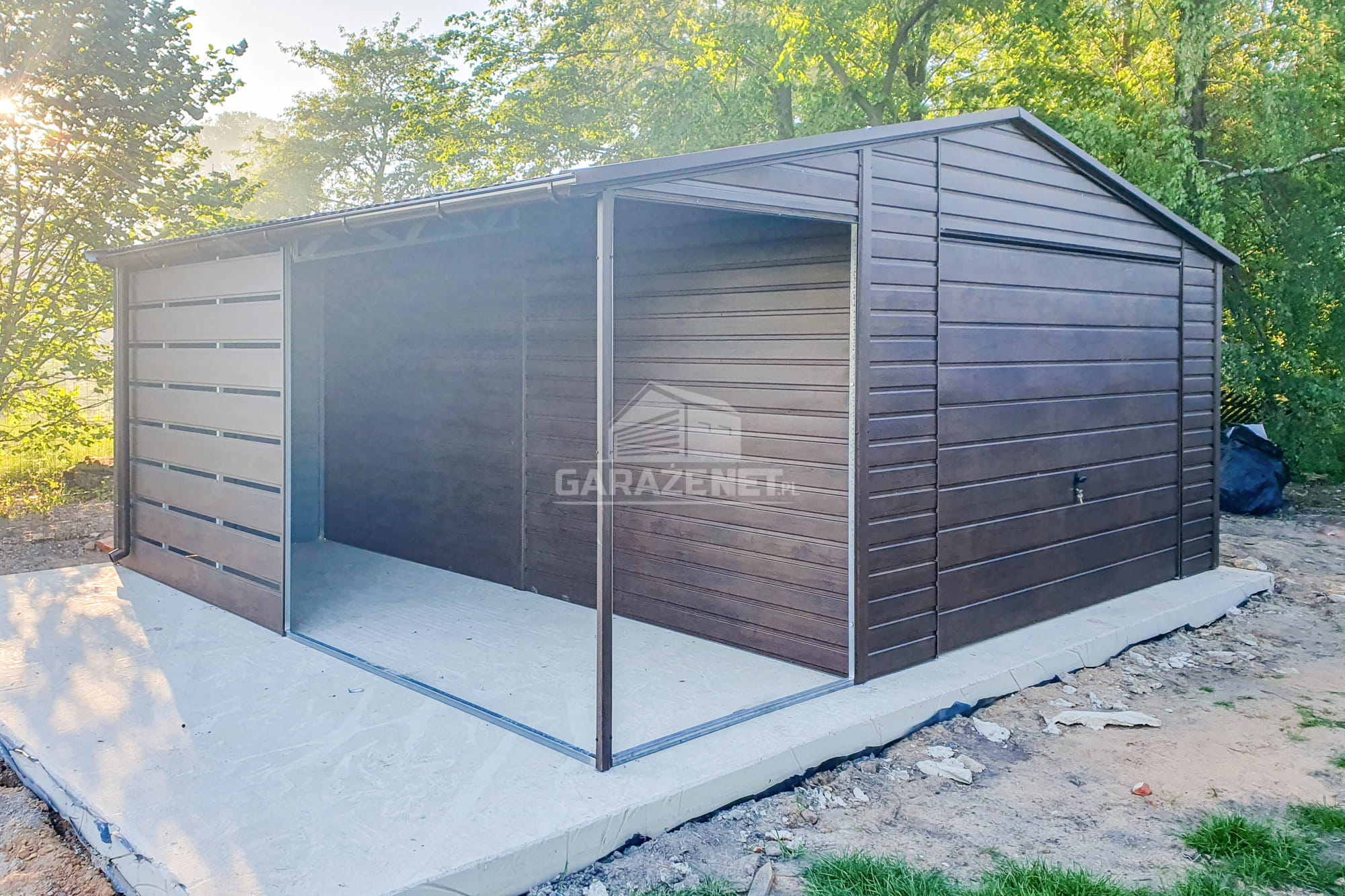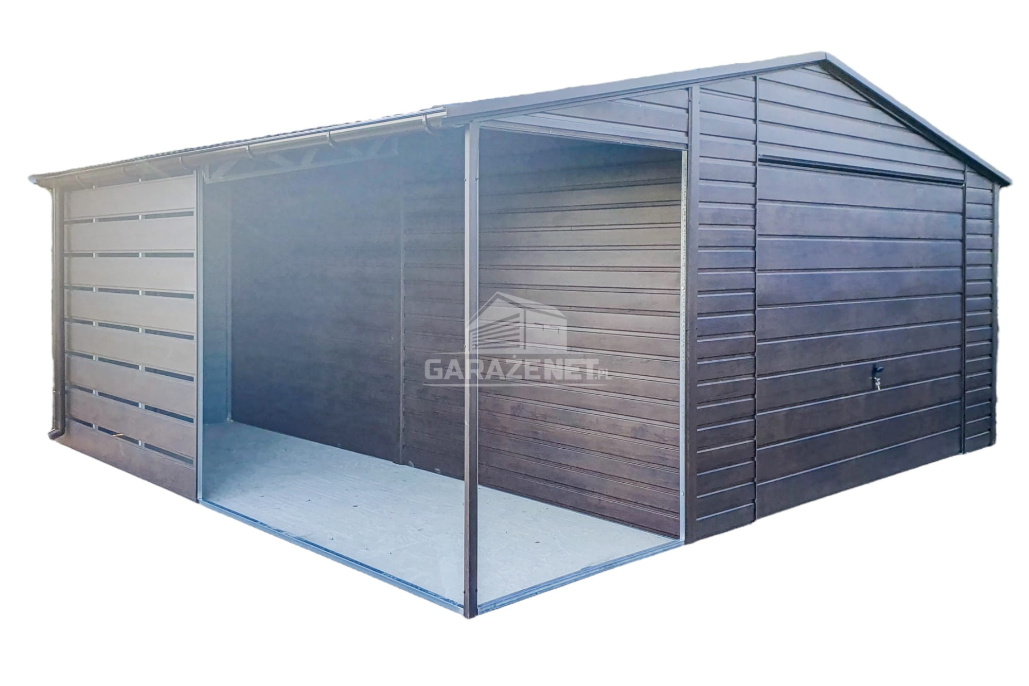 GARAŻ BLASZANY 4,5X6M + WIATA 2M - BRAMA UCHYLNA - OKNO - CIEMNY ORZECH - DREWNOPODOBNY - RYNNY - DACH DWUSPADOWY TS729