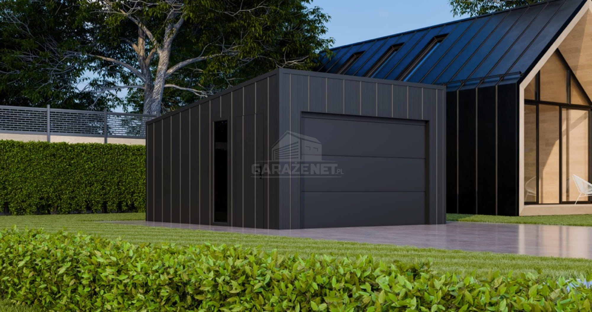 • dach: spad w tył, pokryty blachą na rąbek, kolor: antracyt mat 7016