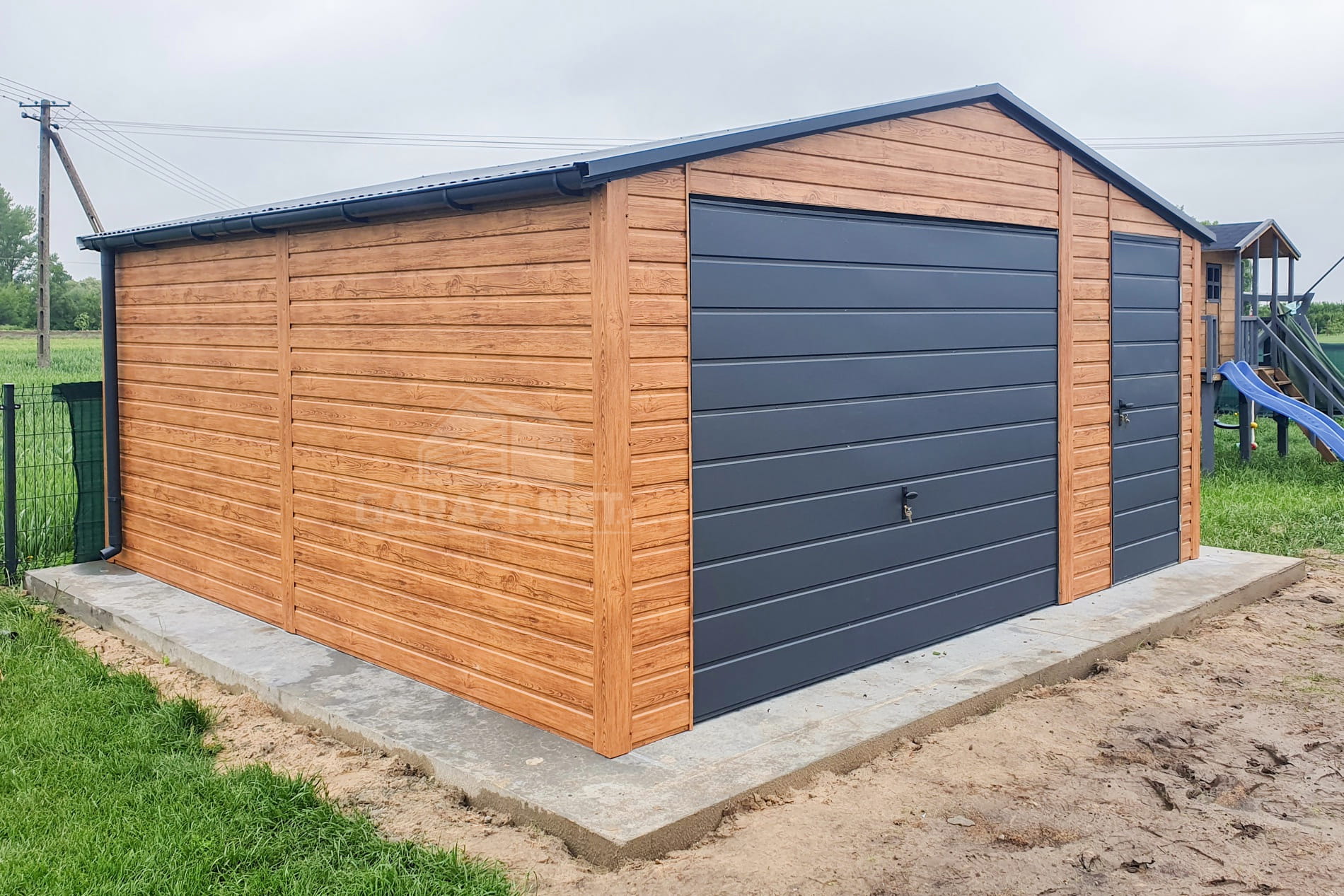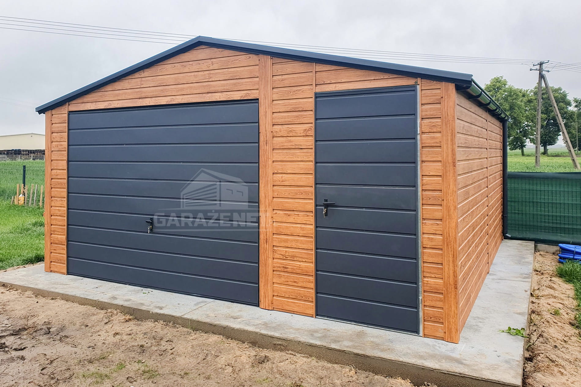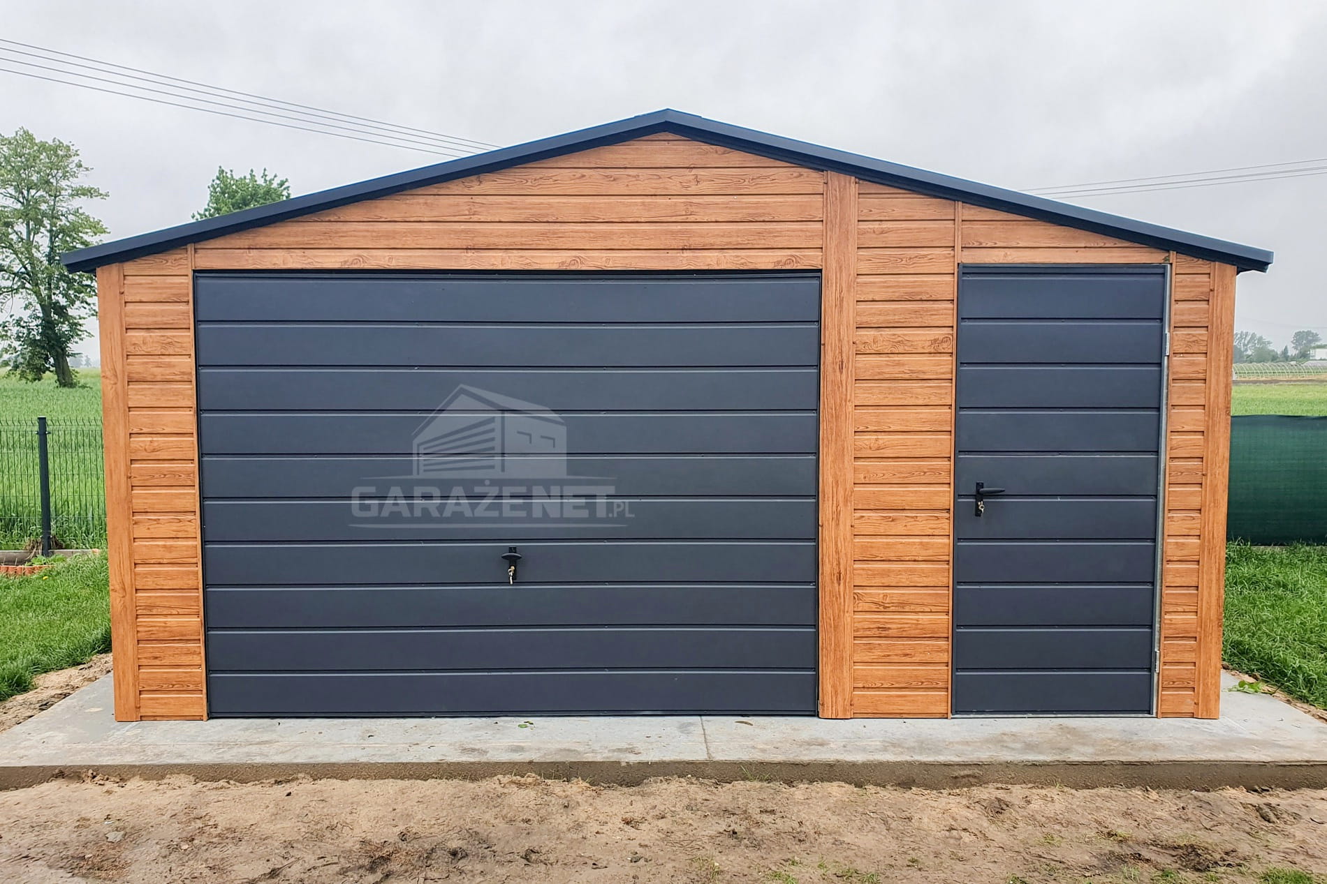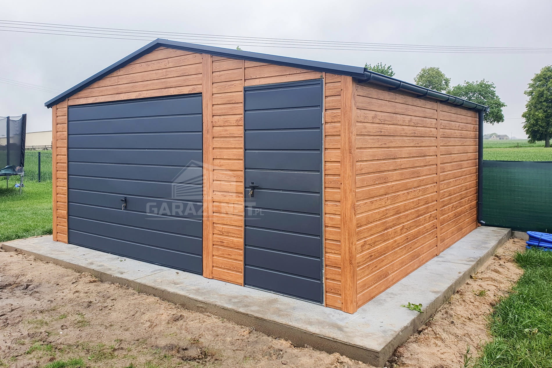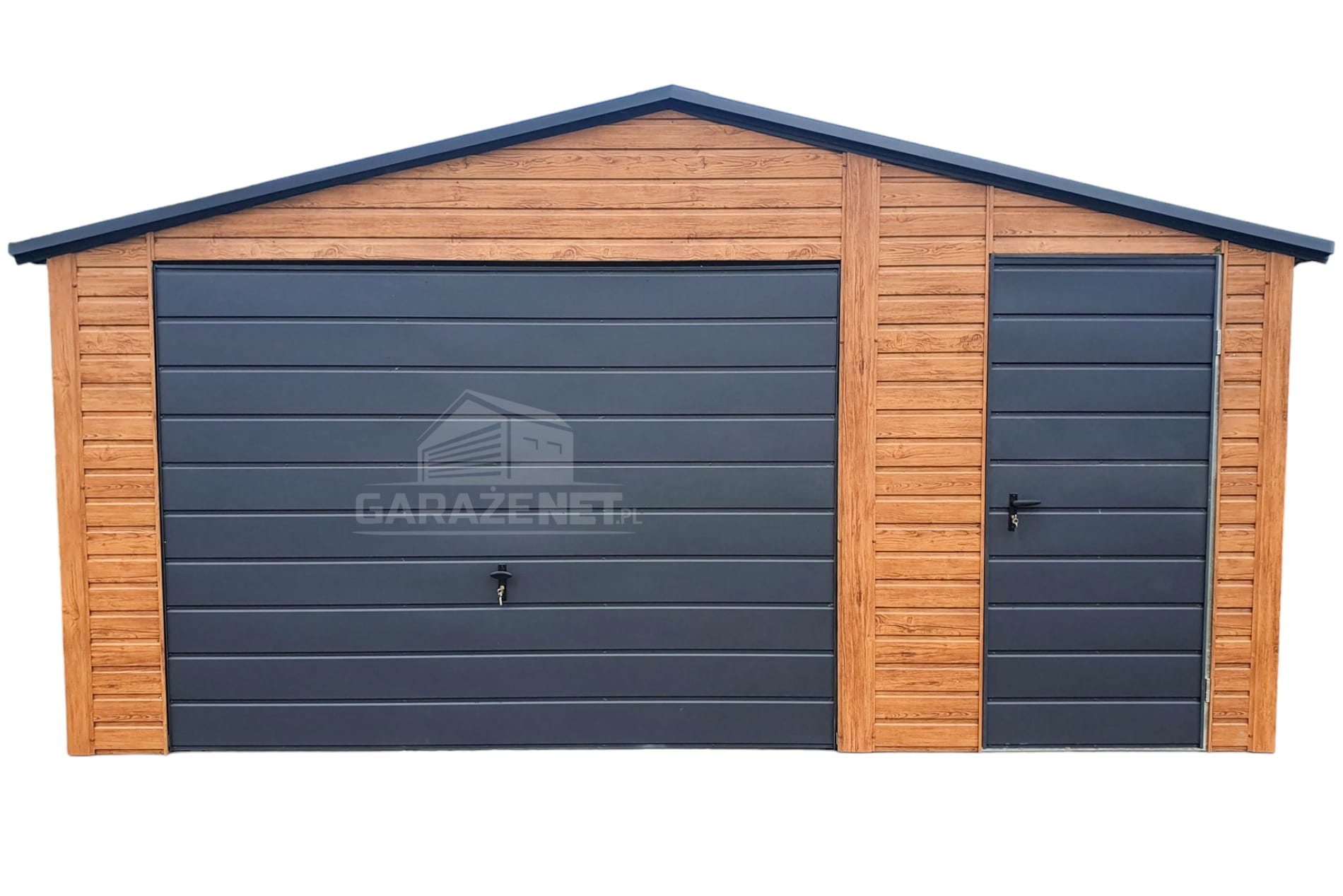 GARAŻ BLASZANY 5,5x6M BRAMA UCHYLNA - DRZWI - JASNY ORZECH - DREWNOPODOBNY - ANTRACYT - RYNNY - DACH DWUSPADOWY GB468
