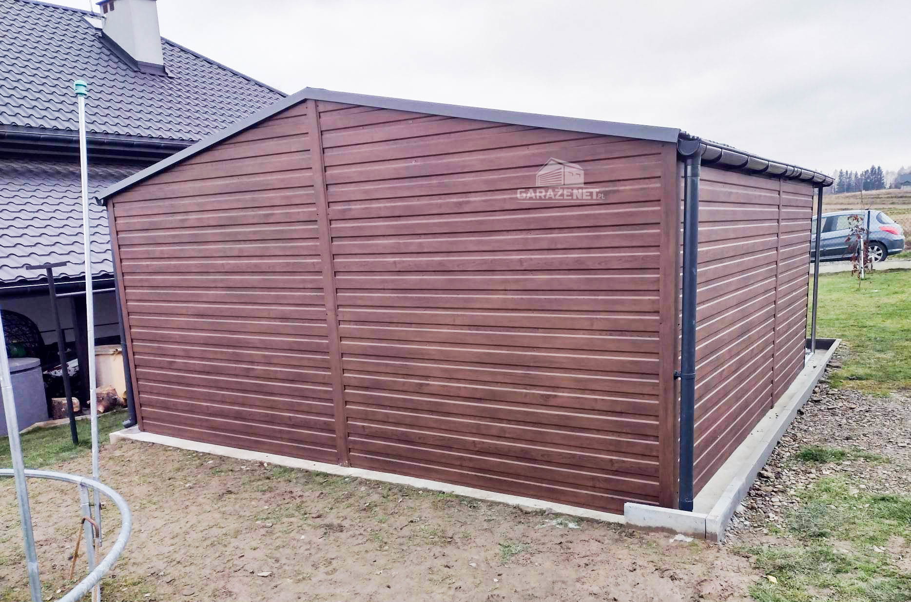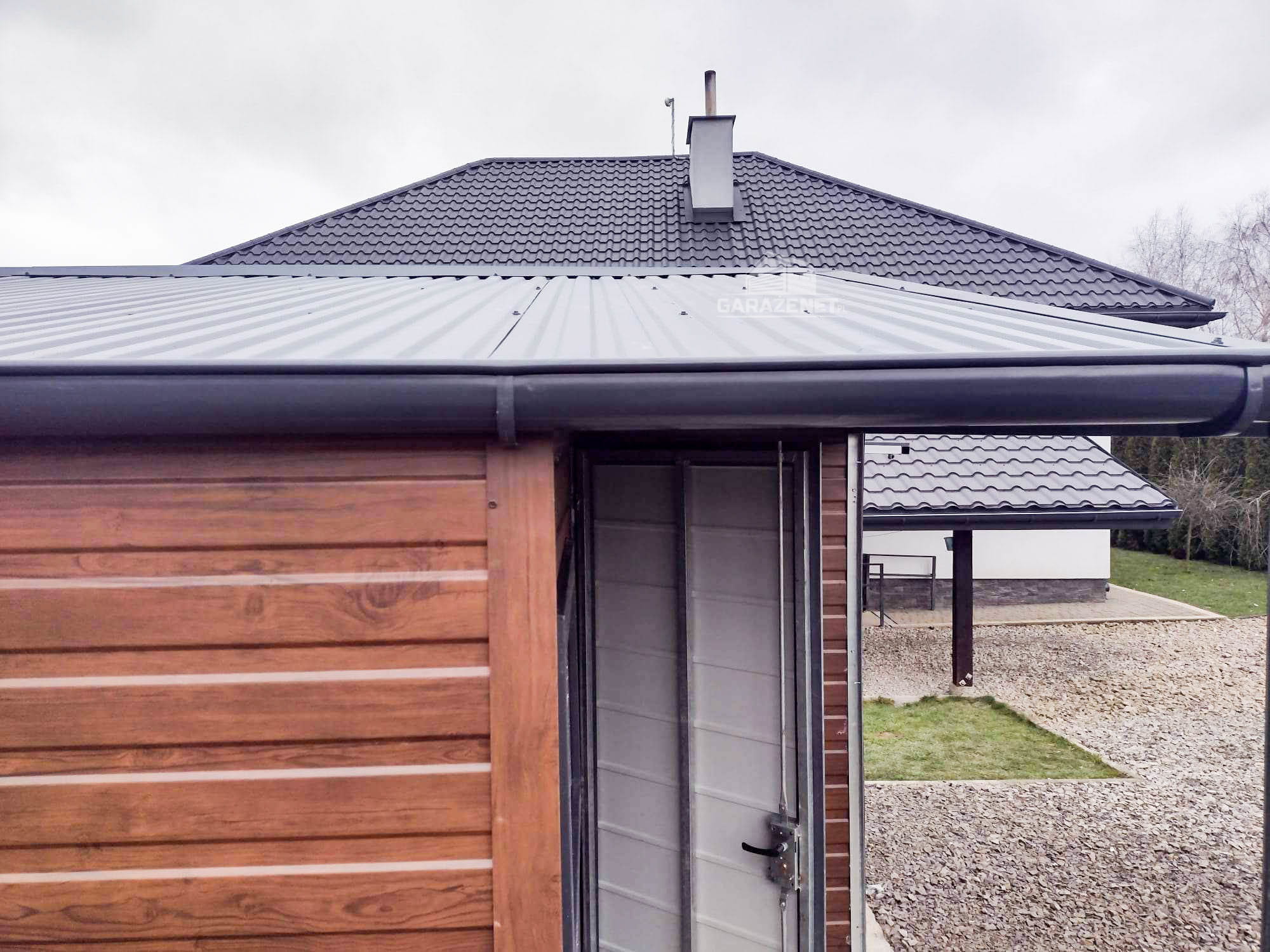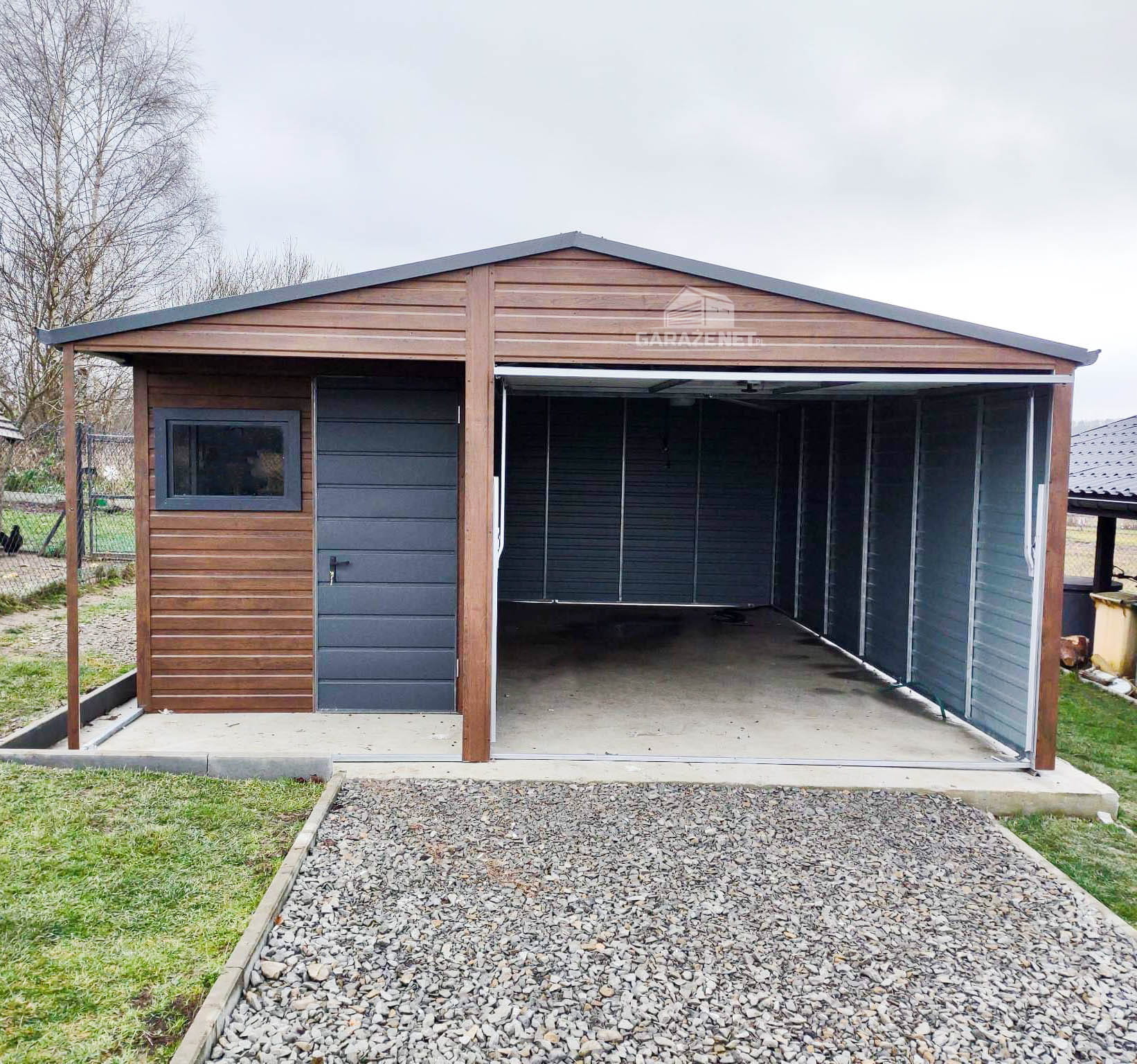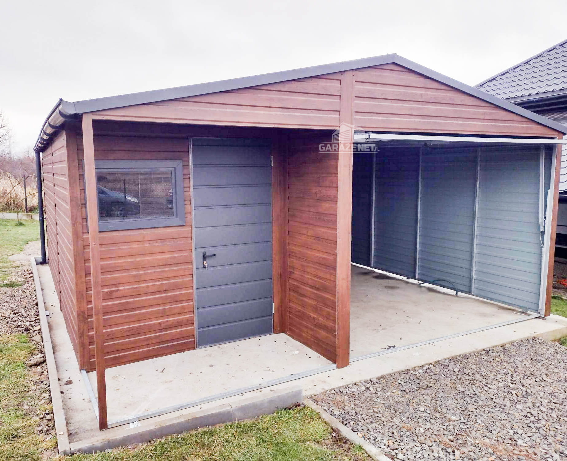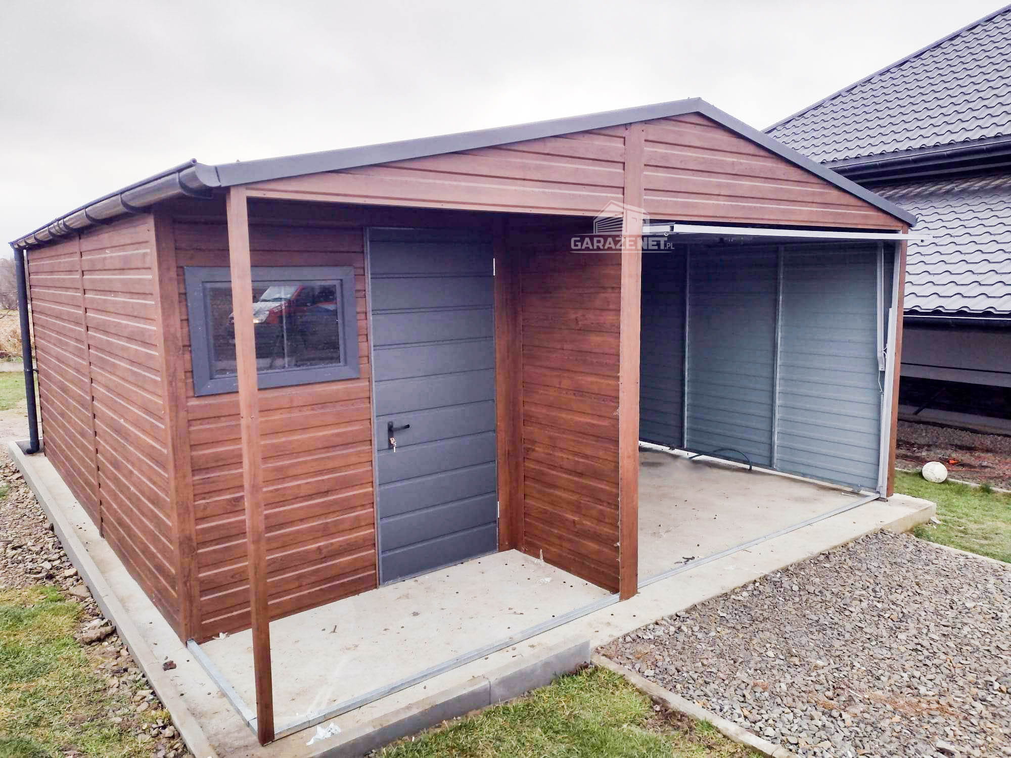 GARAŻ BLASZANY 5M X 6M POZIOM - DWUSPAD BRAMA UCHYLNA + POMIESZCZENIE GOSPODARCZE - CIEMNY ORZECH - DODATKOWE DRZWI GB218