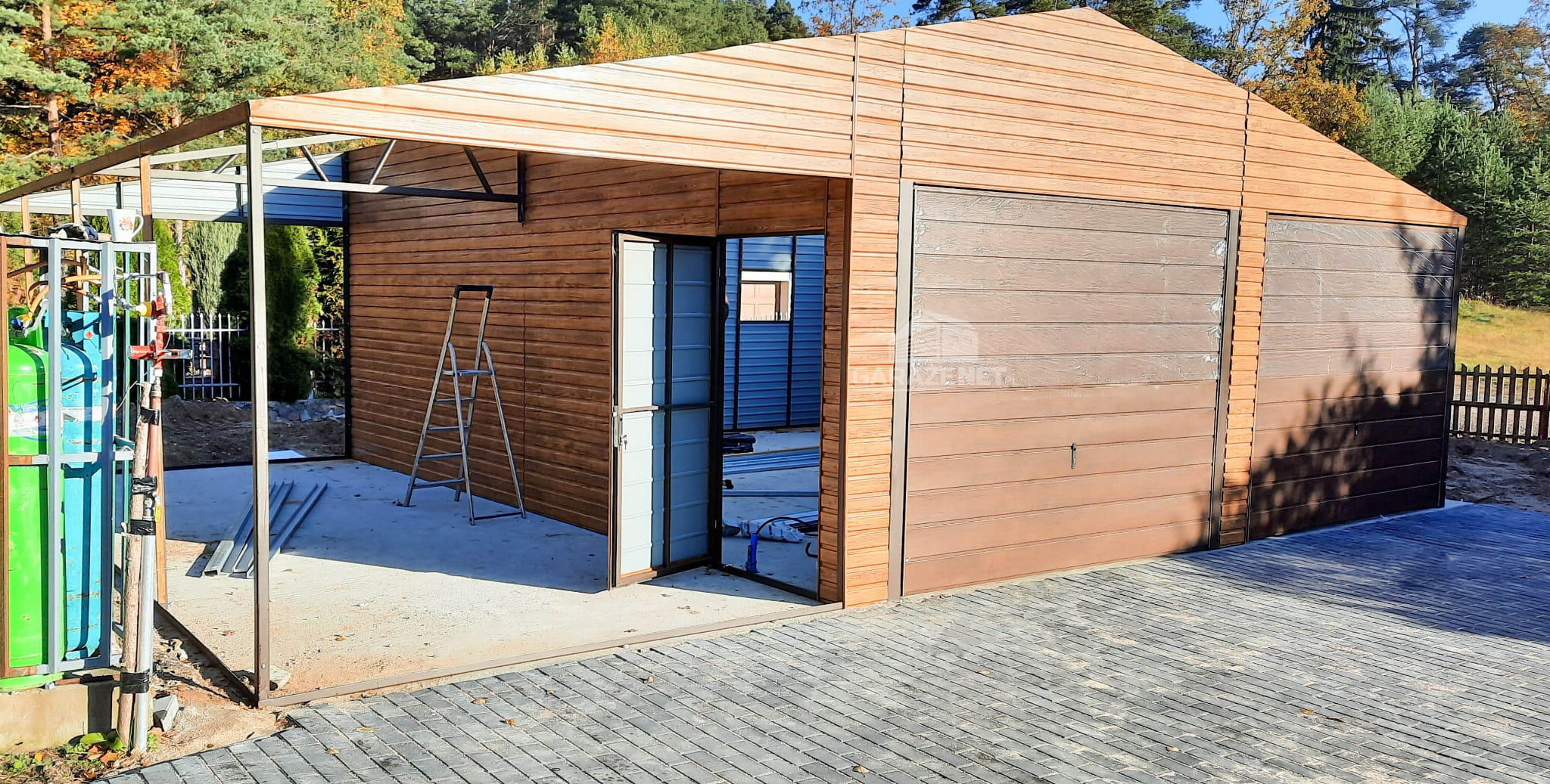GARAŻ BLASZANY 6,5M X 6M + 3M. WIATA - POZIOM - DWUSPAD 2X BRAMA UCHYLNA + DRZWI + 2X OKNO - DREWNOPODOBNY 6,5X6 GB242