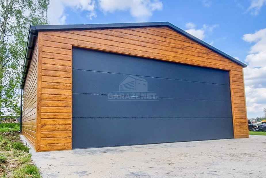 GARAŻ BLASZANY 6,5X6M - BRAMA SEGMENTOWA - DRZWI - OKNO - RYNNY - JASNY ORZECH - DREWNOPODOBNY - ANTRACYT - DACH DWUSPADOWY TS753