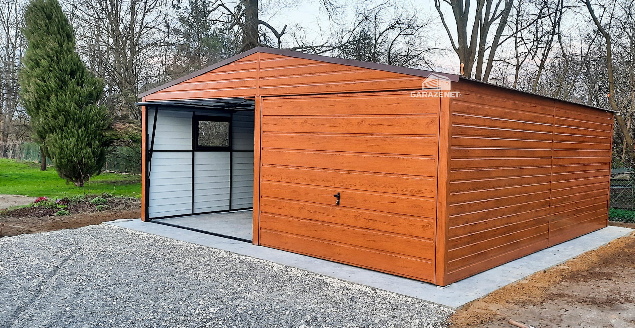 GARAŻ BLASZANY 6M X 5,5M POZIOM - DWUSPAD 2X BRAMA UCHYLNA + OKNO DREWNOPODOBNY 6X5,5 GB221