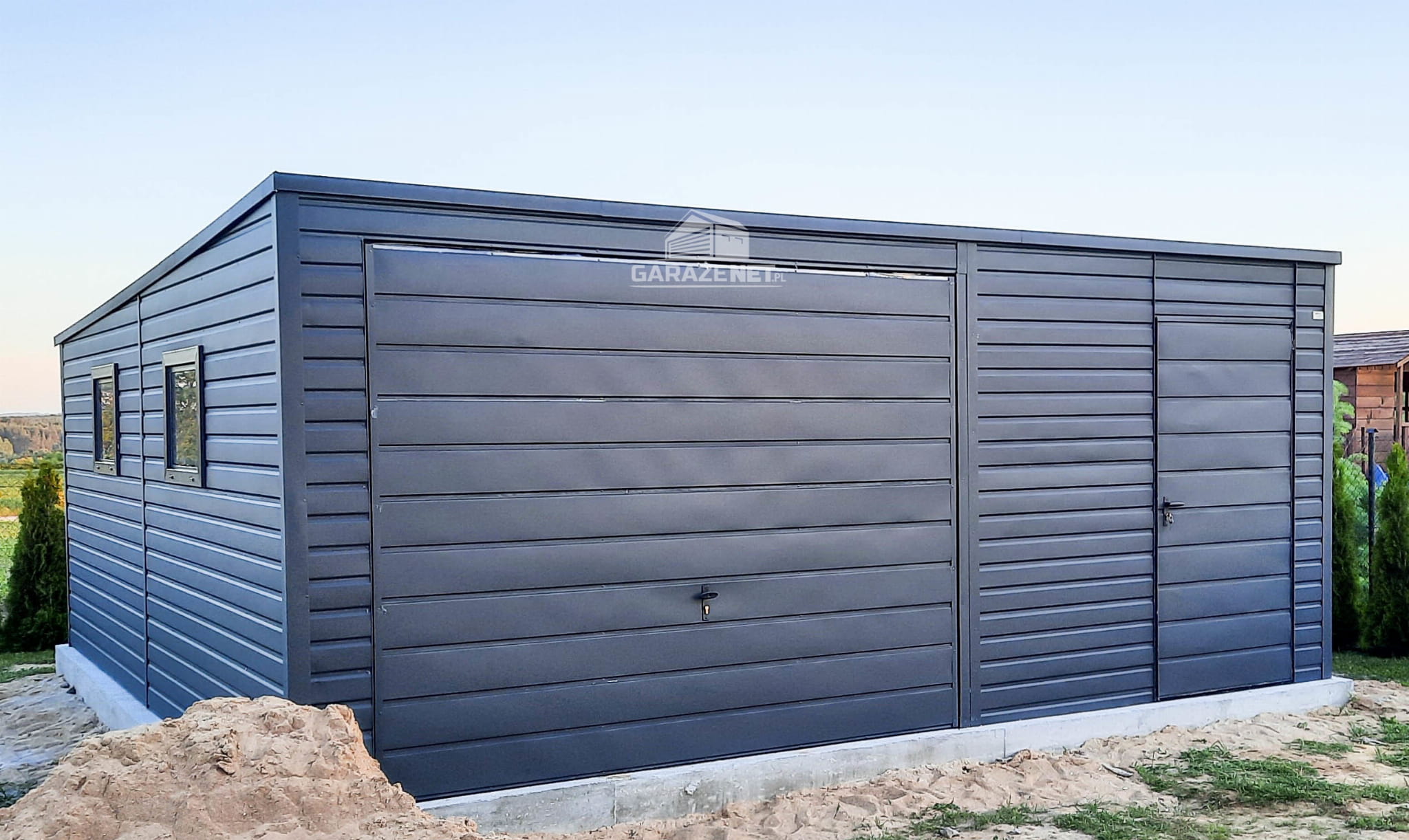 GARAŻ BLASZANY 6M X 5,80M POZIOM - SPAD TYŁ - BRAMA UCHYLNA + DRZWI + 2X OKNO - ANTRACYT GRAFIT GB253