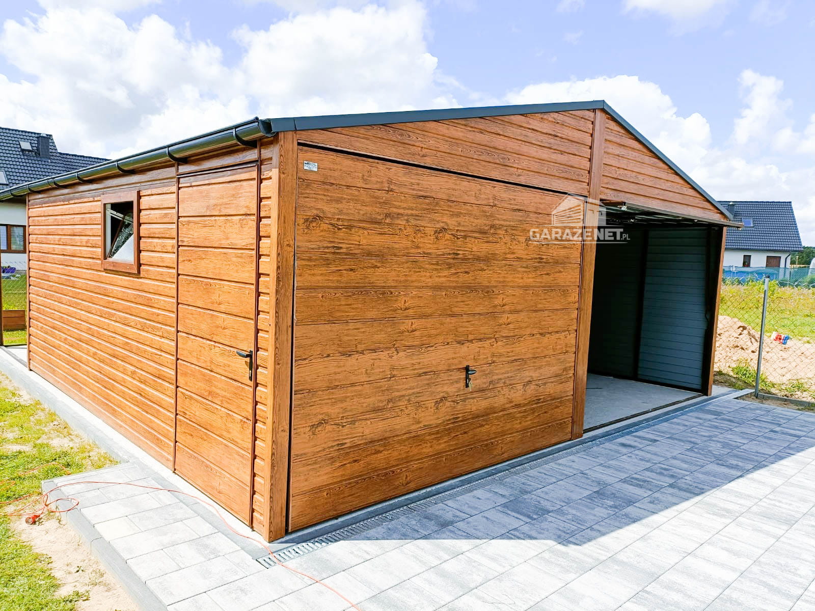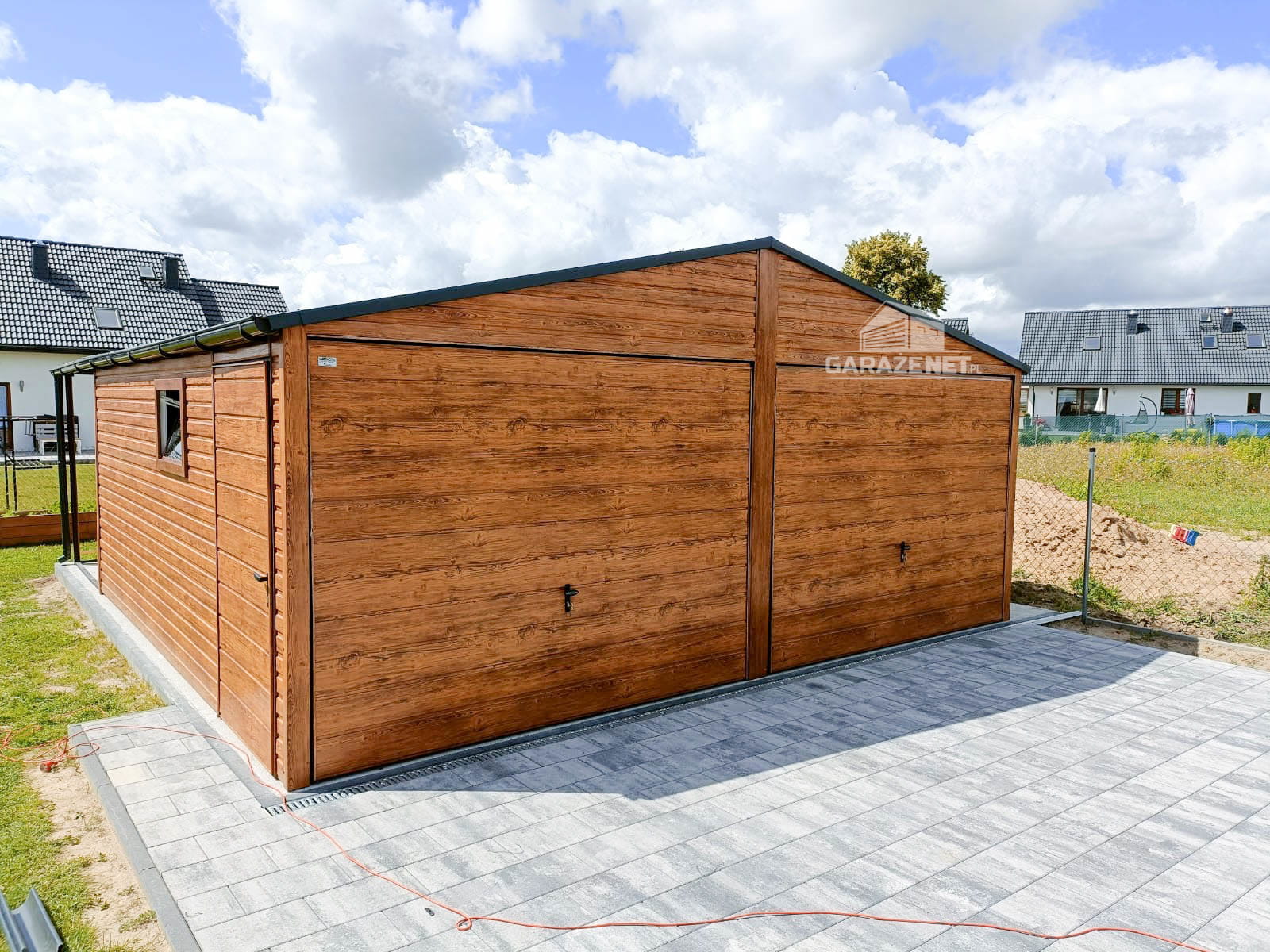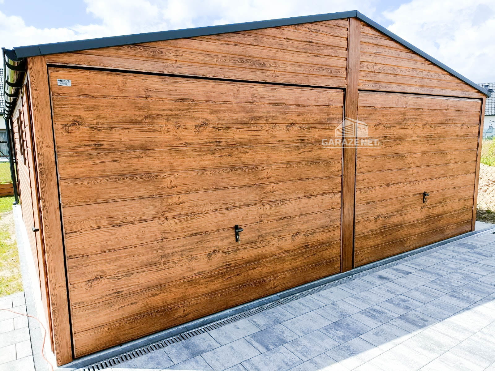 GARAŻ BLASZANY 6M X 5M POZIOM - DWUSPAD 2X BRAMA - JASNY ORZECH - WIATA - DRZWI - OKNO PCV 6X5 GB225