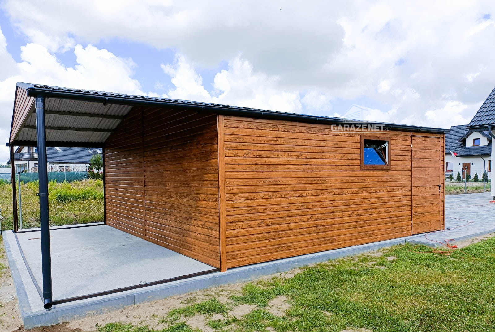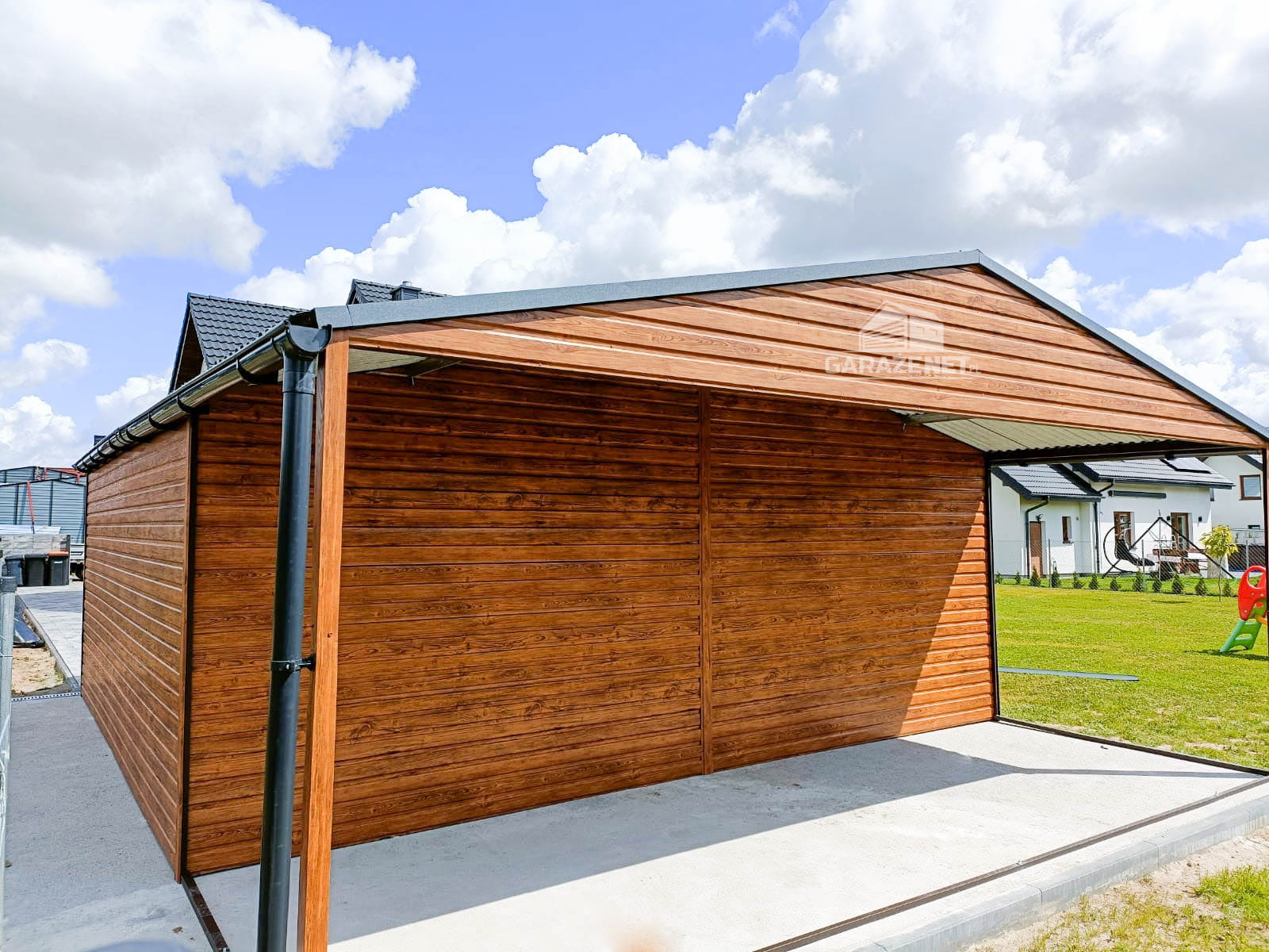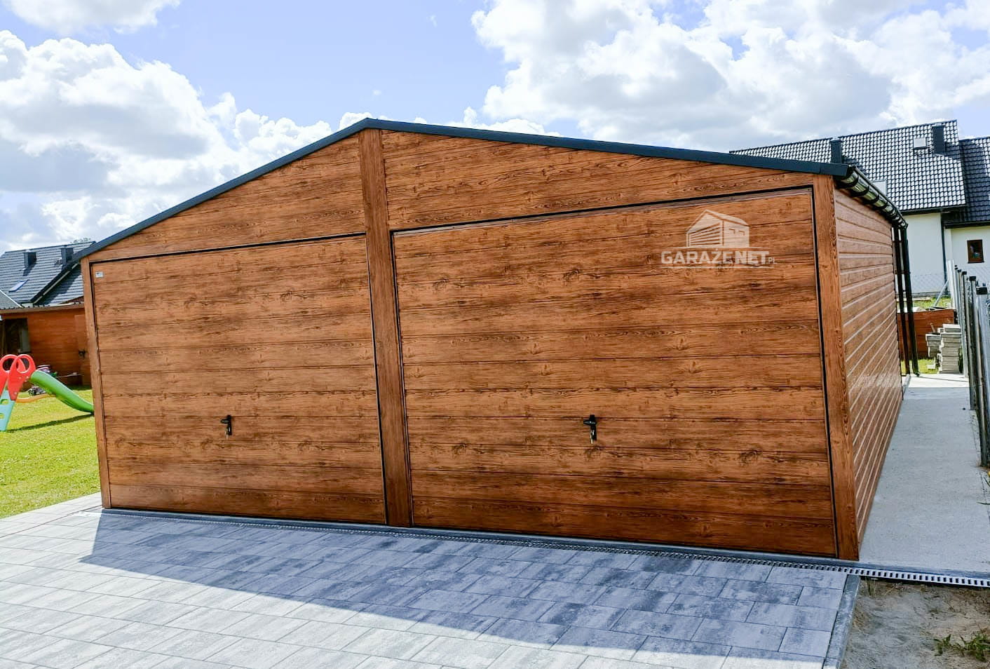 GARAŻ BLASZANY 6M X 5M POZIOM - DWUSPAD 2X BRAMA - JASNY ORZECH - WIATA - DRZWI - OKNO PCV 6X5 GB225