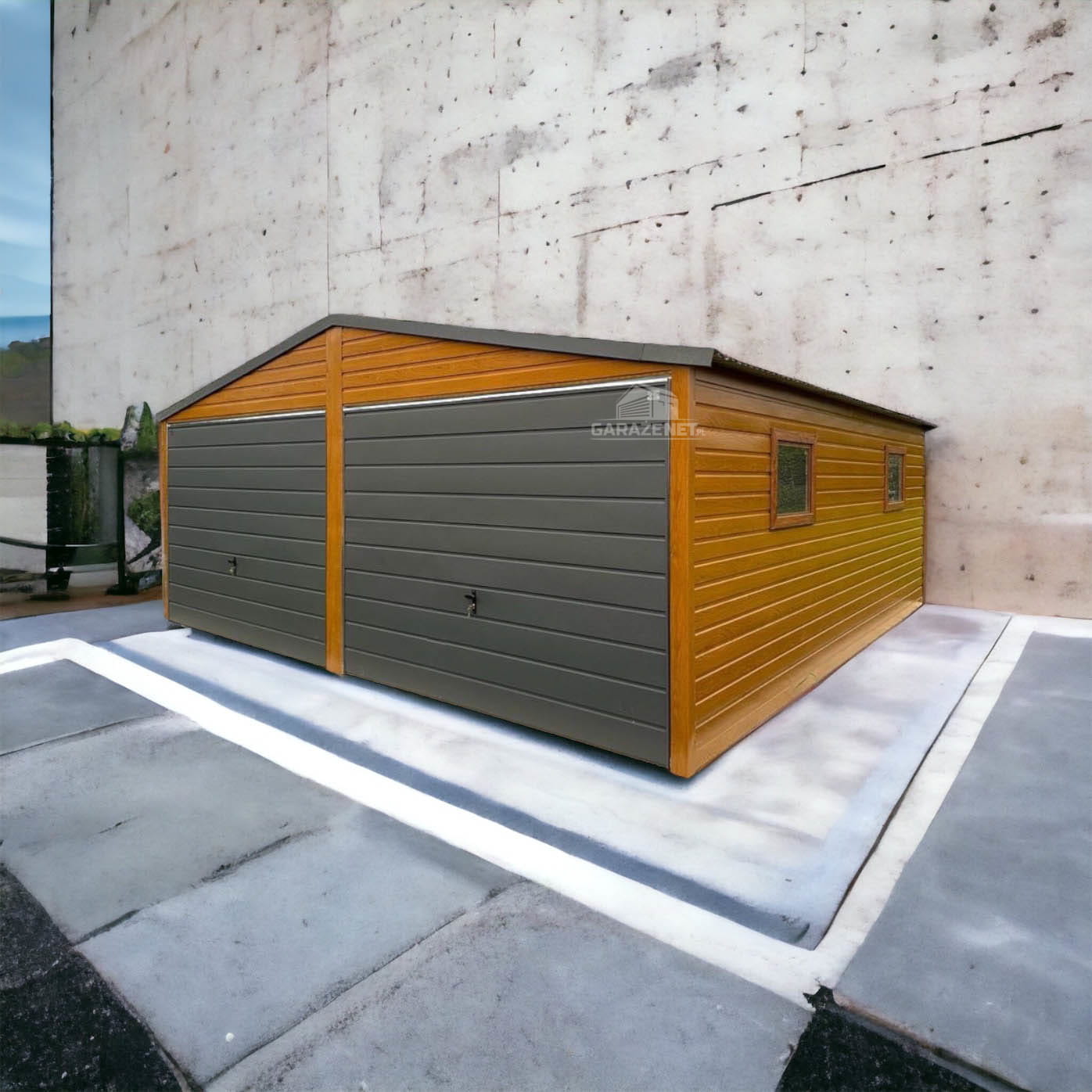 GARAŻ BLASZANY 6M X 6M POZIOM - DWUSPAD - 2X BRAMA + DRZWI + 2X OKNO - ZŁOTY DĄB DREWNOPODOBNY + ANTRACYT 6X6 GB287