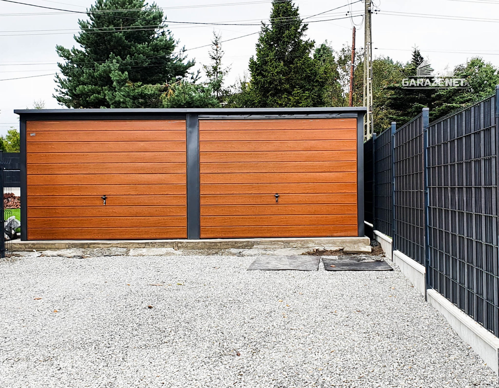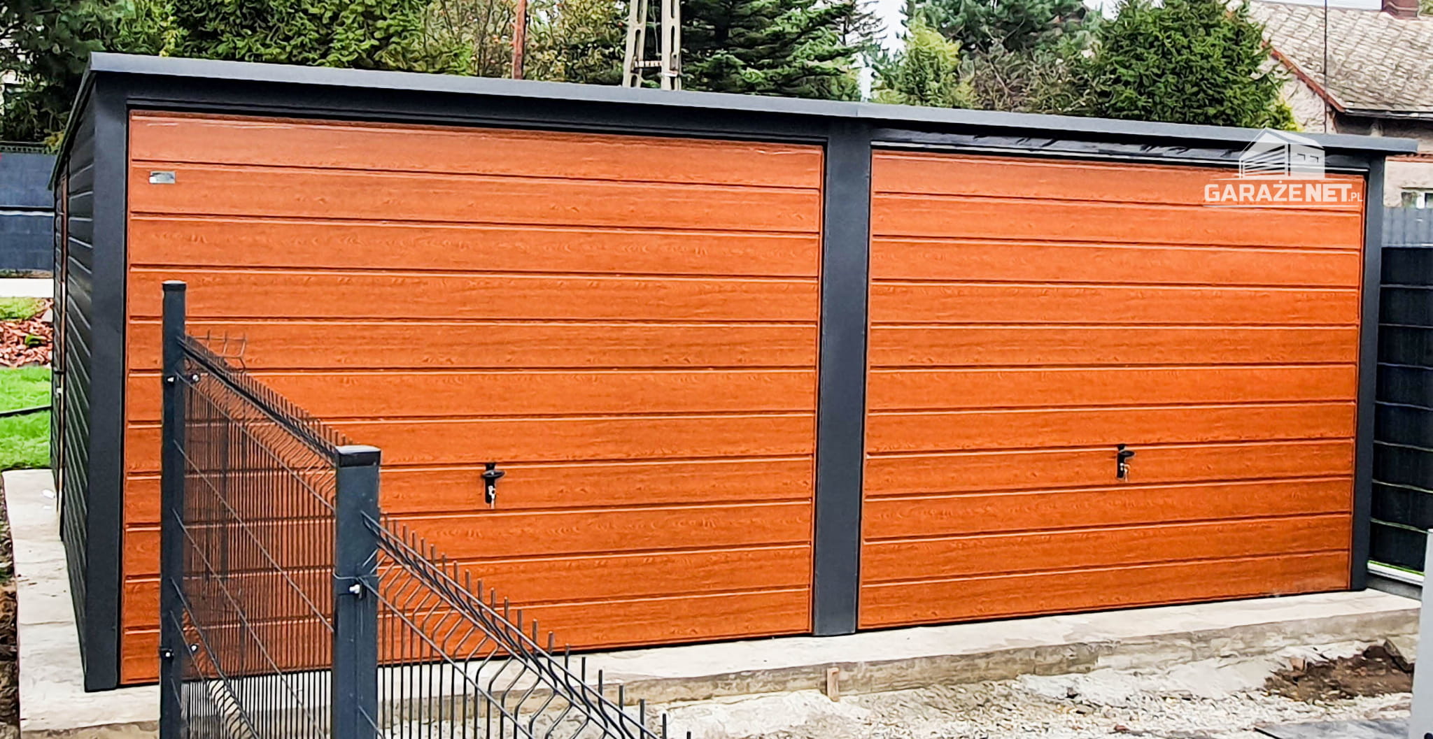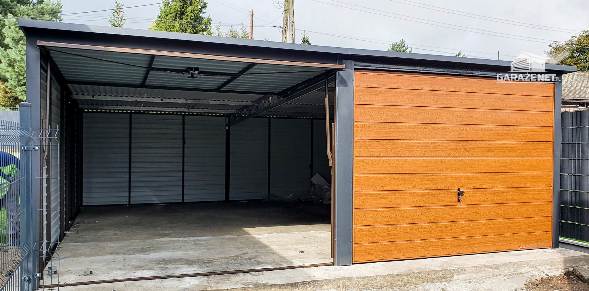 GARAŻ BLASZANY 6M X 6M SPAD TYŁ - 2X BRAMA UCHYLNA - ZŁOTY DĄB + ANTRACYT 6X6 GB205