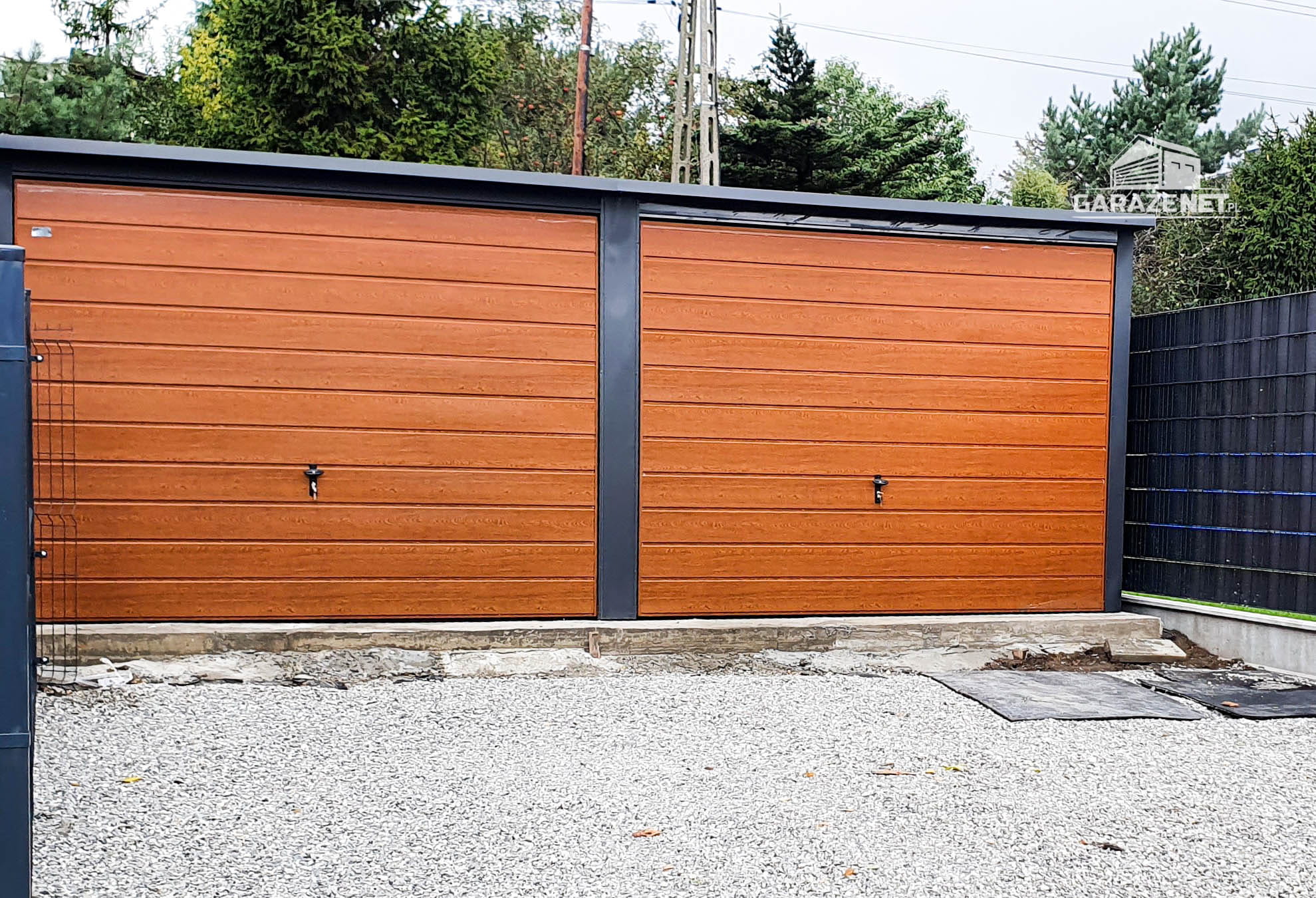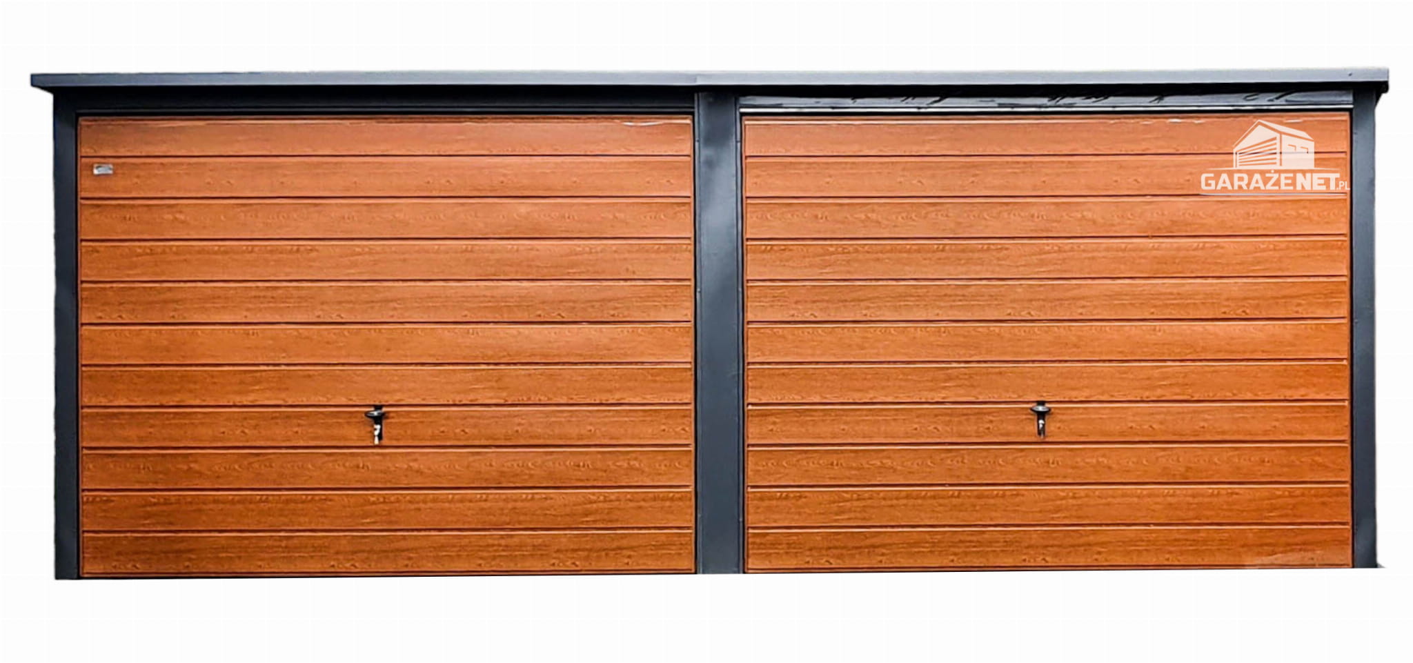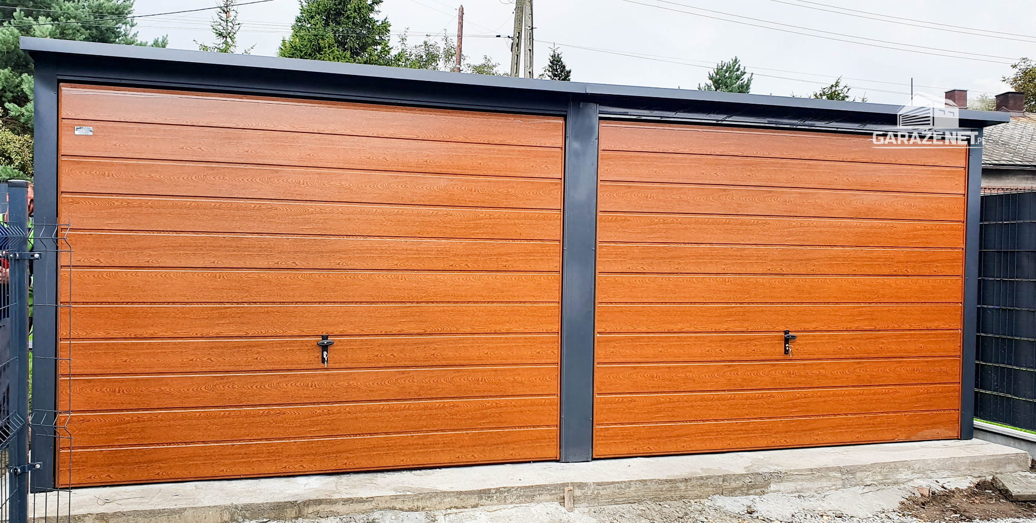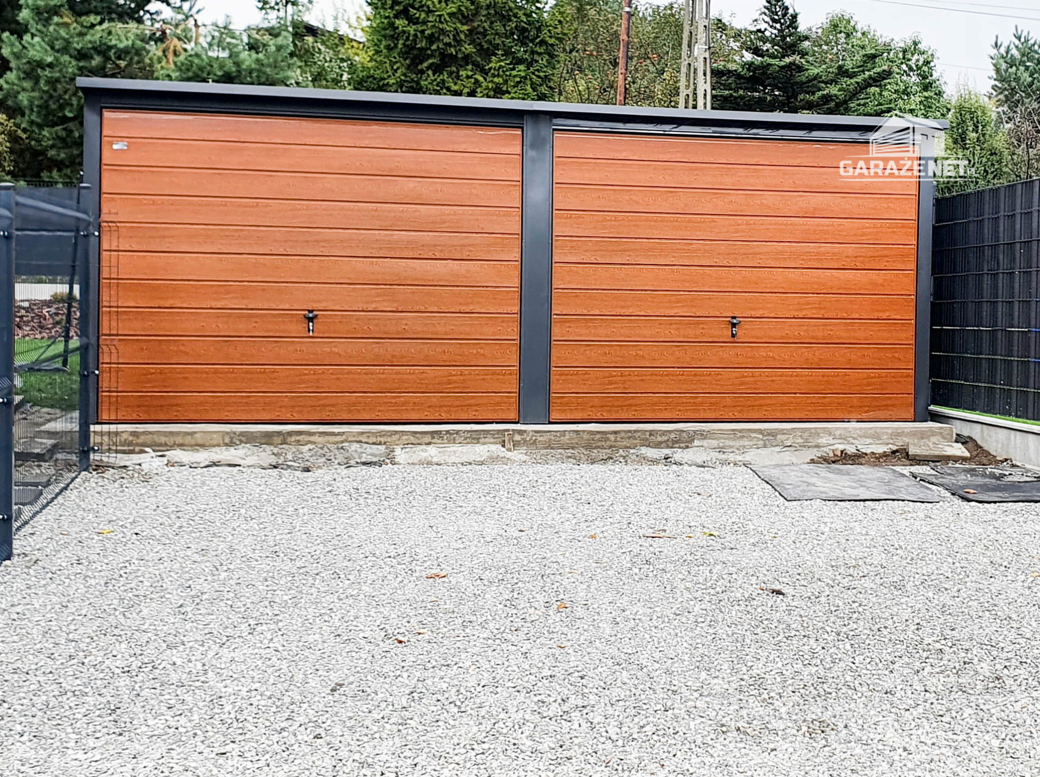 GARAŻ BLASZANY 6M X 6M SPAD TYŁ - 2X BRAMA UCHYLNA - ZŁOTY DĄB + ANTRACYT 6X6 GB205