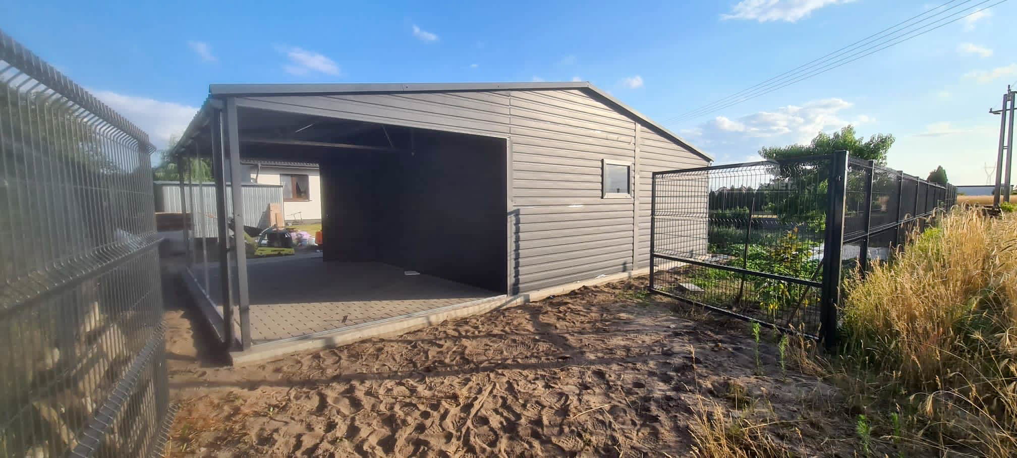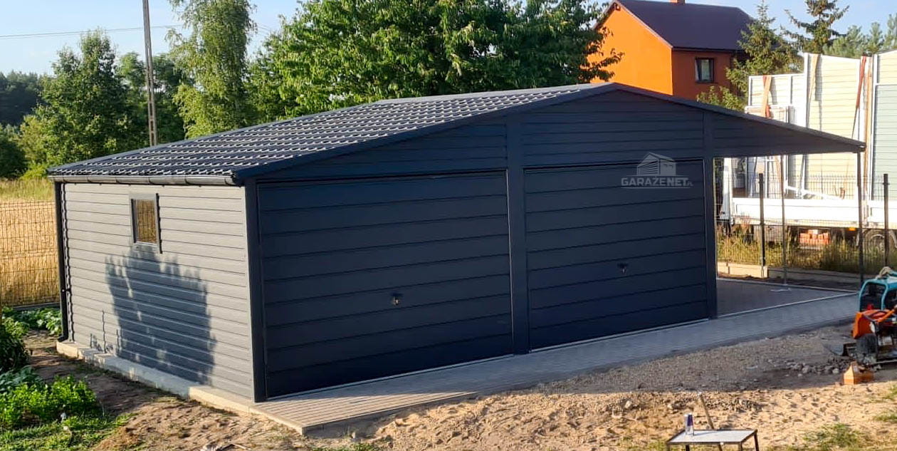GARAŻ BLASZANY 6M X 6M + WIATA 3M - DWUSPAD - 2X BRAMA + 2X OKNO + DRZWI - RYNNY - BLACHODACHÓWKA ANTRACYT 6X6 GB308
