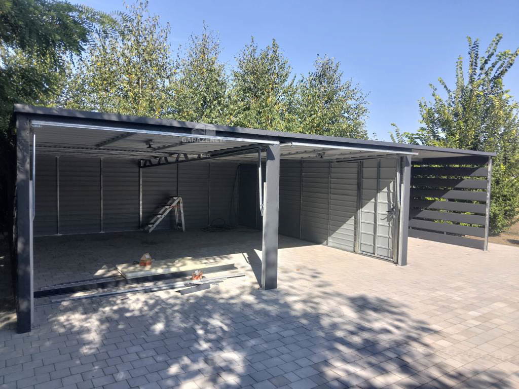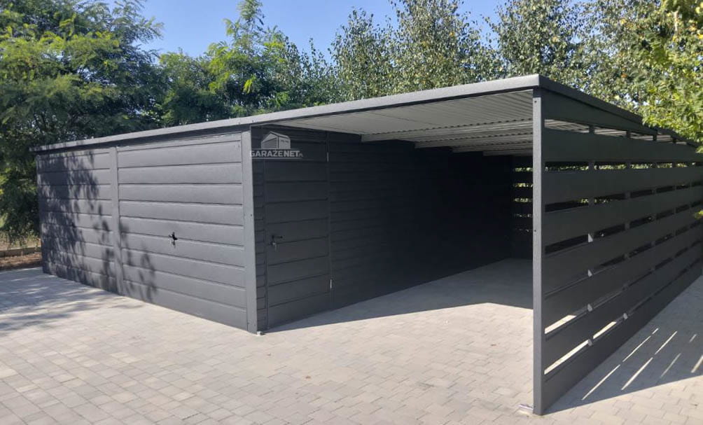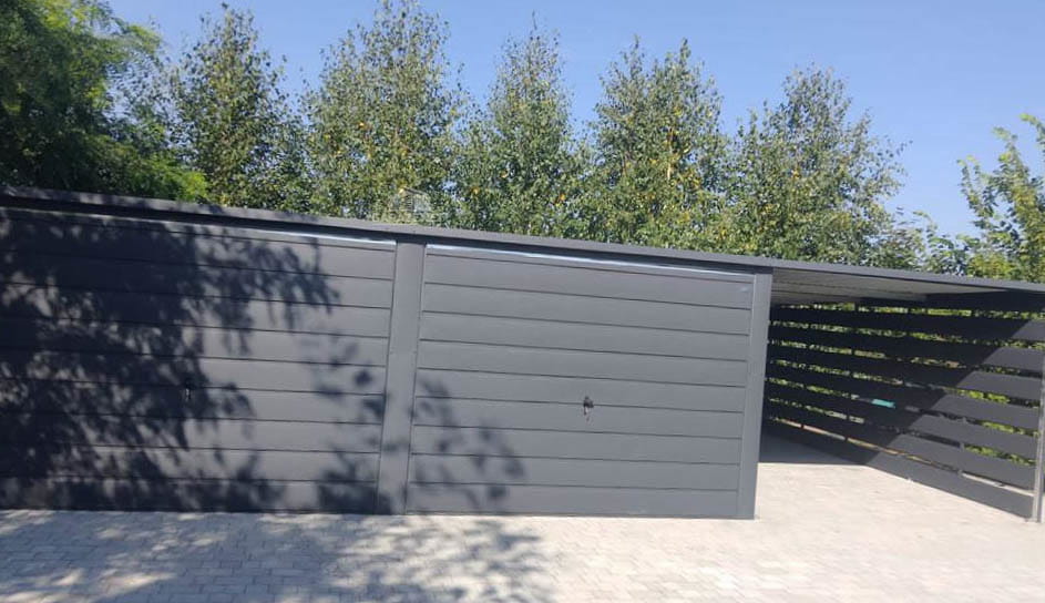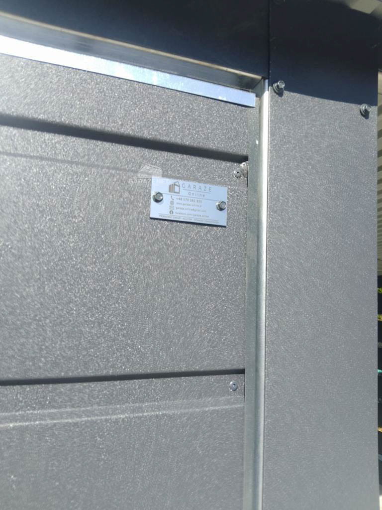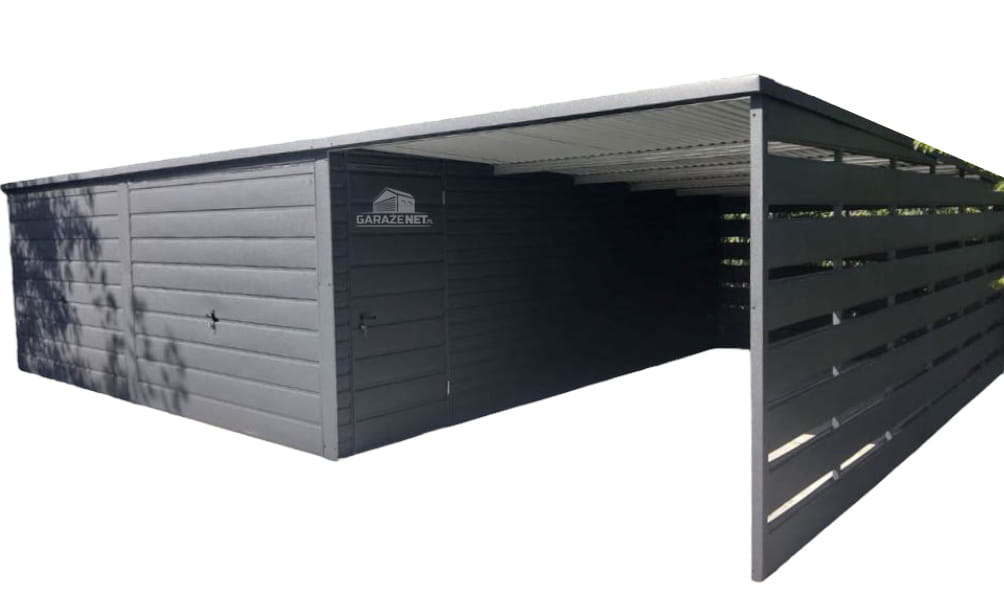 GARAŻ BLASZANY 6M X 6M - WIATA 3M - SPAD TYŁ - 2X BRAMA UCHYLNA + DRZWI - ANTRACYT 6X6 GB335