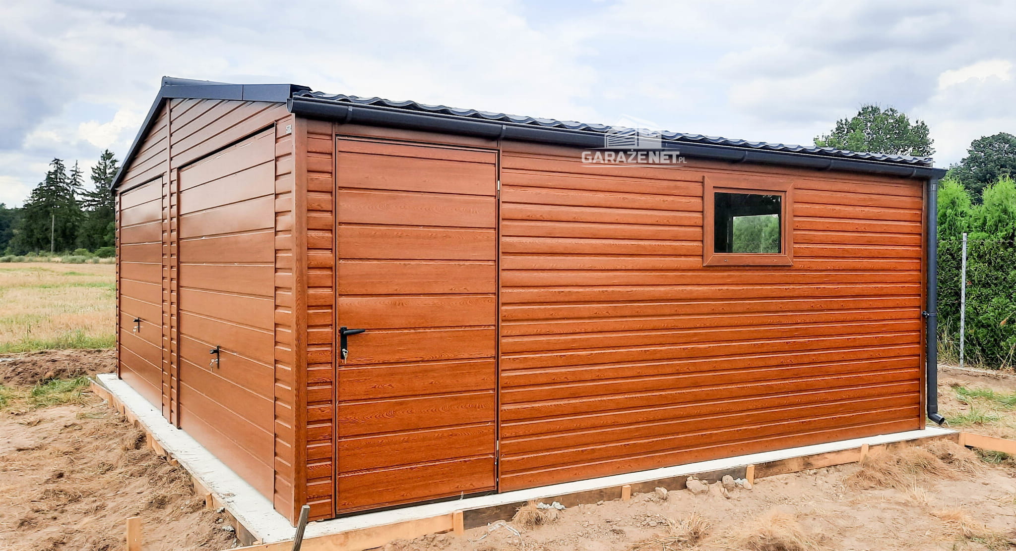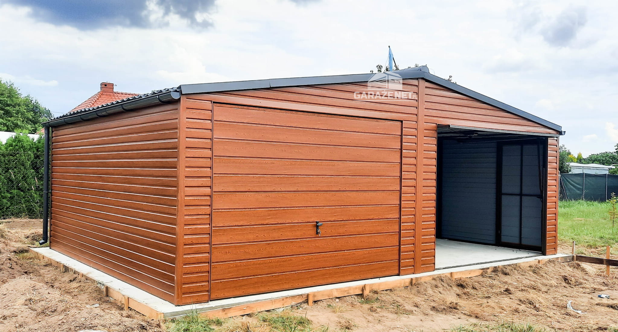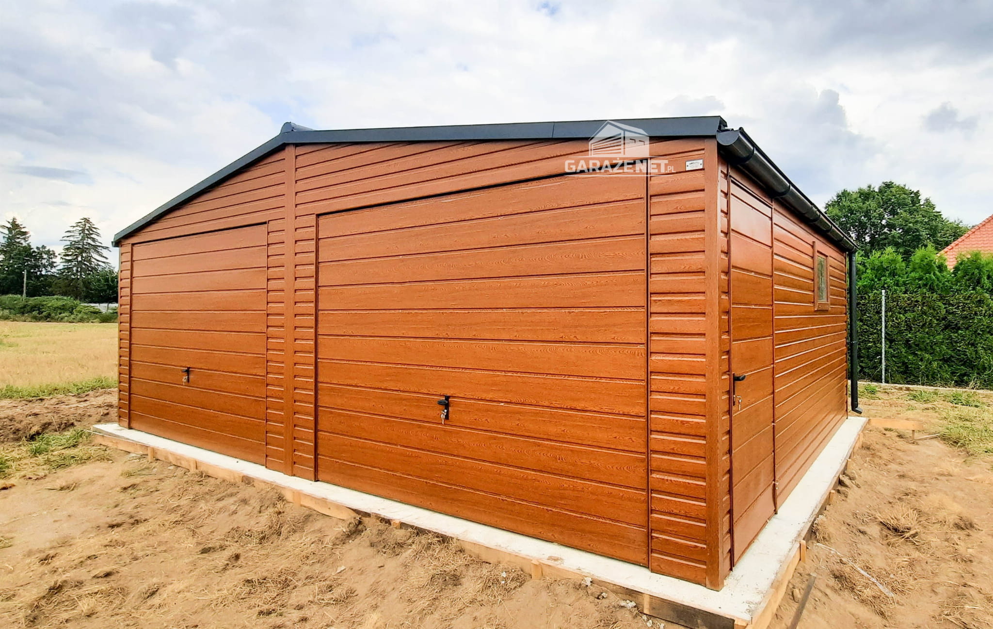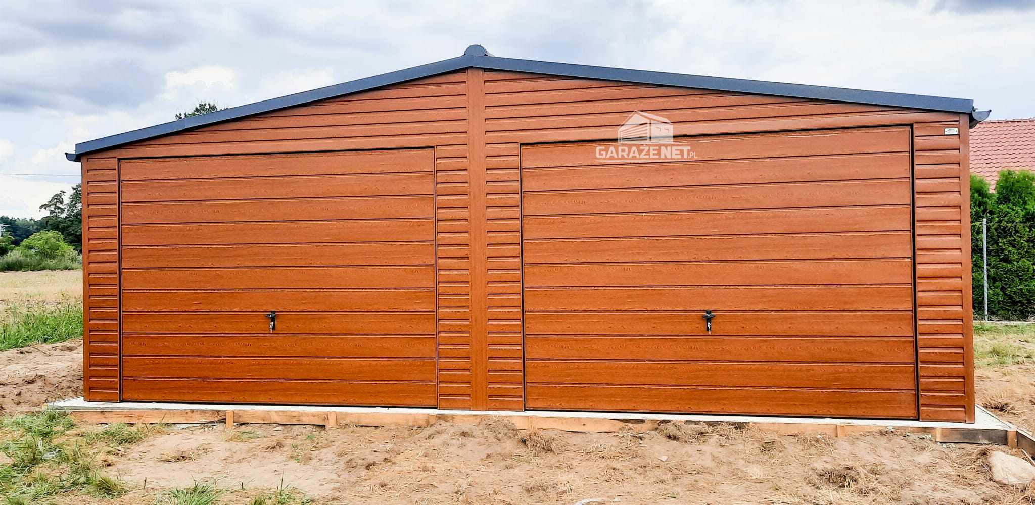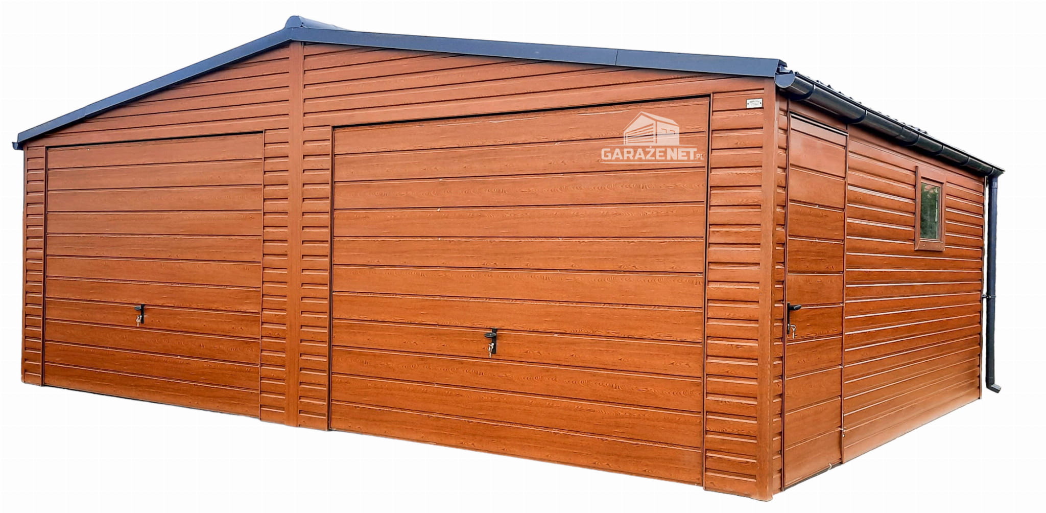 GARAŻ BLASZANY 7M X 6M POZIOM - DWUSPAD 2X BRAMA + DODATKOWE DRZWI - DREWNOPODOBNY 7X6 GB235