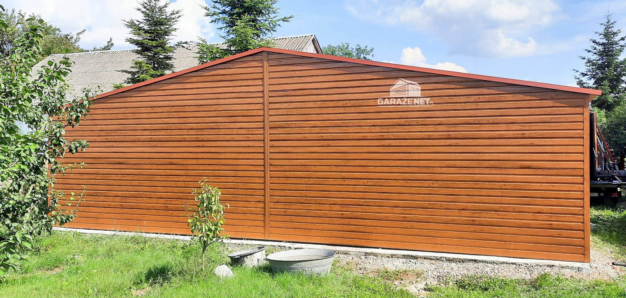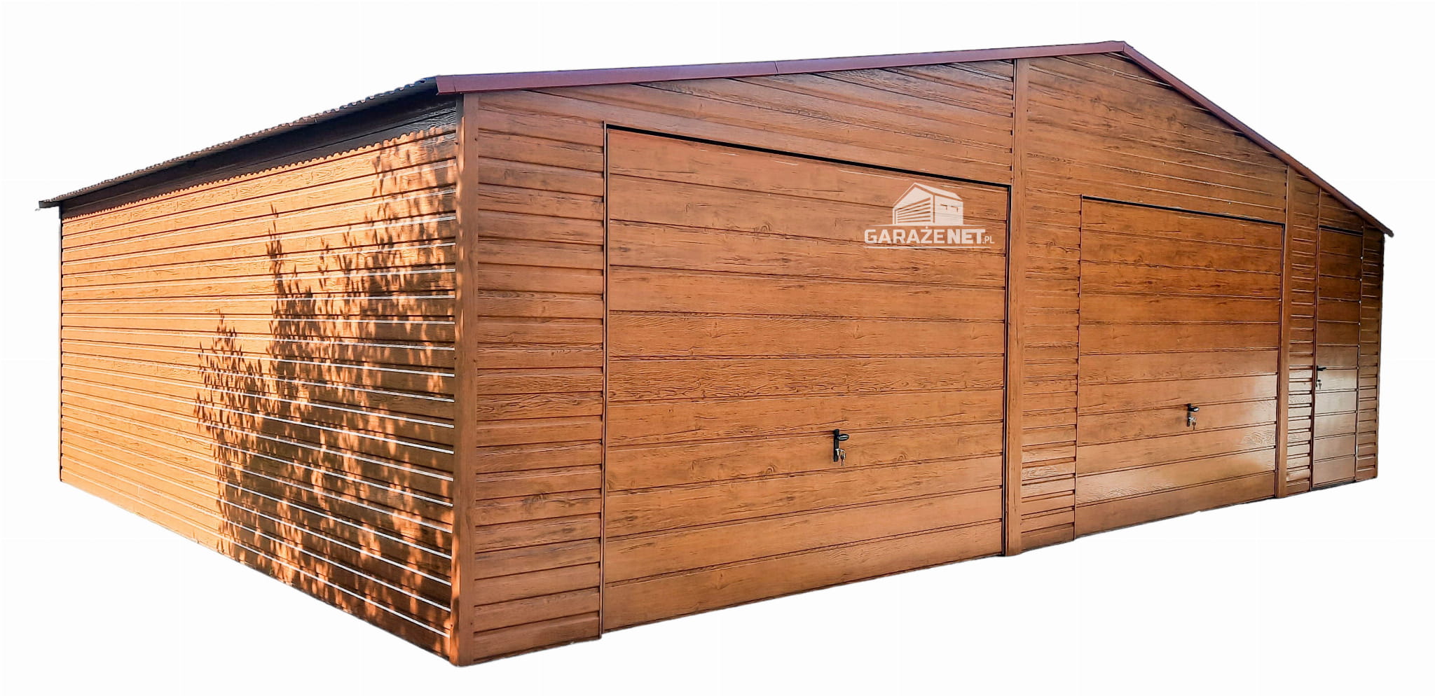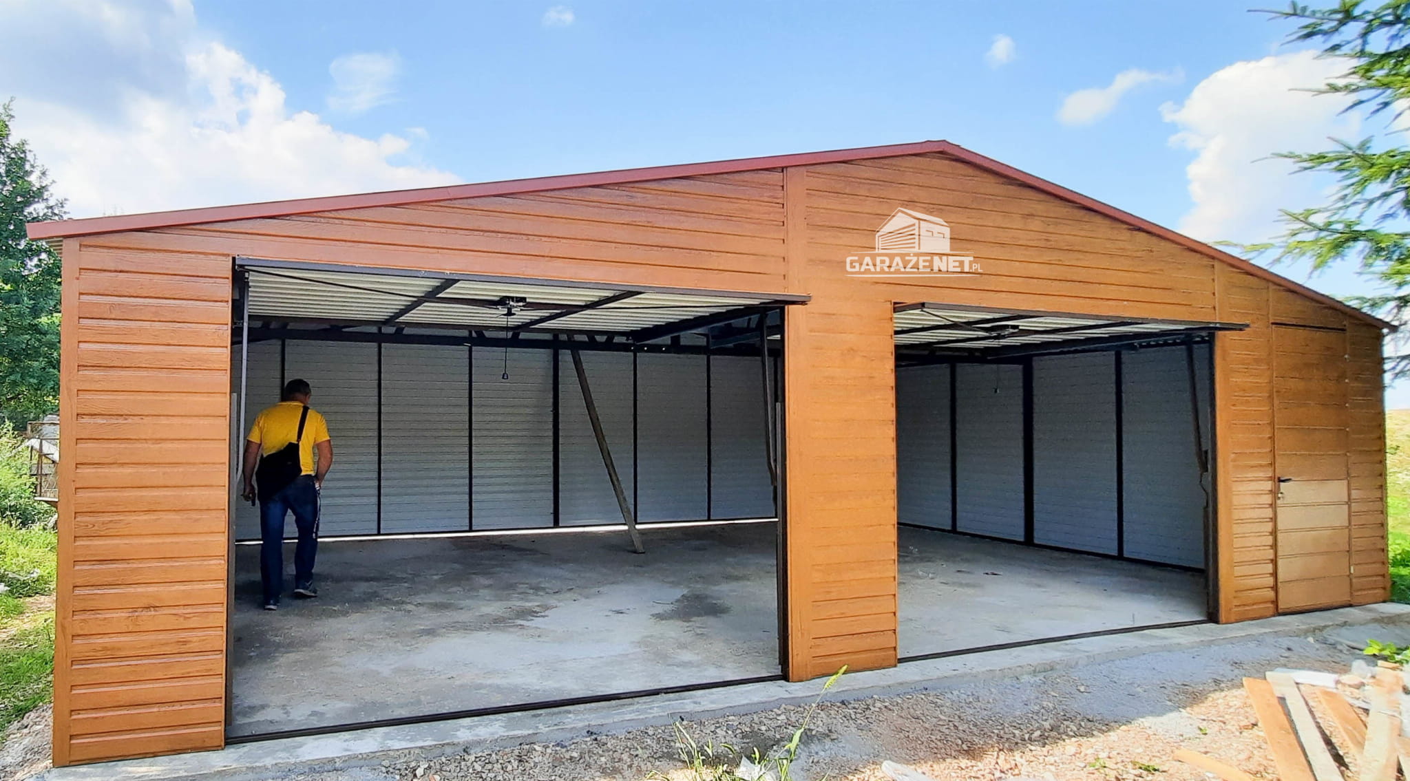 GARAŻ BLASZANY 9m x 6m poziom - dwuspad 2x Brama + drzwi - jasny orzech 9x6 GB238