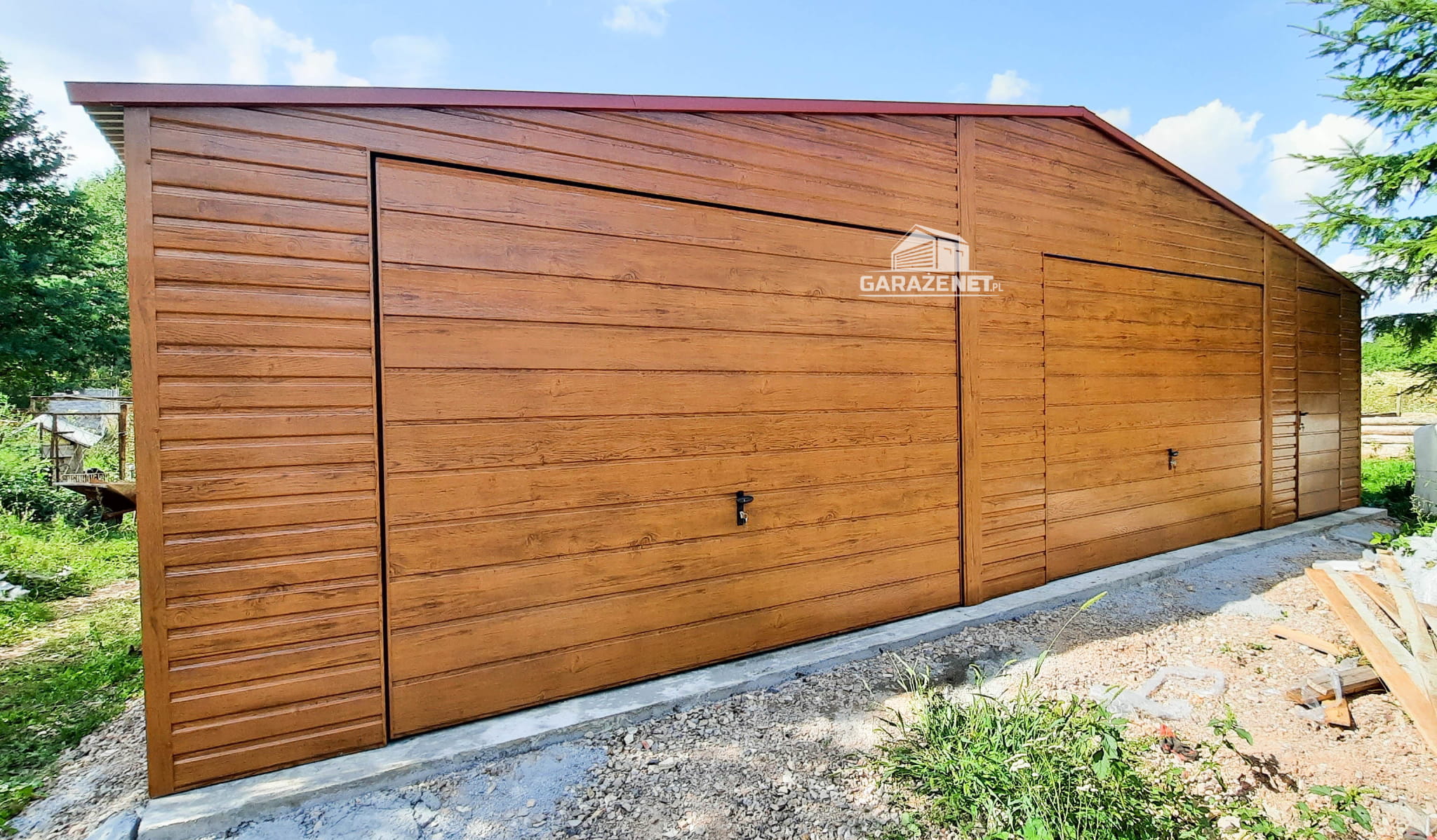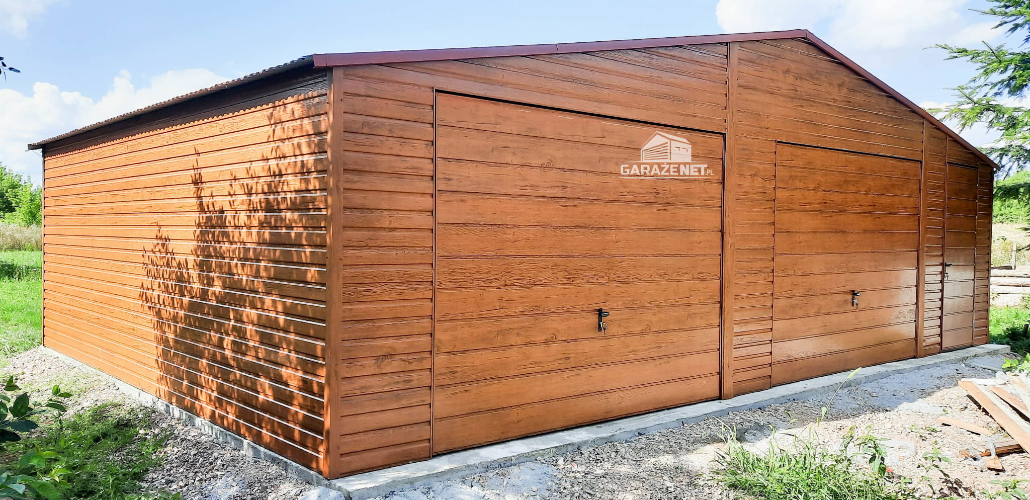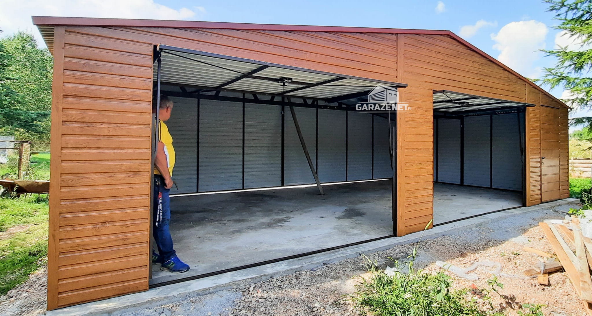 GARAŻ BLASZANY 9m x 6m poziom - dwuspad 2x Brama + drzwi - jasny orzech 9x6 GB238