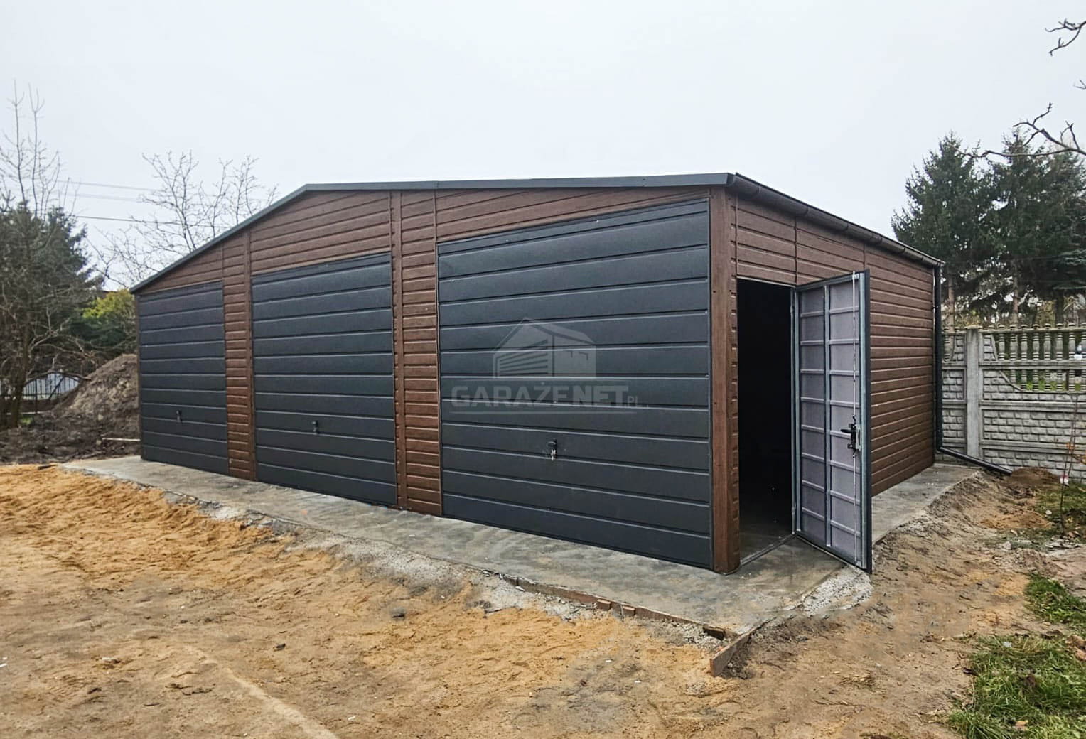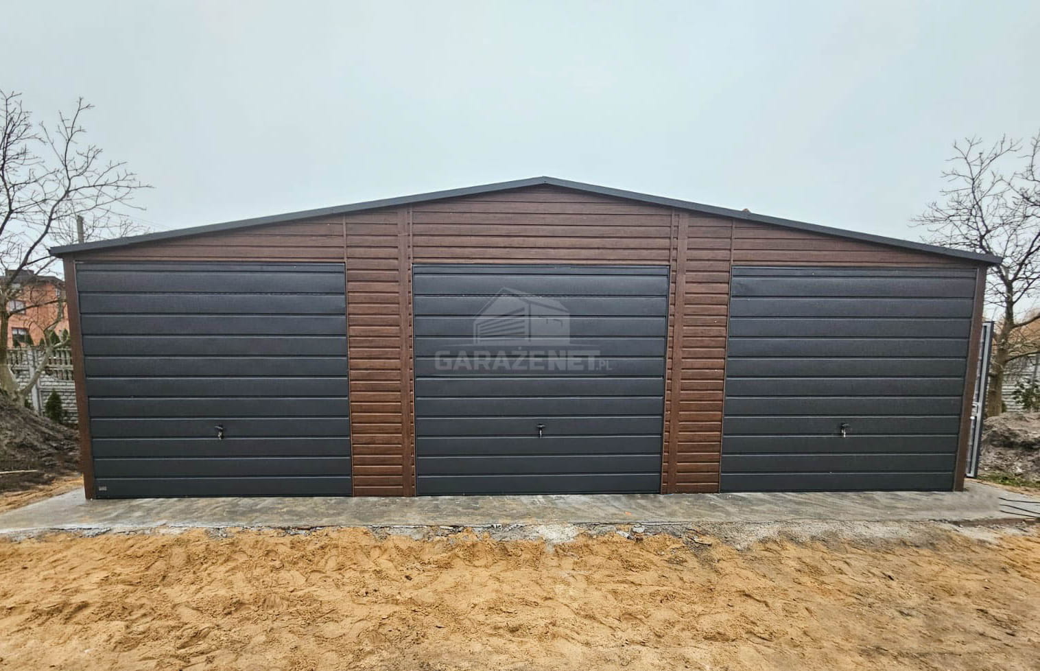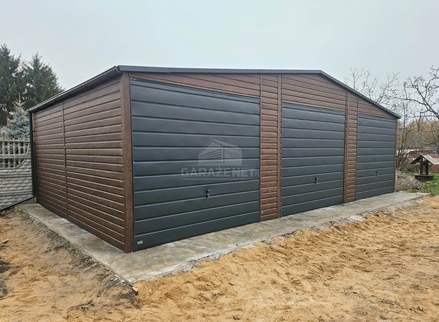 GARAŻ BLASZNY 10,5XM6 - 3X BRAMA UCHYLNA - DRZWI - CIEMNY ORZECH - DREWNOPODOBNY - ANTRACYT - RYNNY - DACH DWUSPADOWY TS877