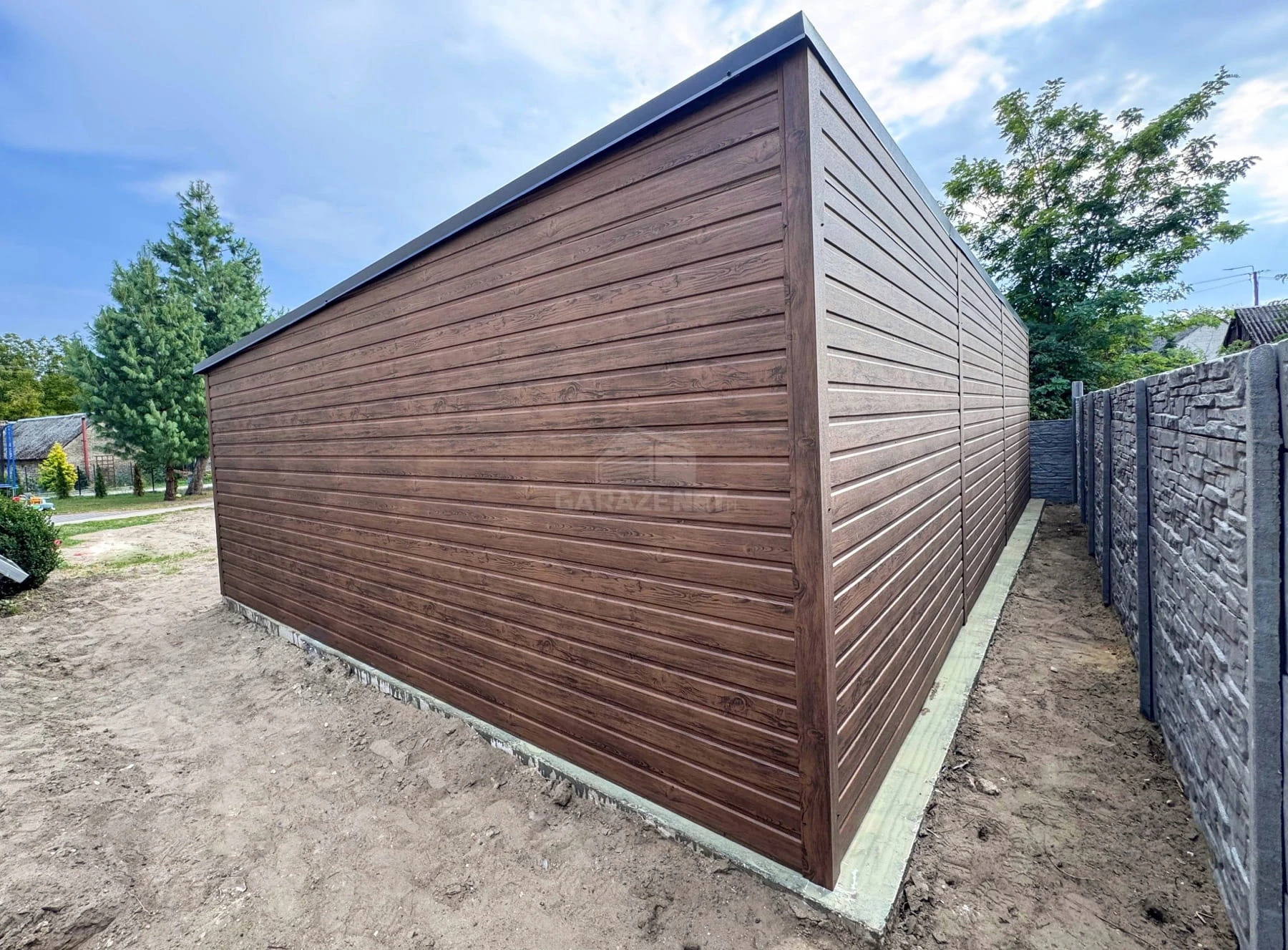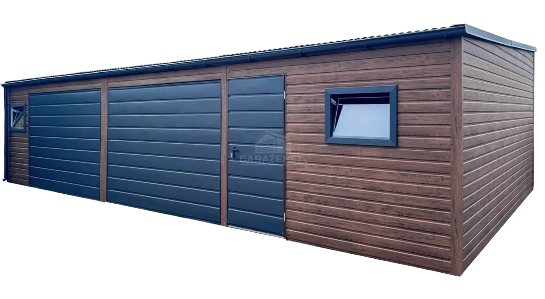 GARAŻ BLASZNY 10X3M – 2X BRAMA – DRZWI – 2X OKNO – CIEMNY ORZECH – DREWNOPODOBNY – ANYTRACYT – RYNNA– DACH SPAD W PRZÓD TS1148