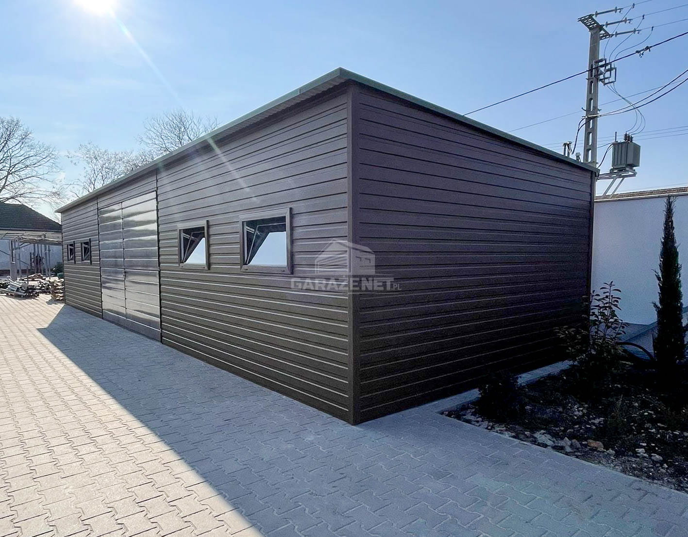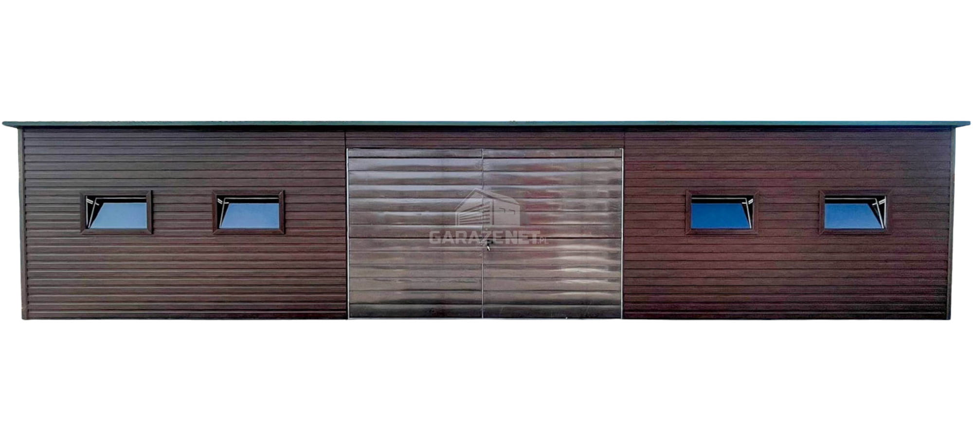 GARAŻ BLASZNY 13,5X4,5M - BRAMA DWUSKRZYDŁOWA - 4X OKNO - CIEMNY ORZECH - DREWNOPODOBNY - DACH SPAD W TYŁ TS1016