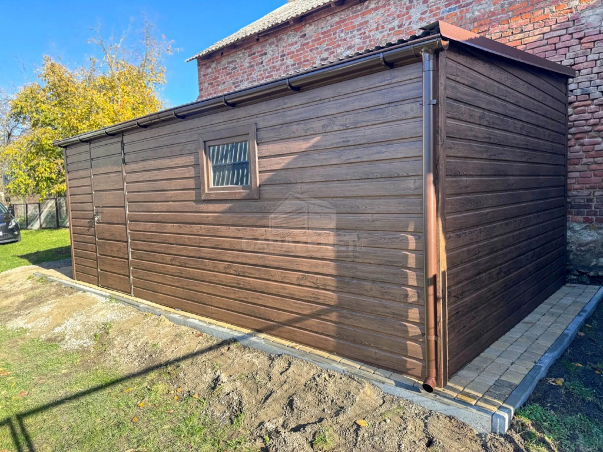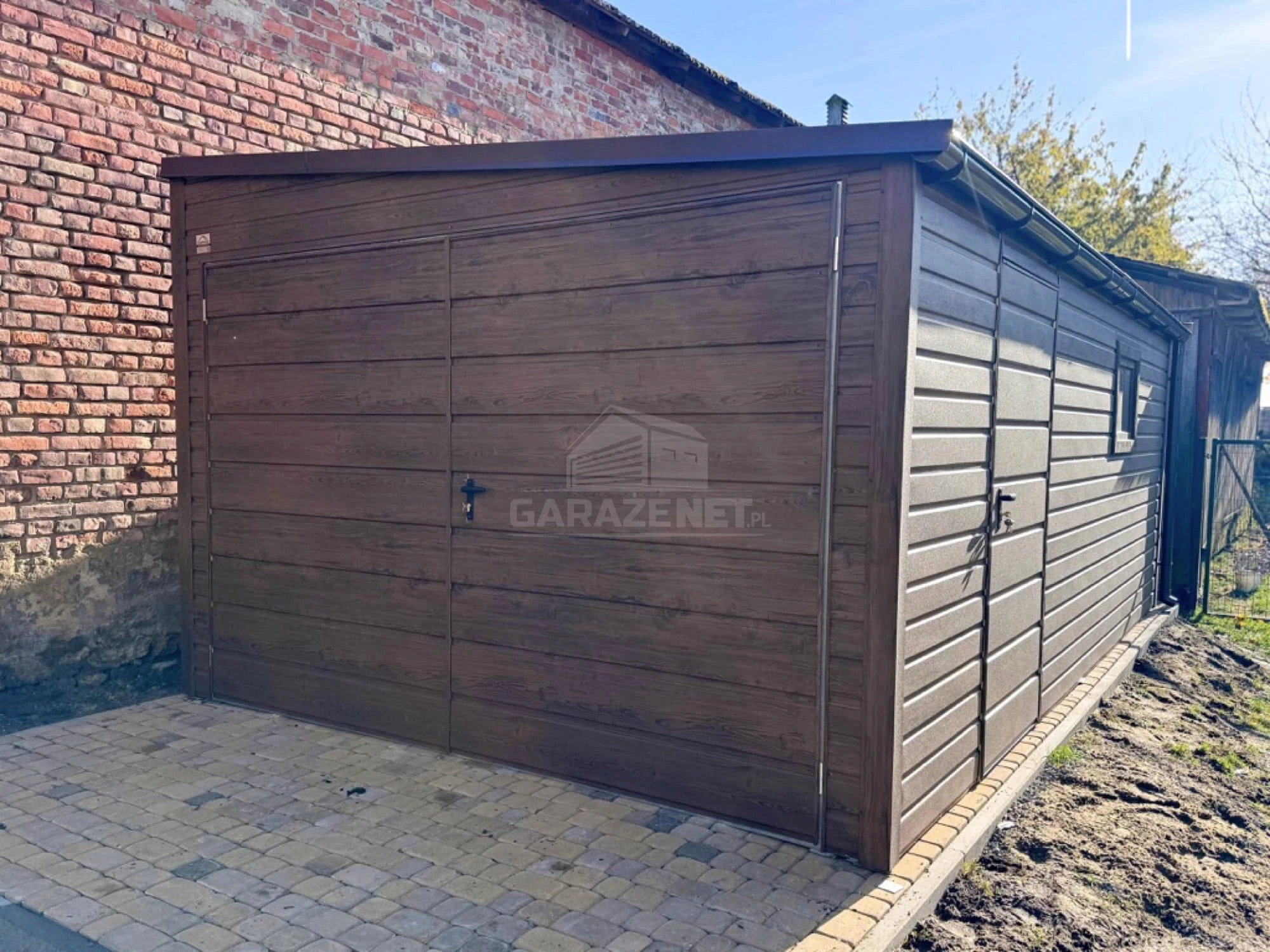 GARAŻ BLASZNY 3,5X5M – BRAMA DWUSKRZYDŁOWA – DRZWI – OKNO – CIEMNY ORZECH – DREWNOPODOBNY – DACH SPAD W BOK TS1187