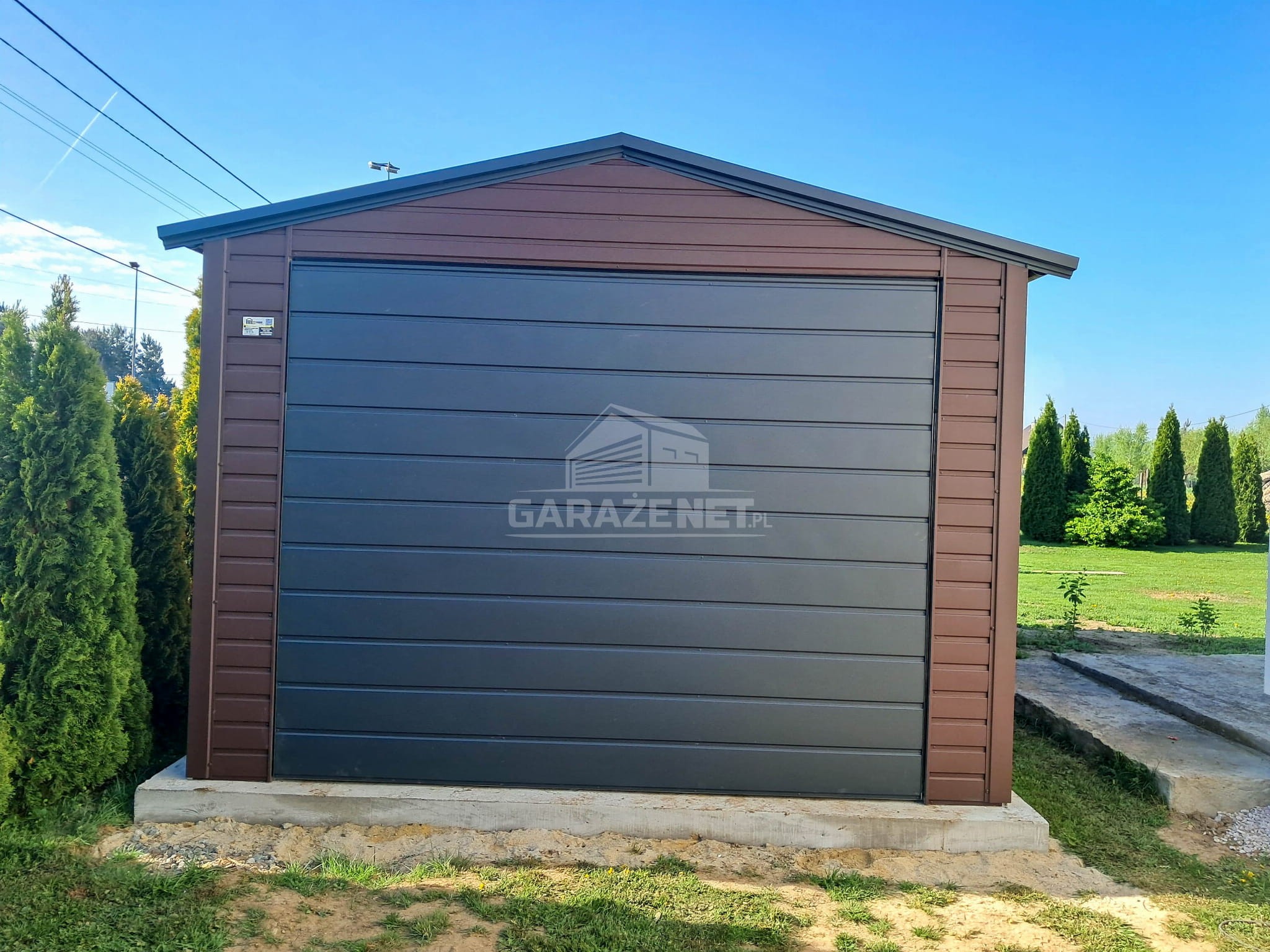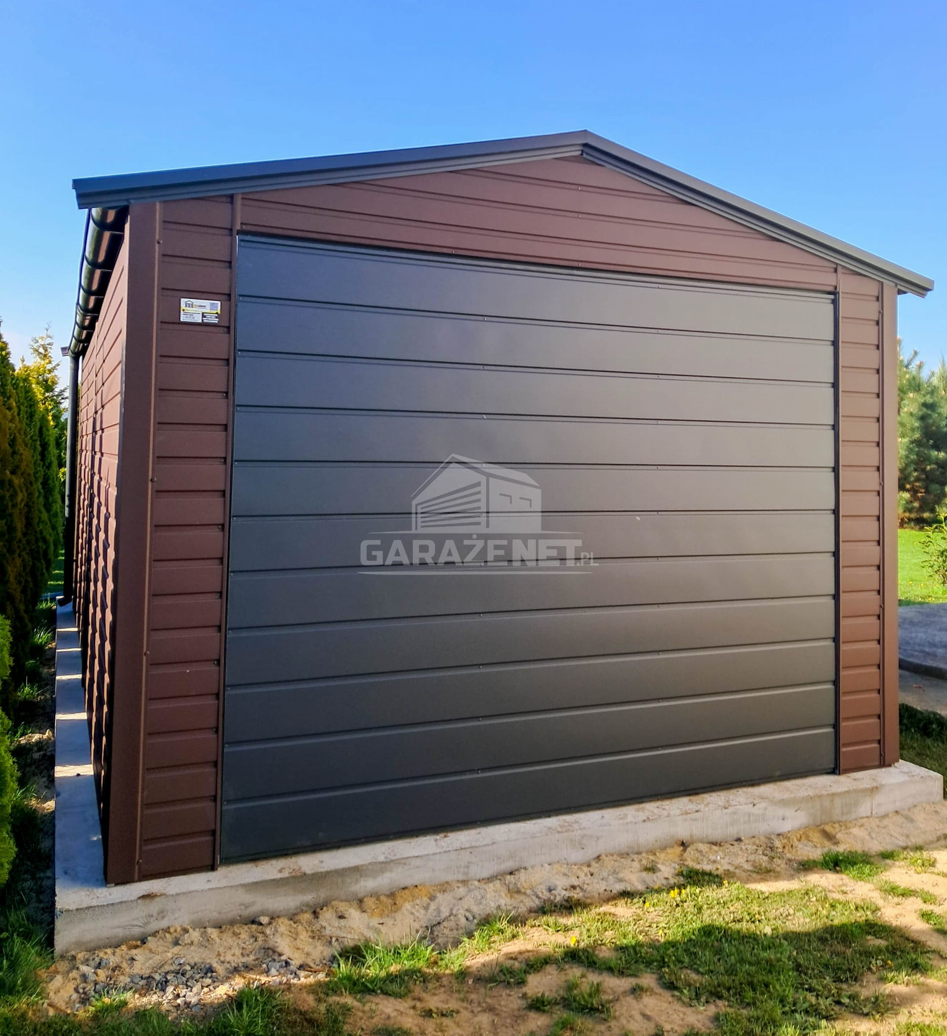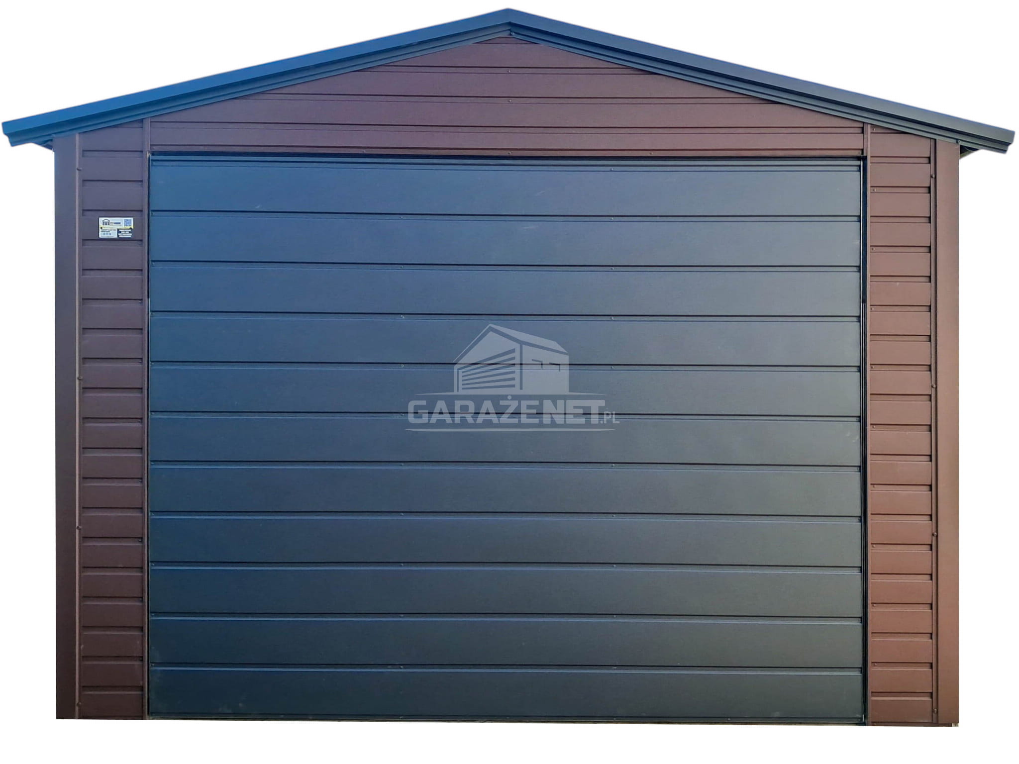 GARAŻ BLASZNY 3,5X5M – BRAMA – drzwi – OKNO – CIEMNY BRĄZ – ANTRACYT – RYNNA – DACH DWUSPADOWY TS1070