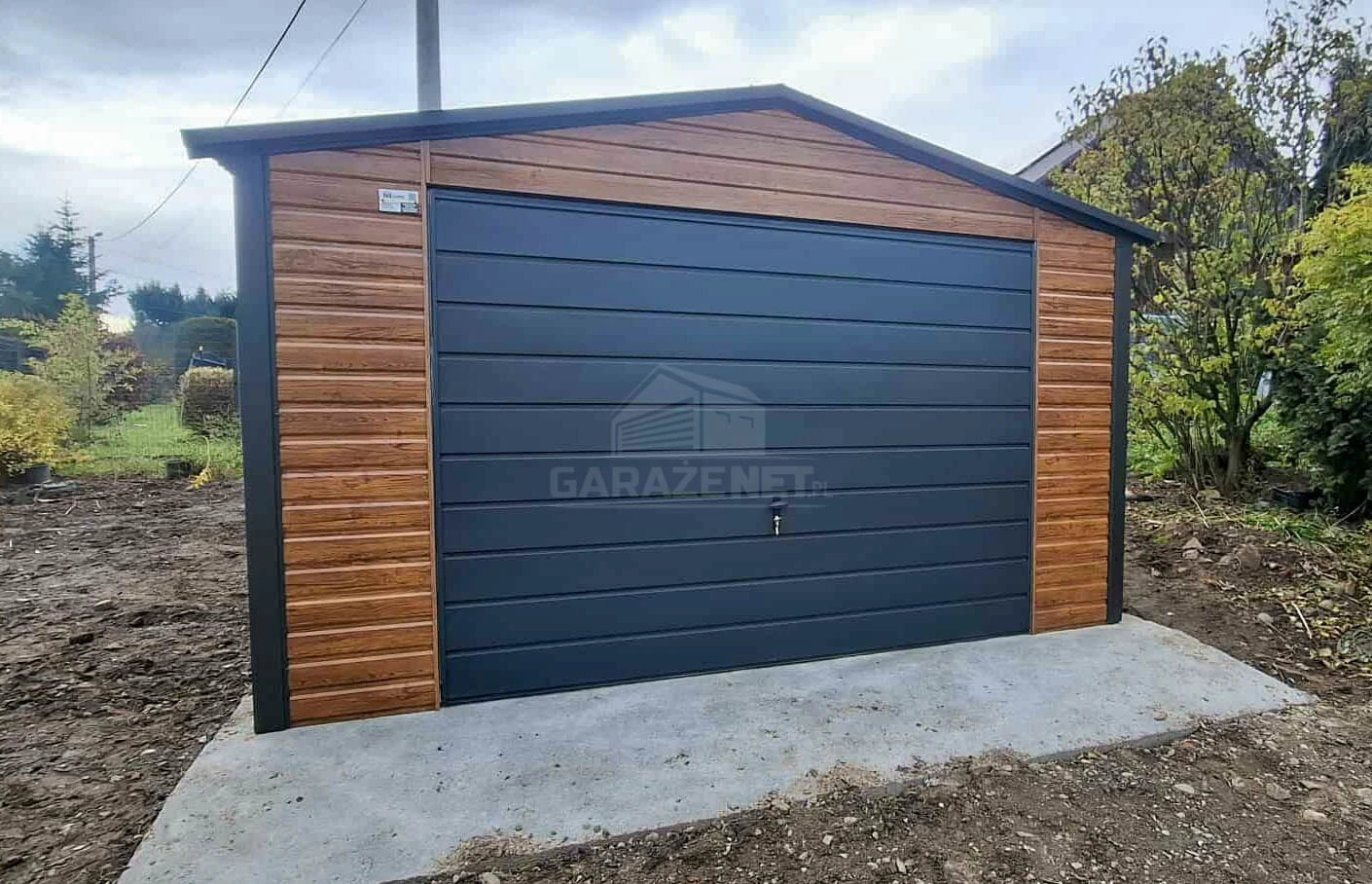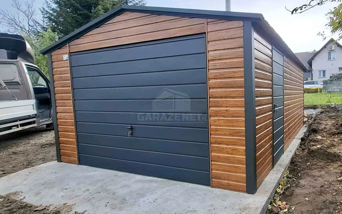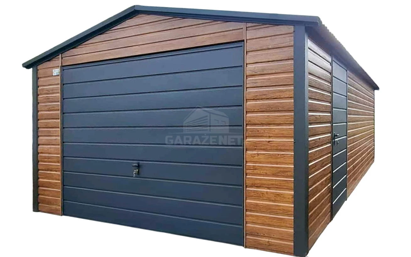 GARAŻ BLASZNY 4,5X6 M – BRAMA UCHYLNA – DRZWI – JASNY ORZECH – DREWNOPODOBNY – DACH DWUSPADOWY TS1235