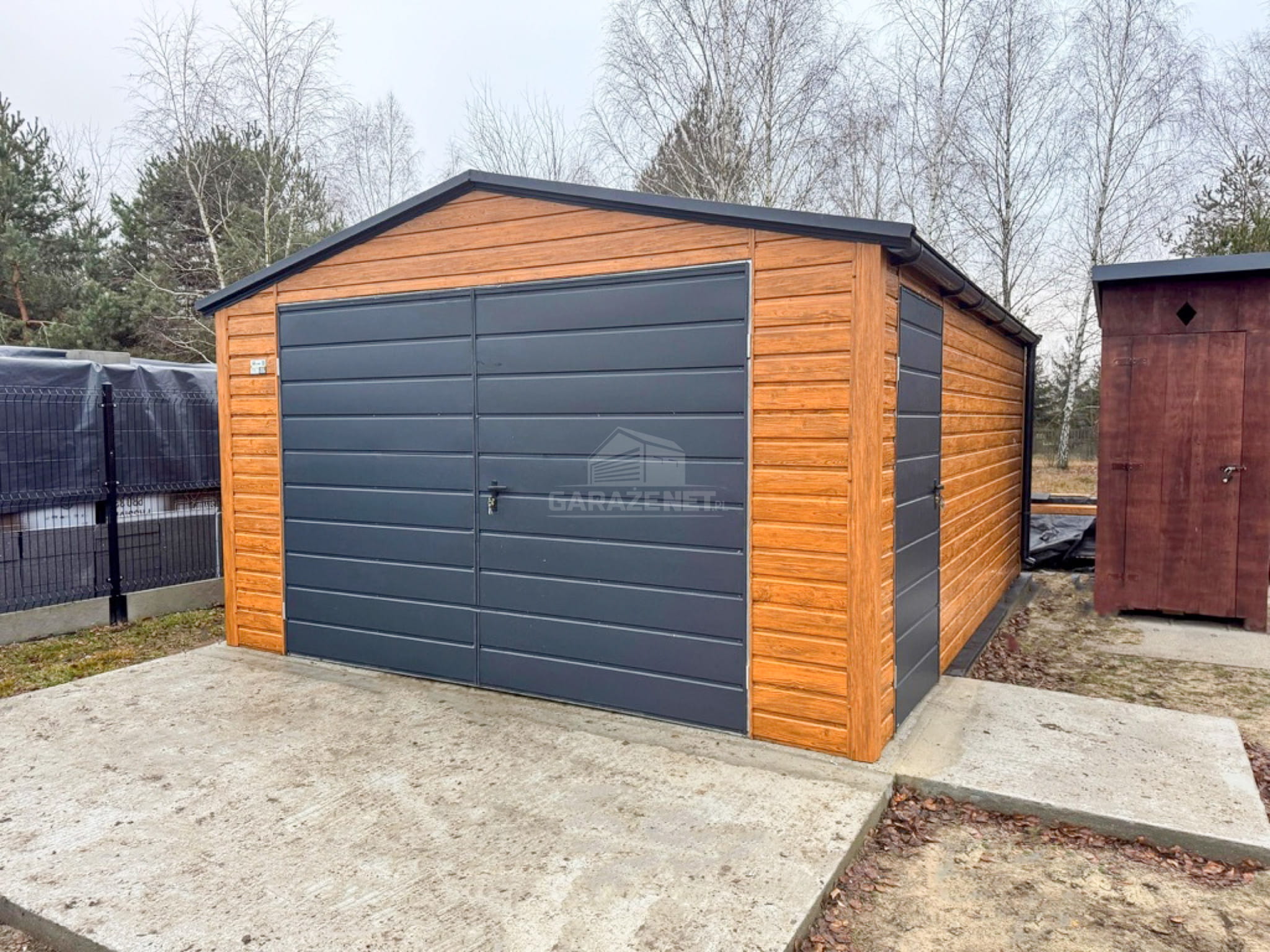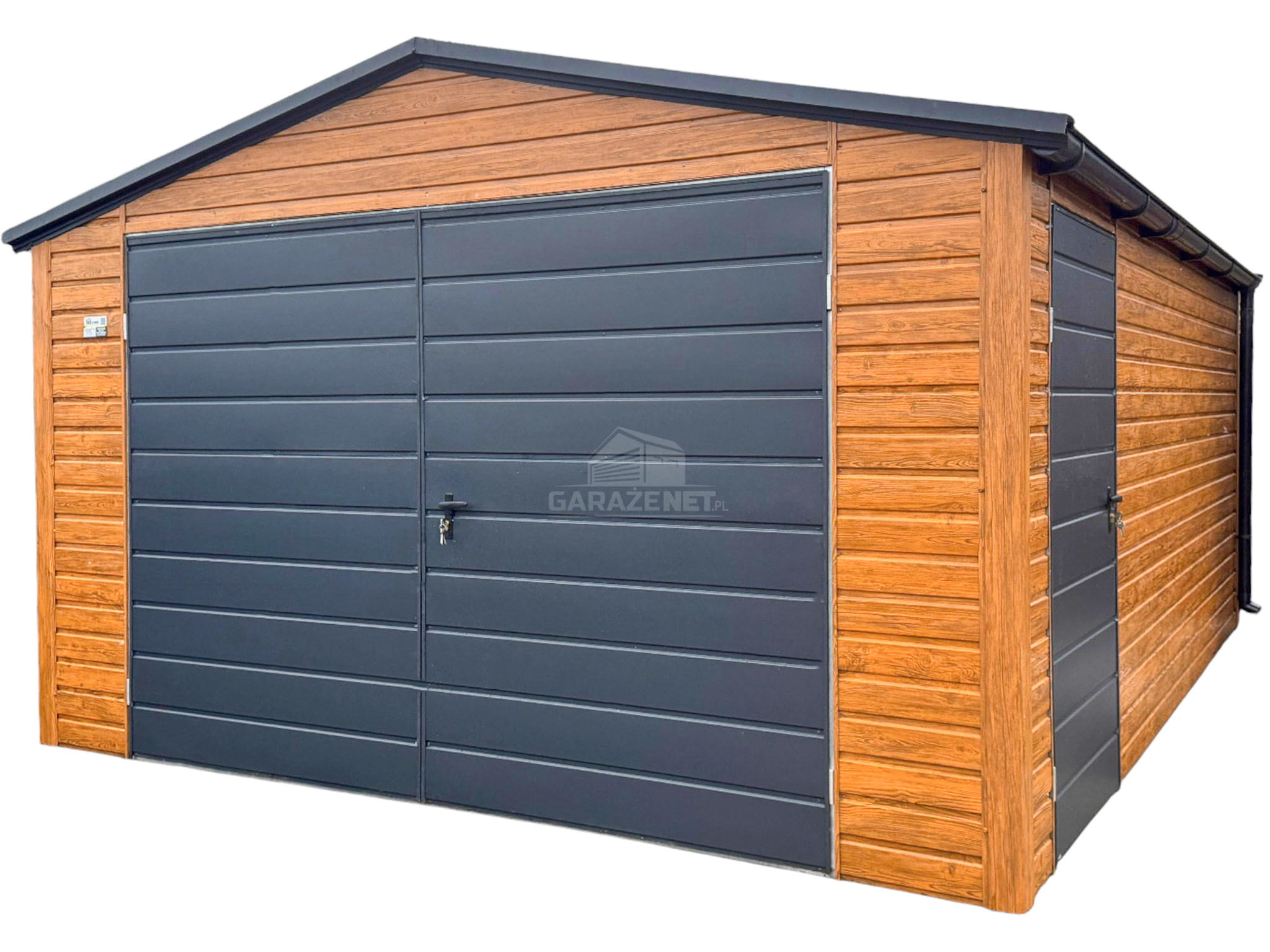 GARAŻ BLASZNY 4,5X6M - BRAMA DWUSKRZYDŁOWA - DRZWI - JASNY ORZECH - DREWNOPODOBNY - ANTRACYT - RYNNY - DACH DWUSPADOWY TS976