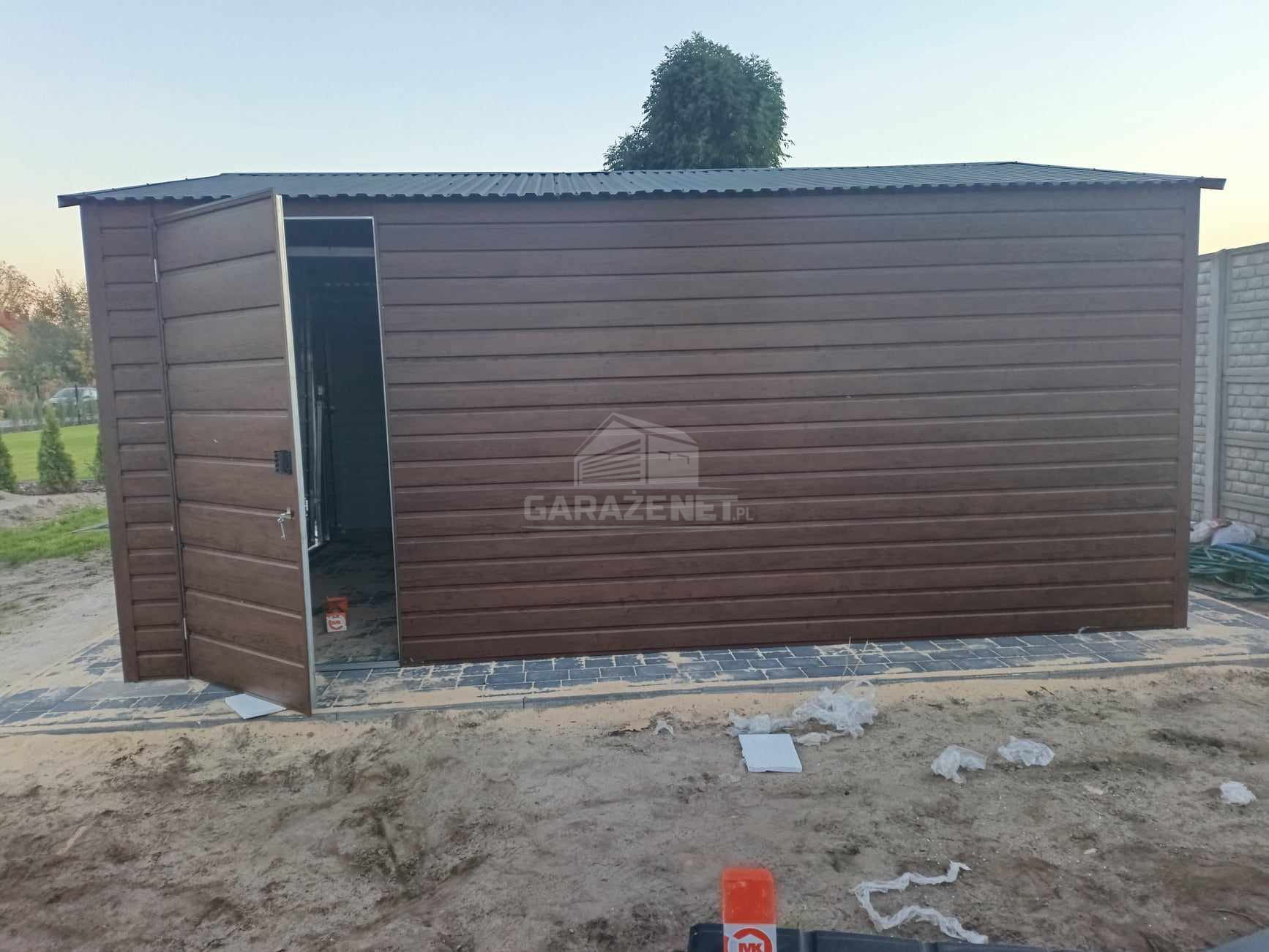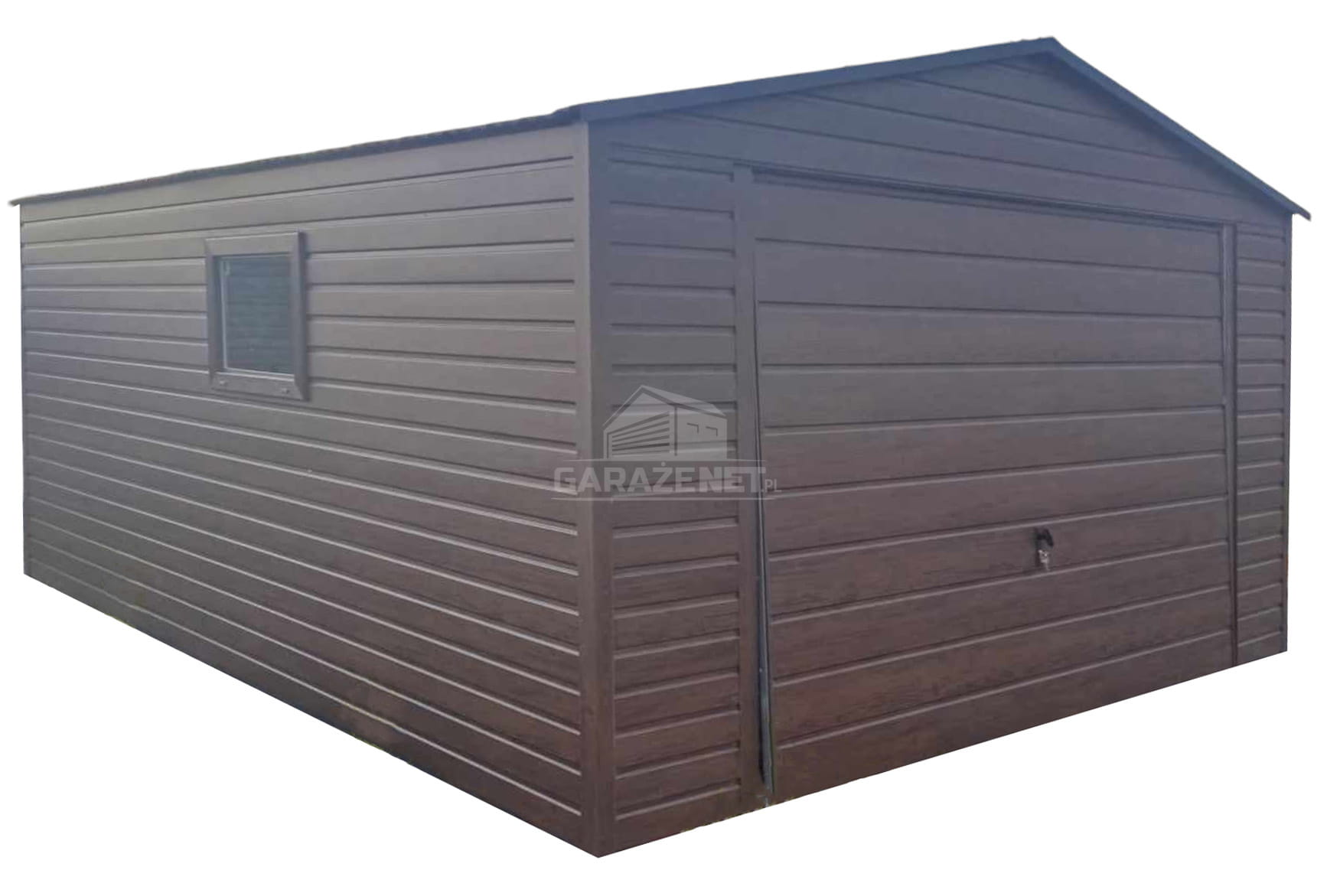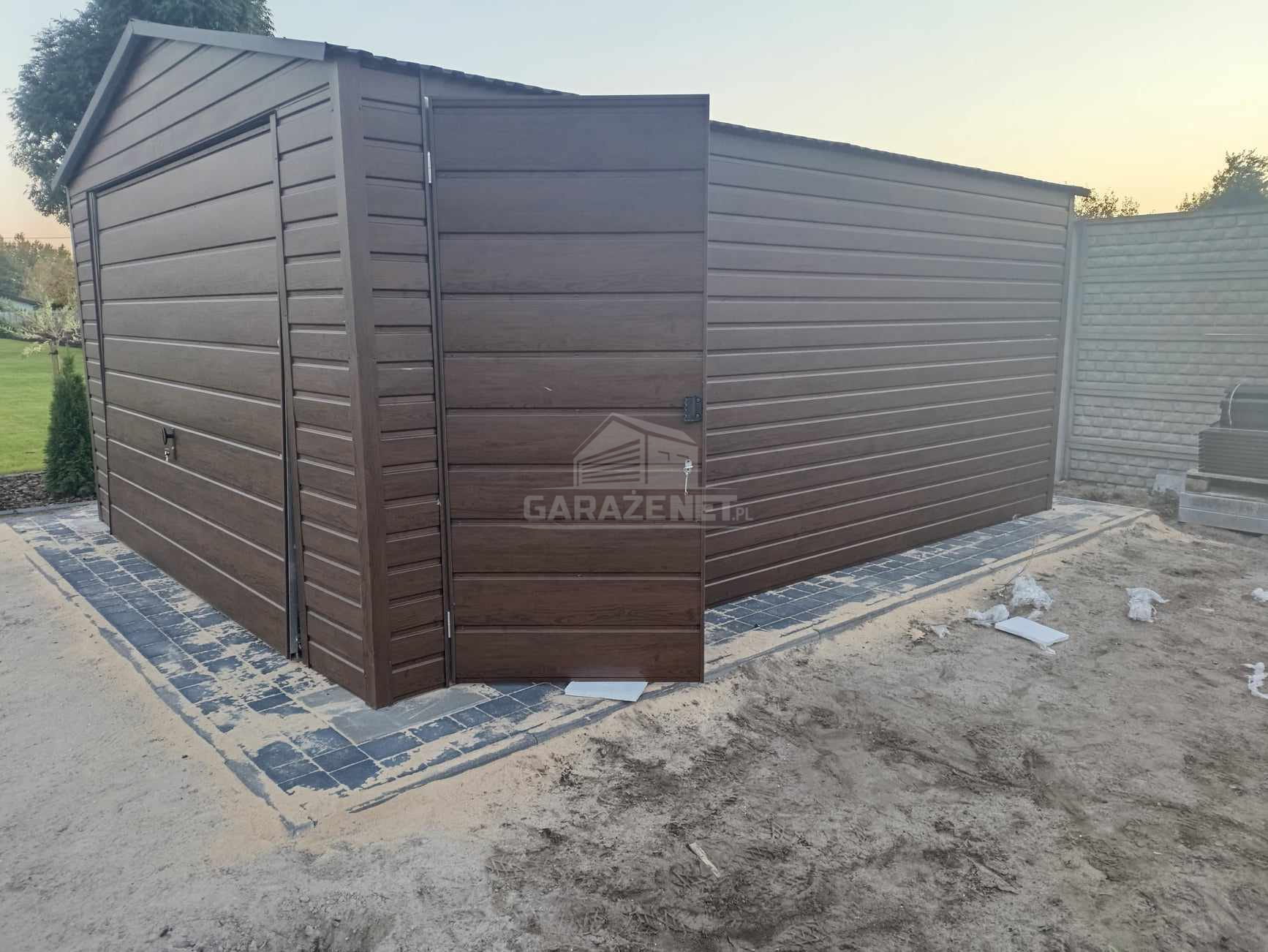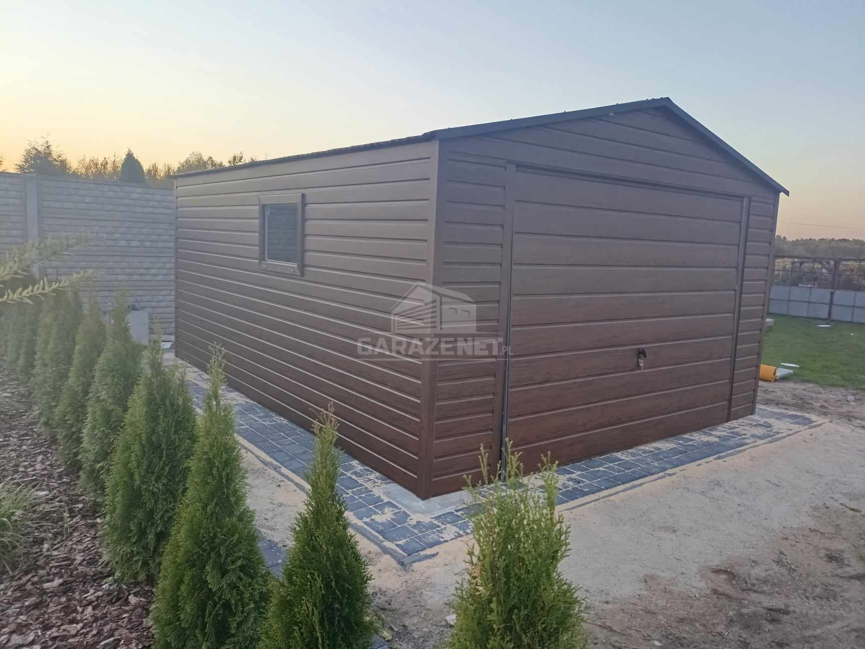 GARAŻ BLASZNY 4X5M - BRAMA UCHYLNA - DRZWI - OKNO - CIEMNY ORZECH - DREWNOPODOBNY - DACH DWUSPADOWYTS844