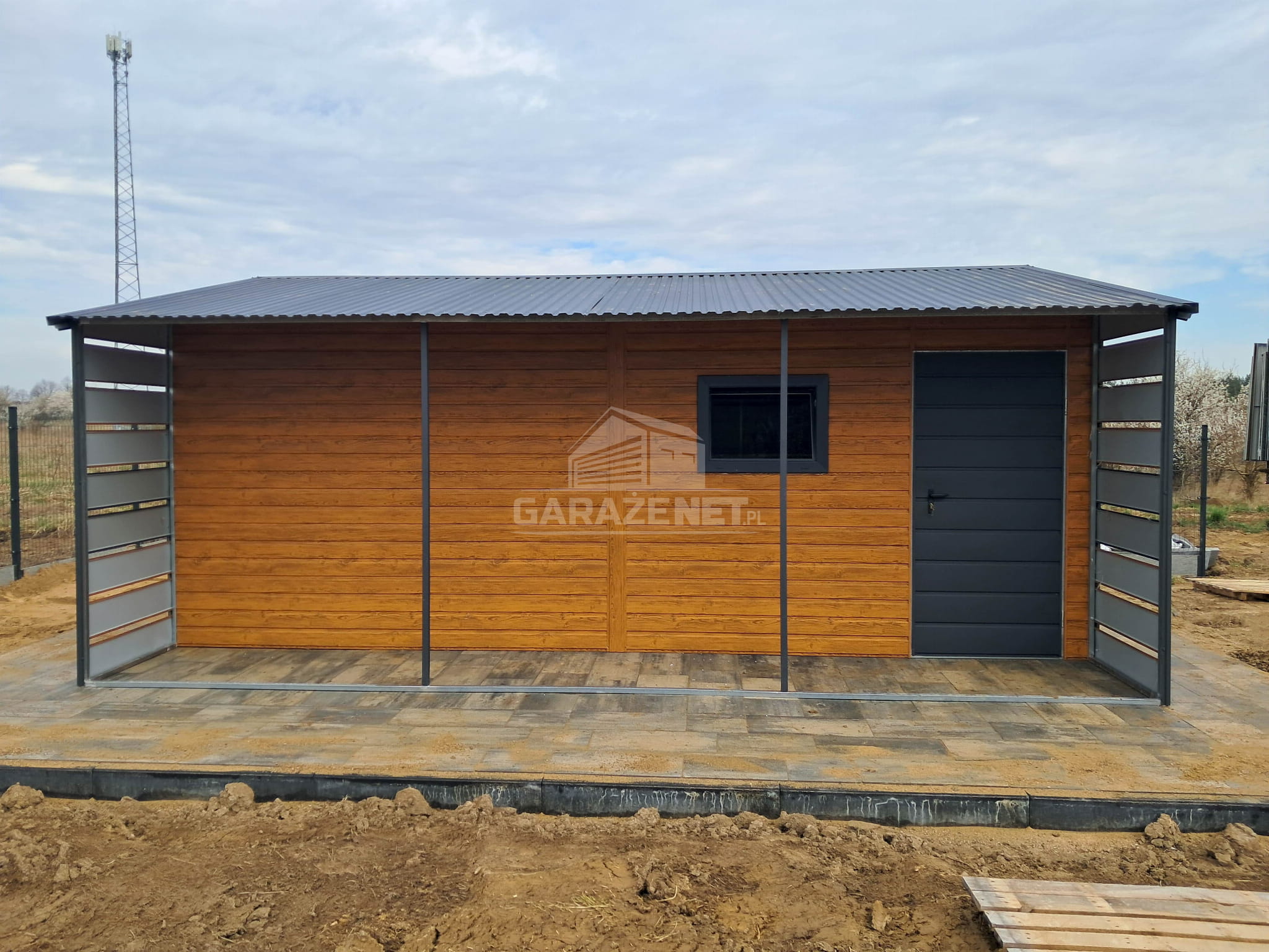 GARAŻ BLASZNY 4X5M + WIATA 1X5M – BRAMA – DRZWI – OKNO – JASNY ORZECH – DREWNOPODOBNY – ANTRACYT – DACH DWUSPADOWY TS1071