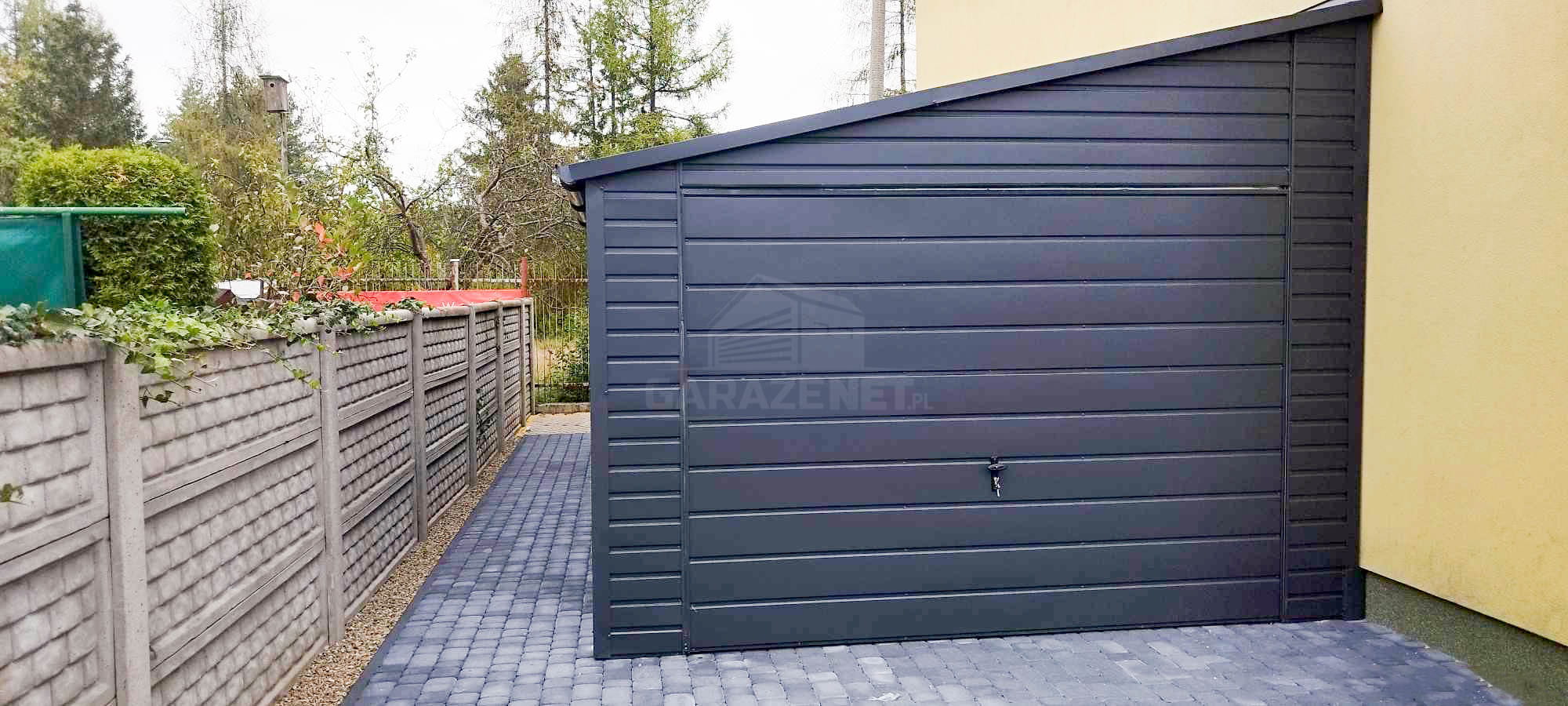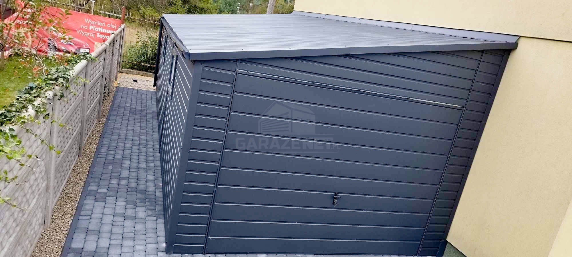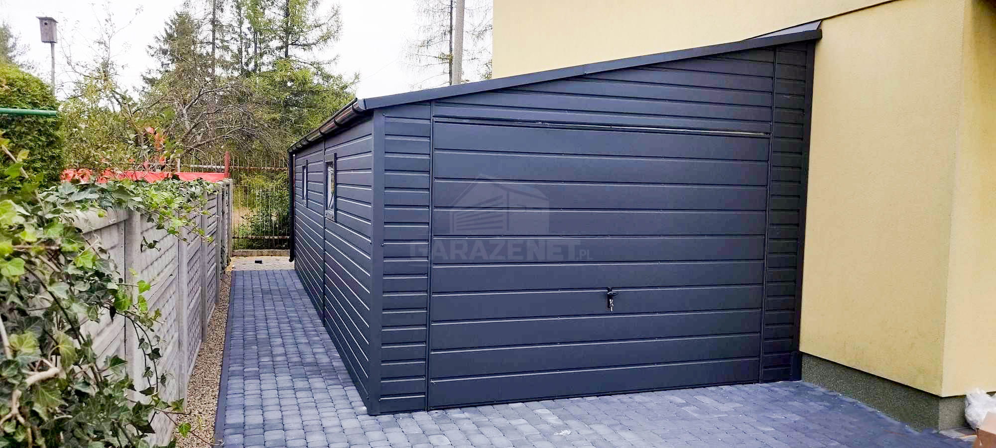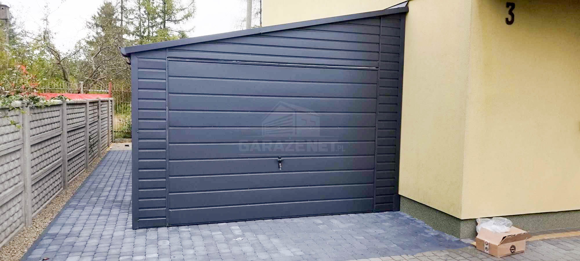 GARAŻ BLASZNY 4X7M BRAMA UCHYLNA - 2X OKNO - RYNNY - ANTARCYT - DACH SPAD W BOK TS836