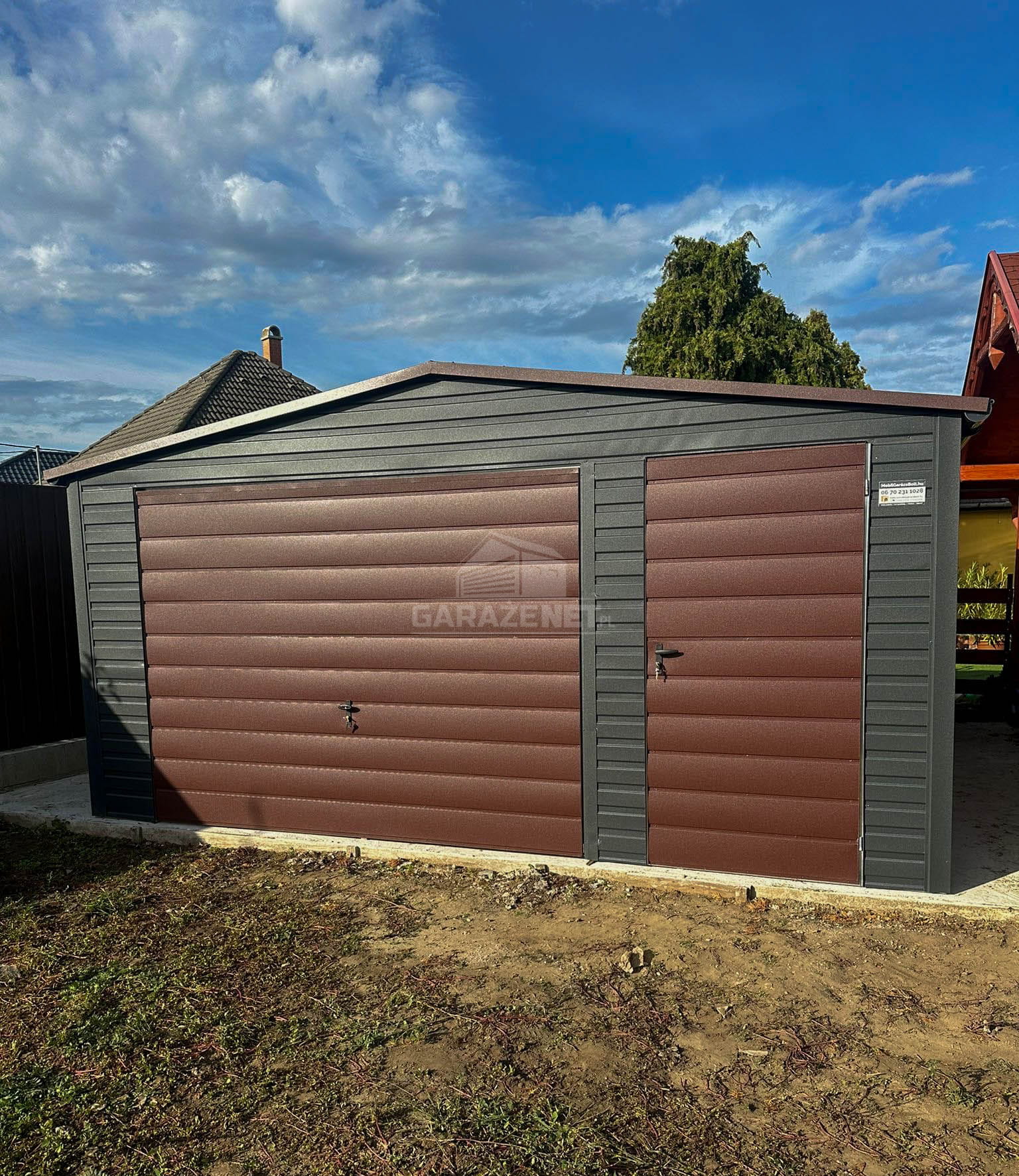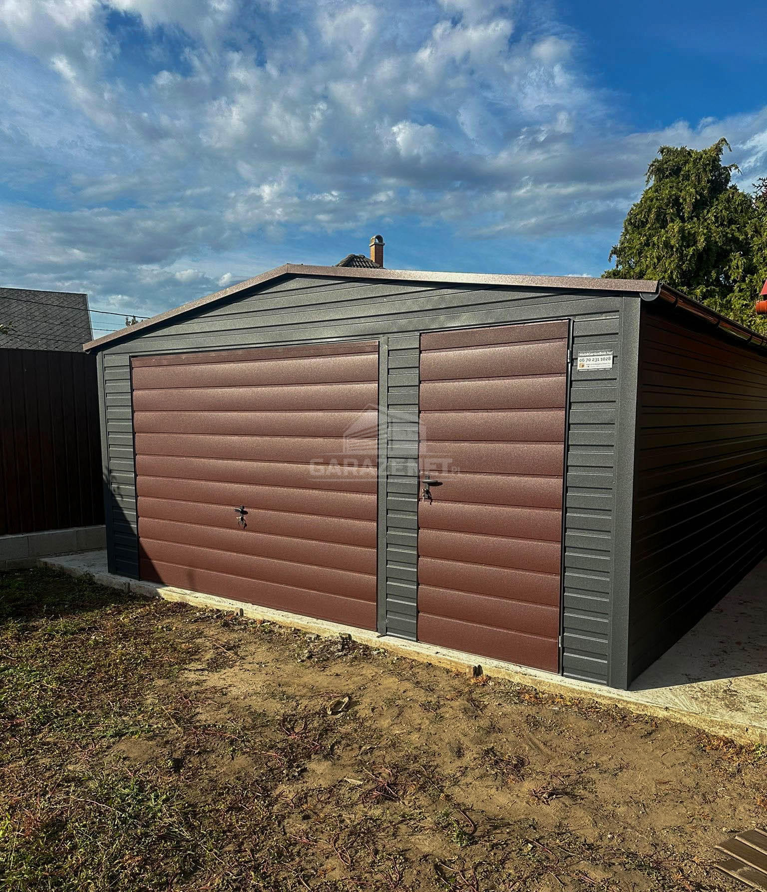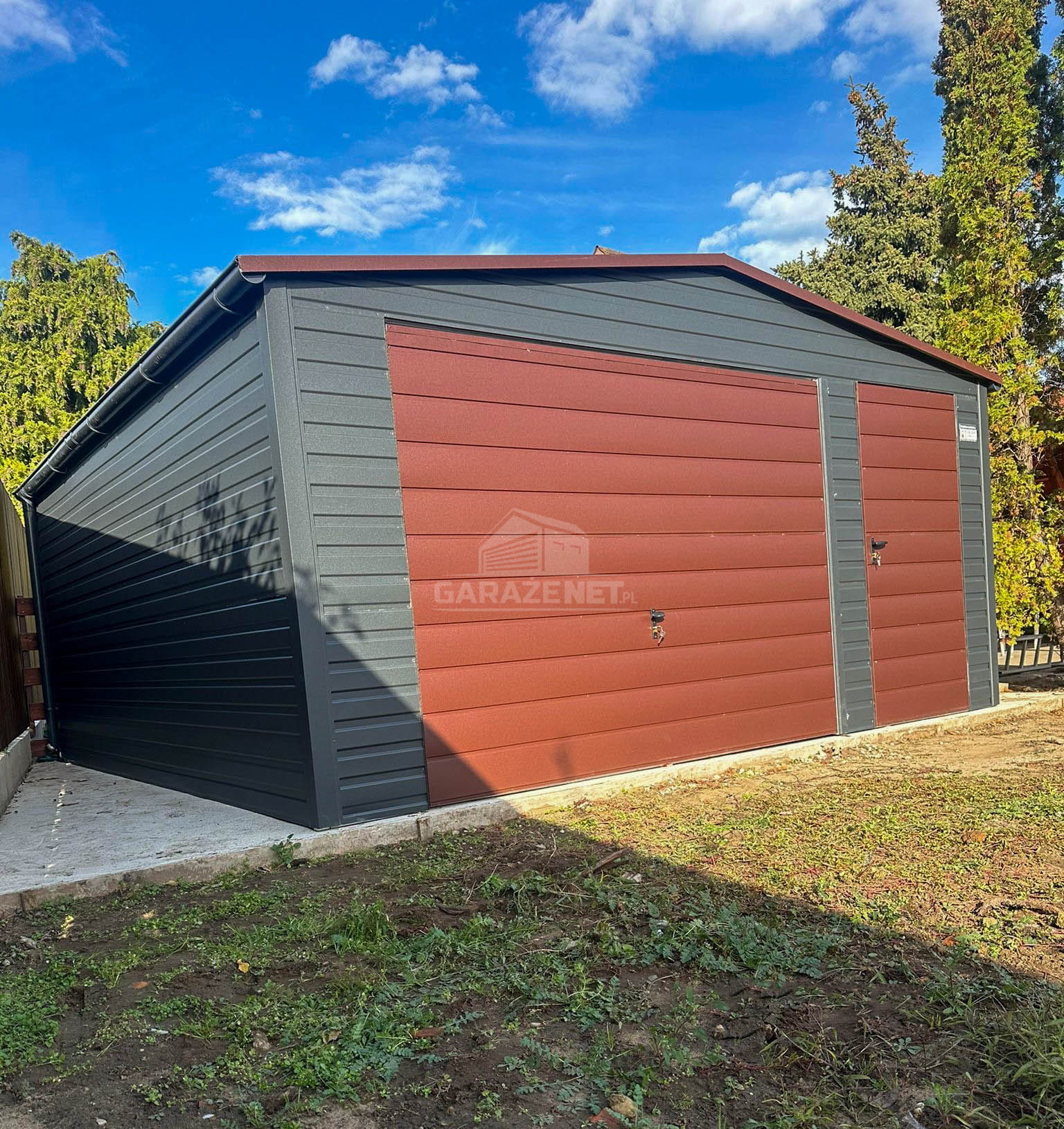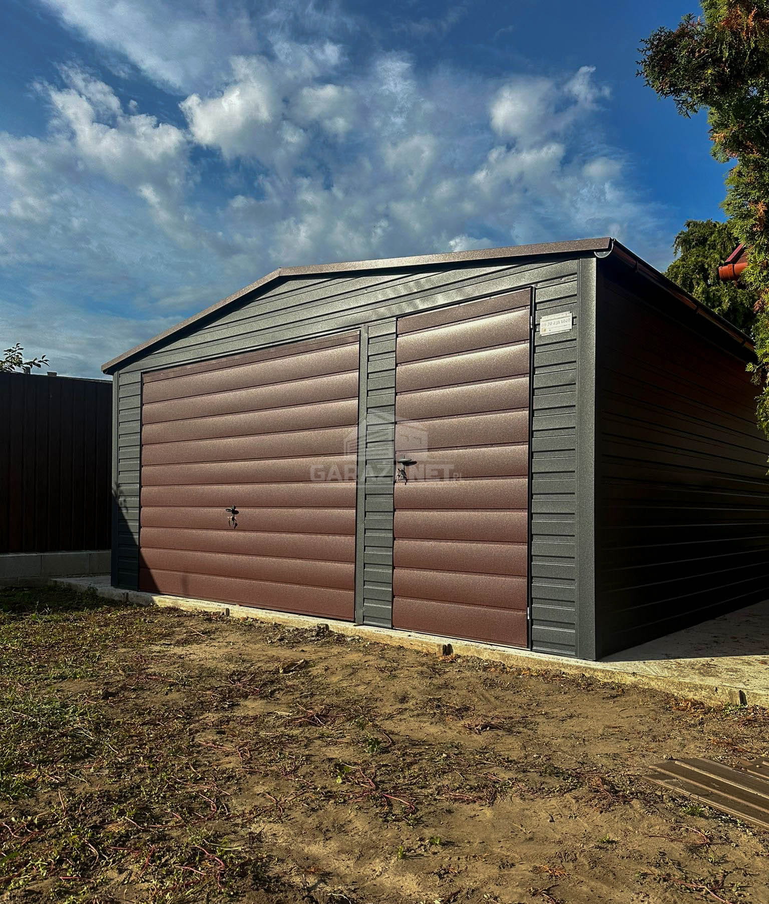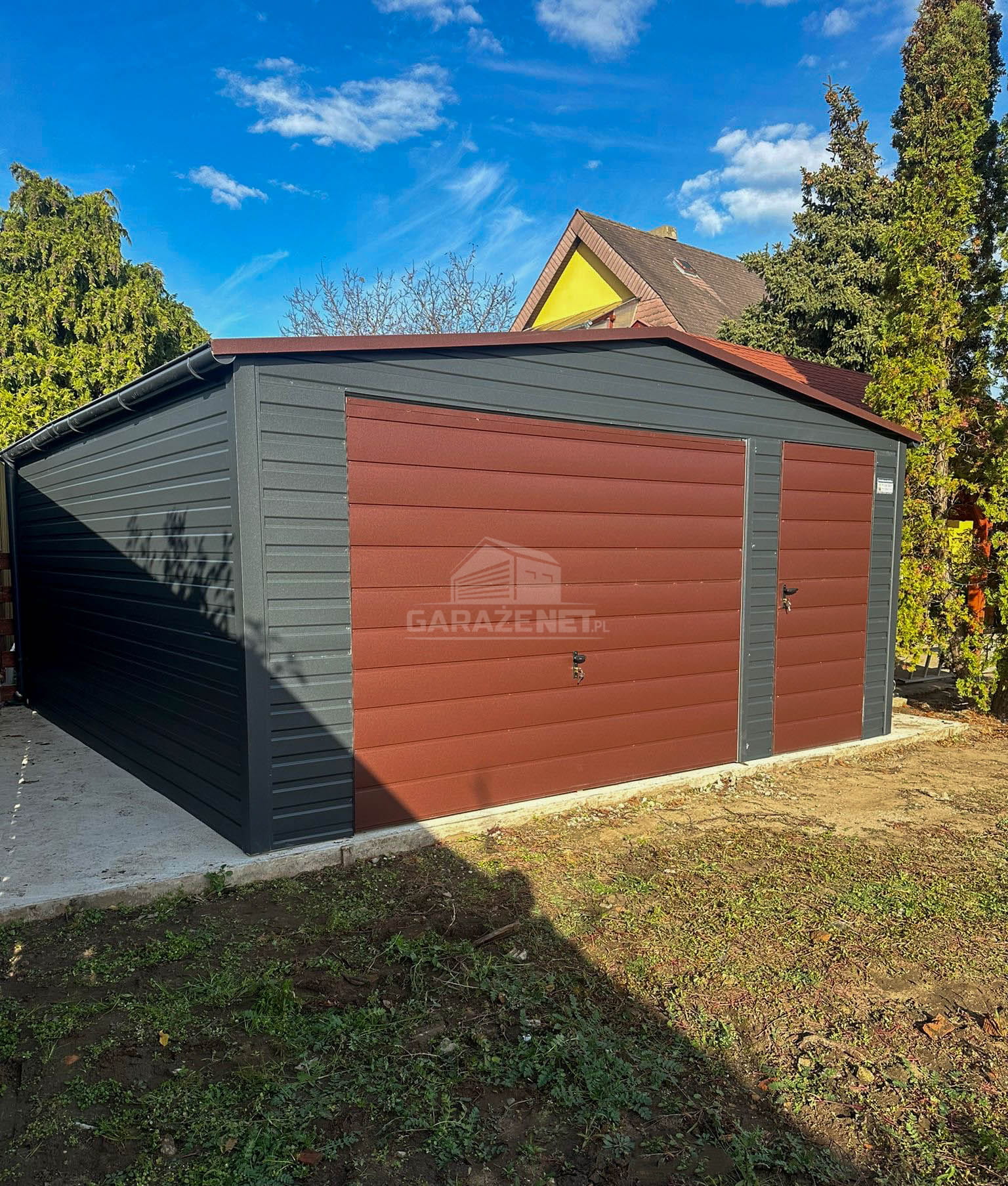 GARAŻ BLASZNY 5X6M - BRAMA UCHYLNA - DRZWI - CIEMNY BRĄZ - ANTRACYT - RYNNY - DACH DWUSPADOWY TS858