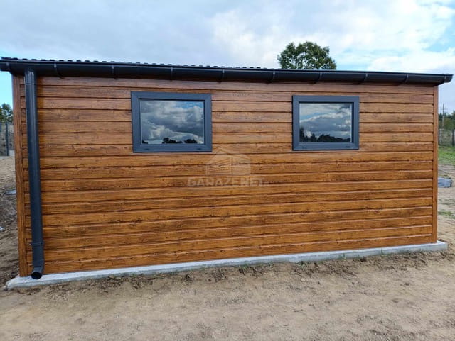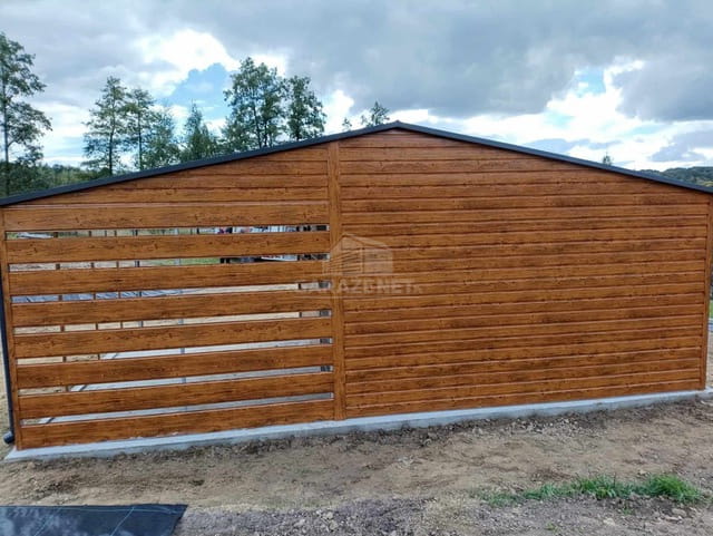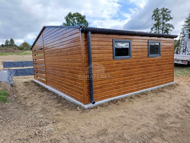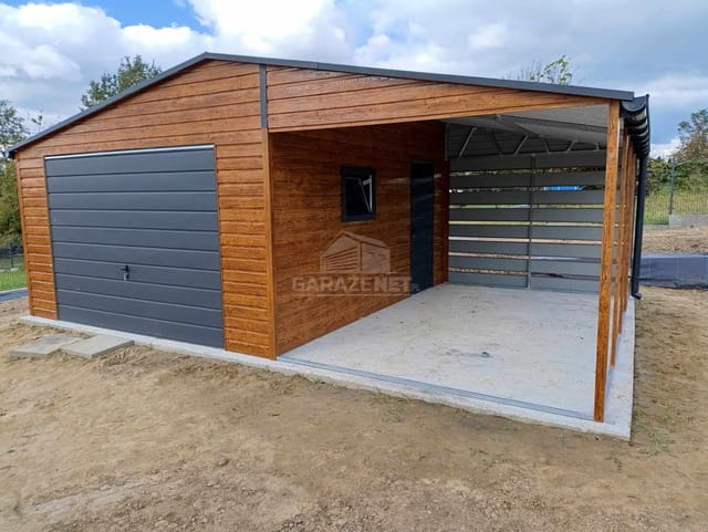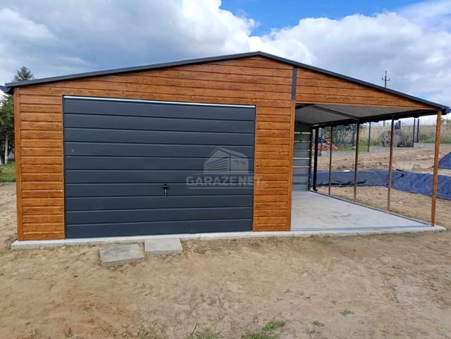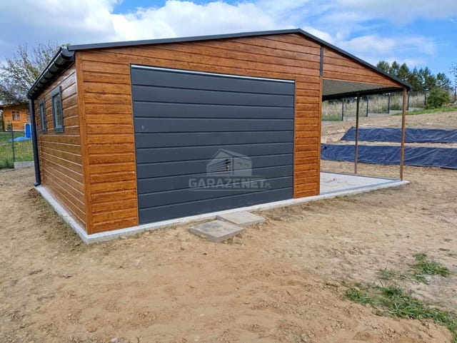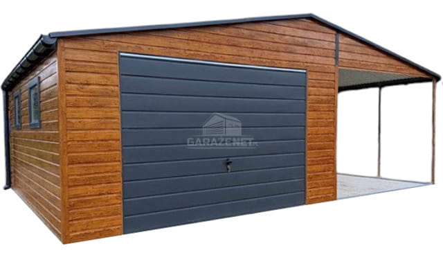 GARAŻ BLASZNY 5X6M+ WIATA 4M BRAMA UCHYLNA - DRZWI - 3X OKNO - JASNY ORZECH - DREWNOPODOBNY - ANTRACYT - RYNNY - DACH DWUSPADOWY TS845