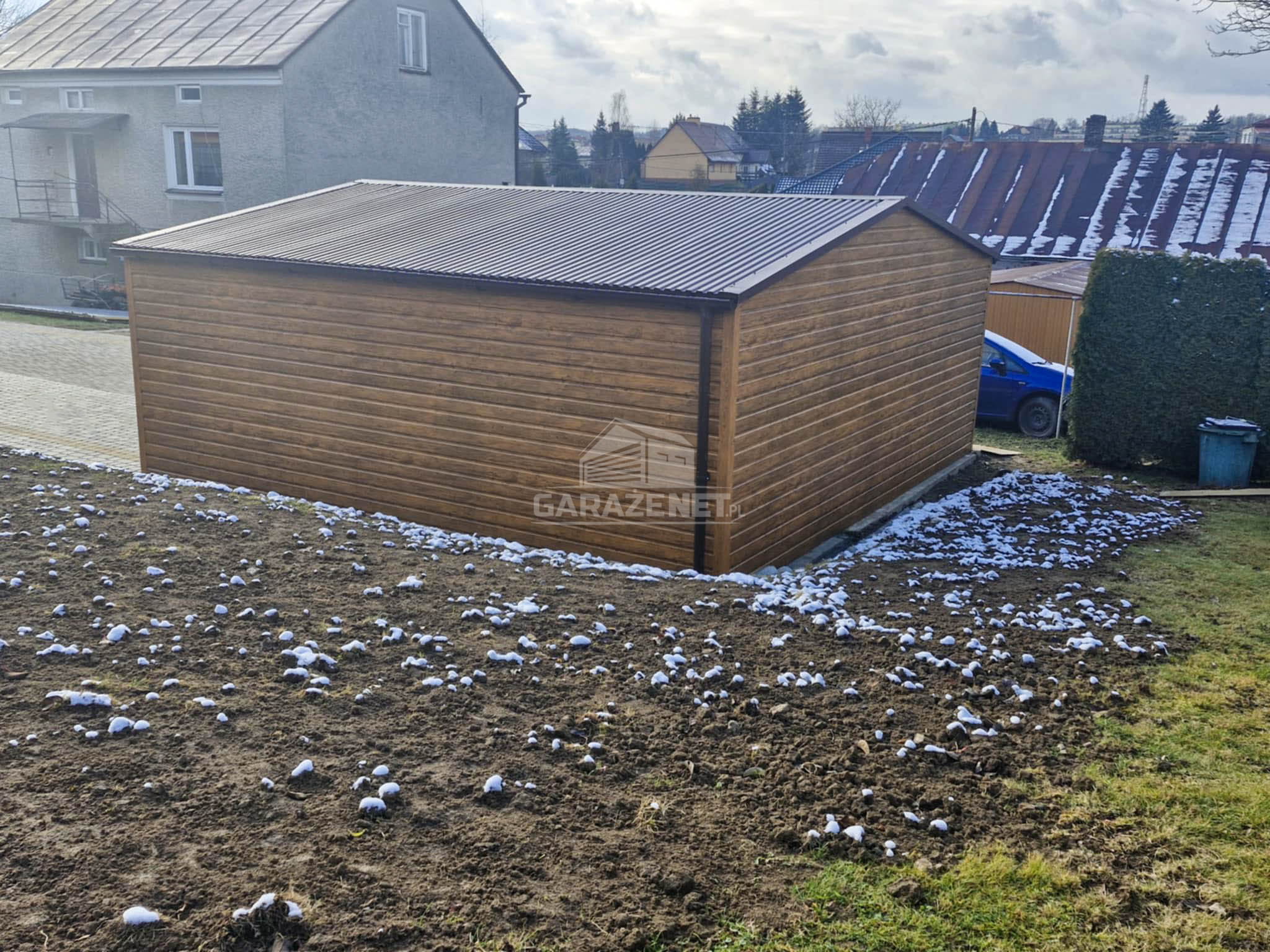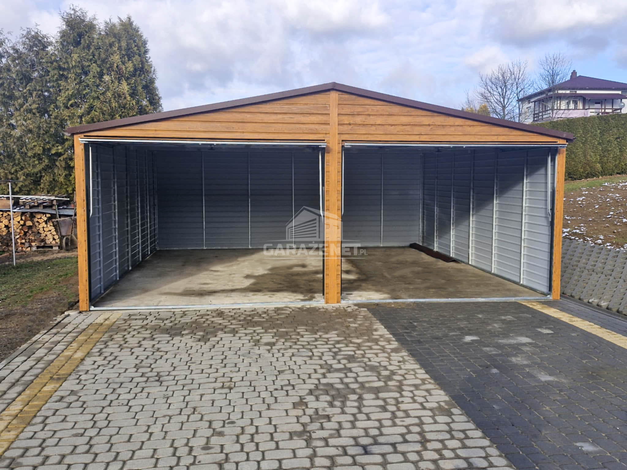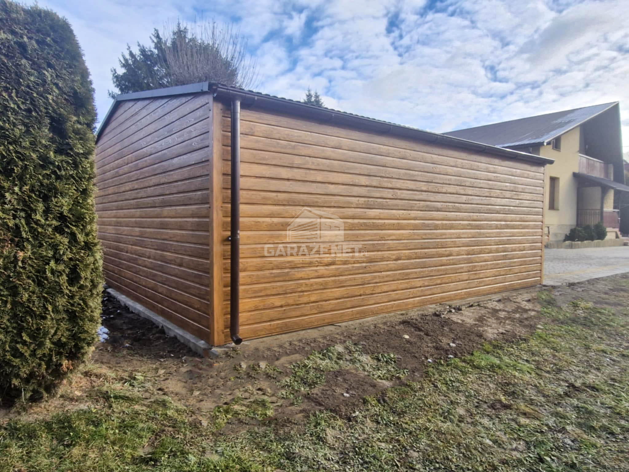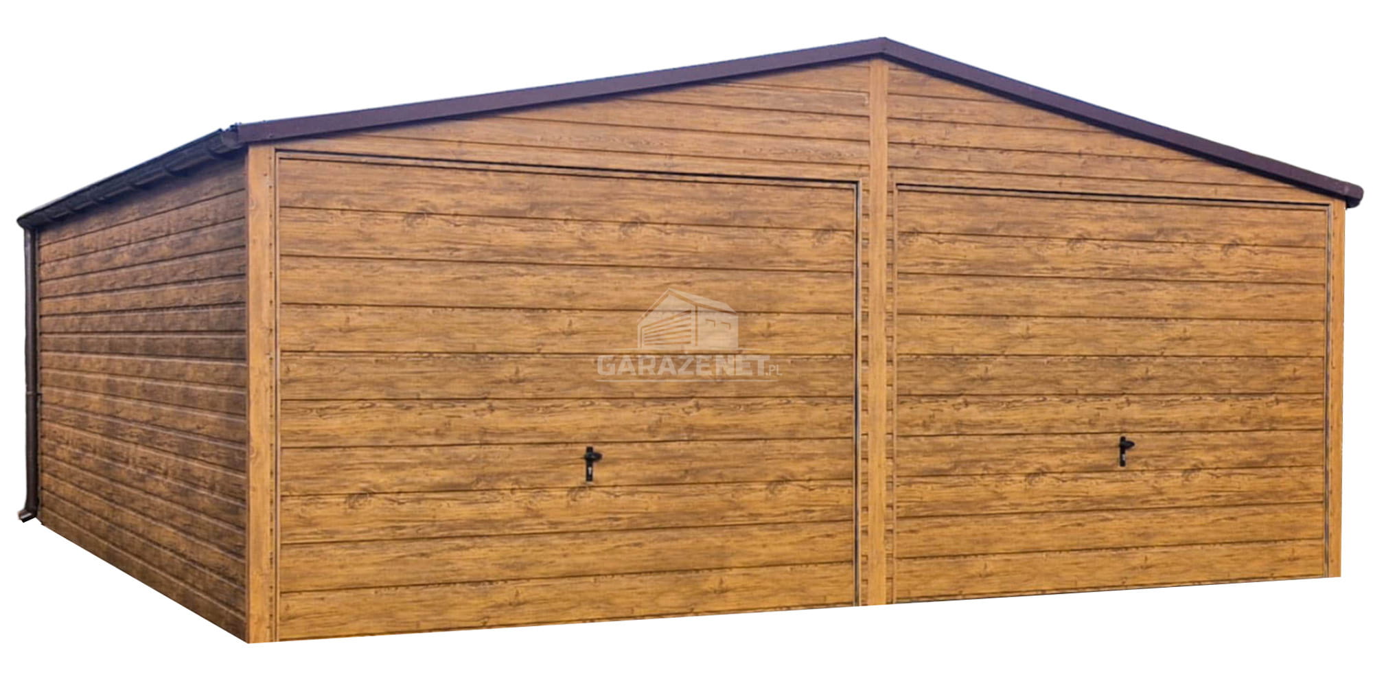 GARAŻ BLASZNY 6X6,5M - BRAMY UCHYLNE - JASNY ORZECH - DREWNOPODOBNY - RYNNY - DACH DWUSPADOWY TS932