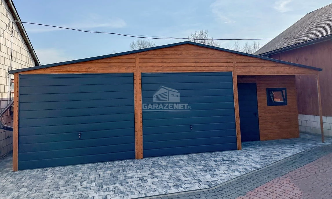 GARAŻ BLASZNY 9,5X6M – WNĘKA – 2X BRAMA UCHYLNA – DRZWI – 3X OKNO – JASNY ORZECH – ANTRACYT – DREWNOPODOBNY – RYNNY – DACH DWUSPADOWY TS1147