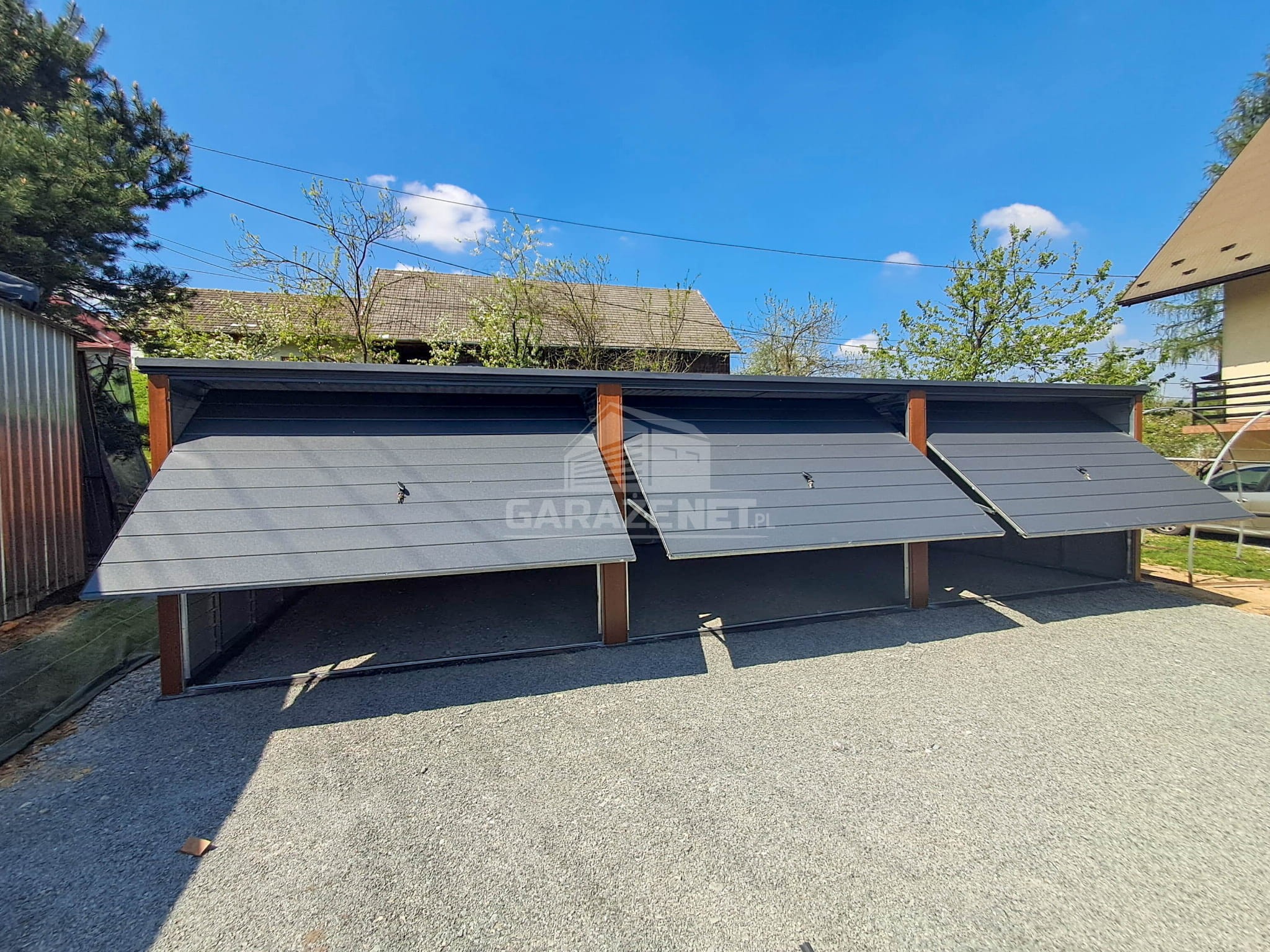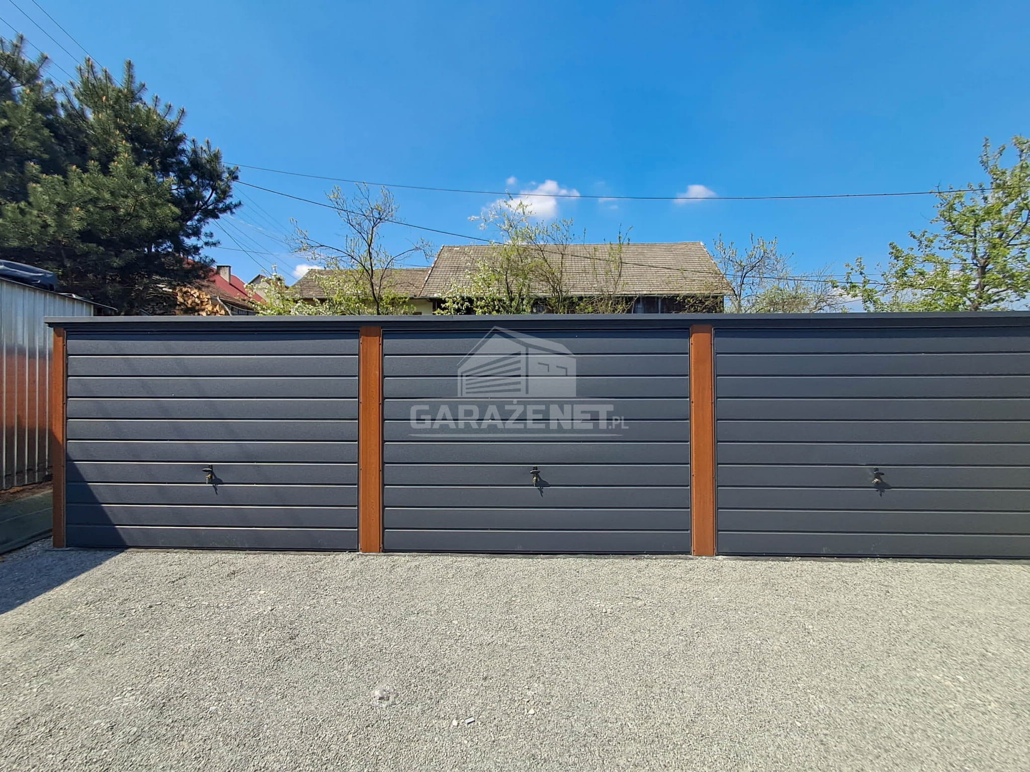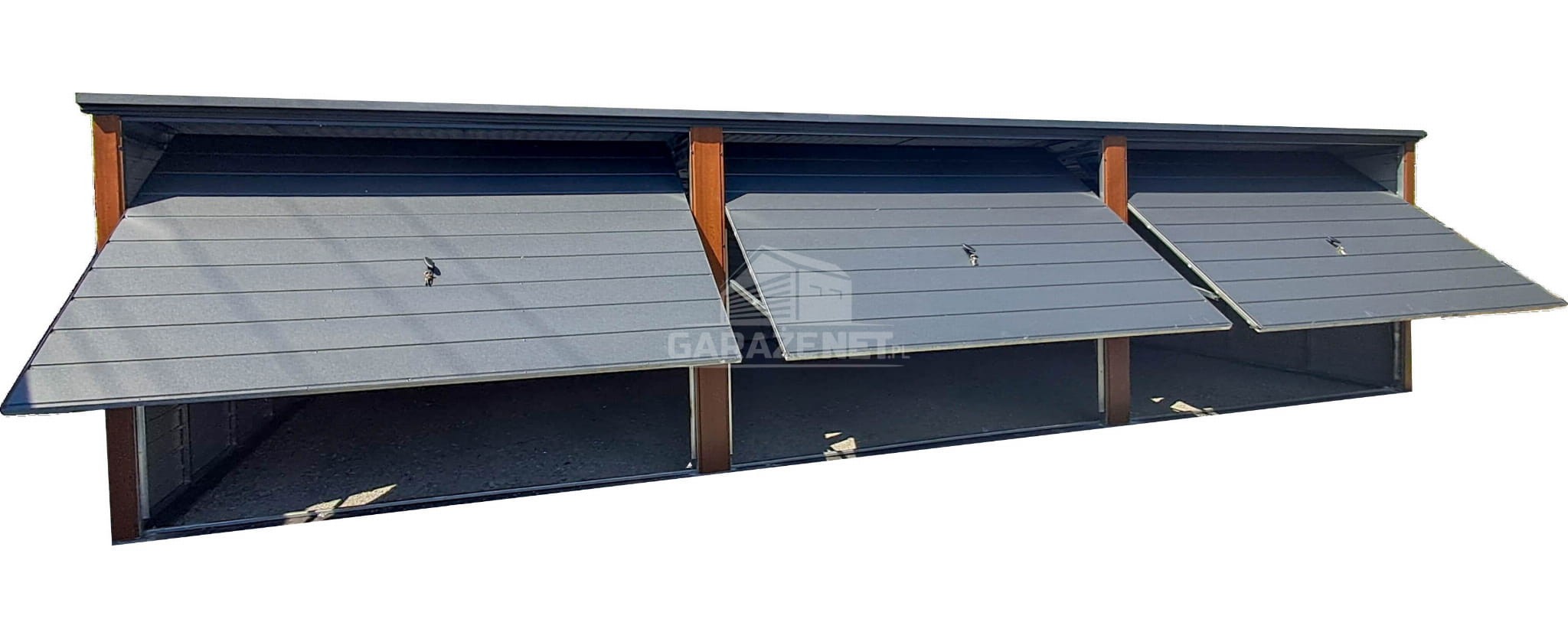 GARAŻ BLASZNY 9X5M – 3X BRAMA – CIEMNY ORZECH – DREWNOPODOBNY – ANTRACYT – DACH SPAD W TYŁ TS1073