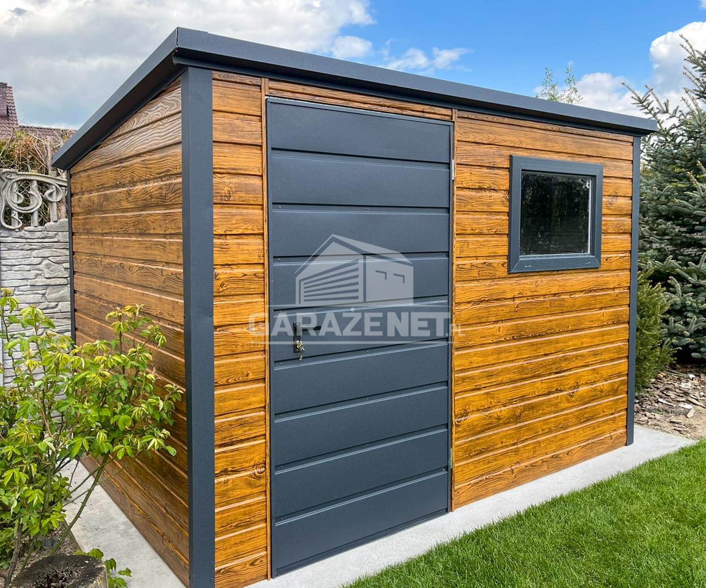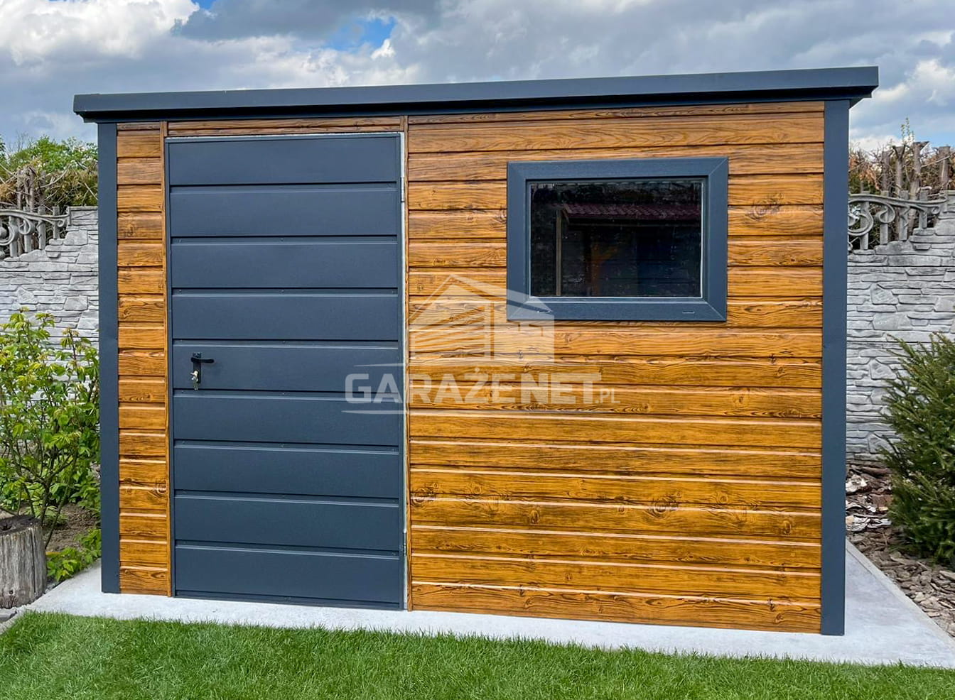 SCHOWEK - DOMEK OGRODOWY 2,5X2M DRZWI - OKNO - JASNY ORZECH - DREWNOPODOBNY - ANTRACYT - DACH SPAD W TYŁ GB439