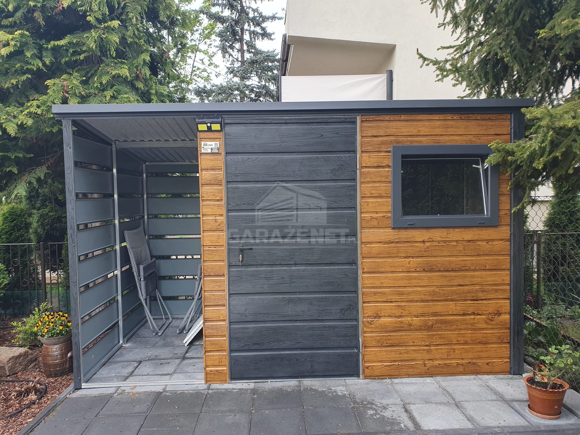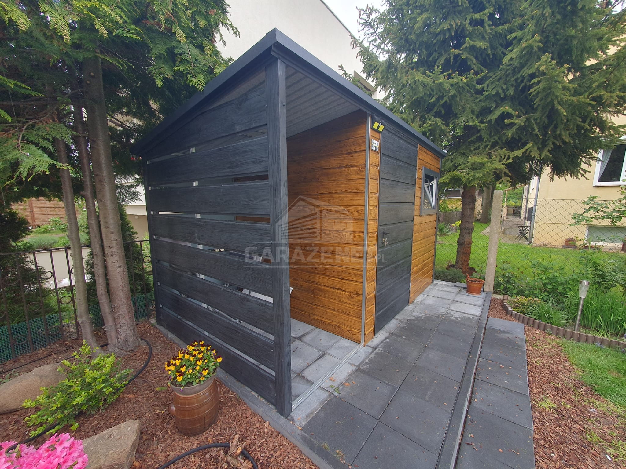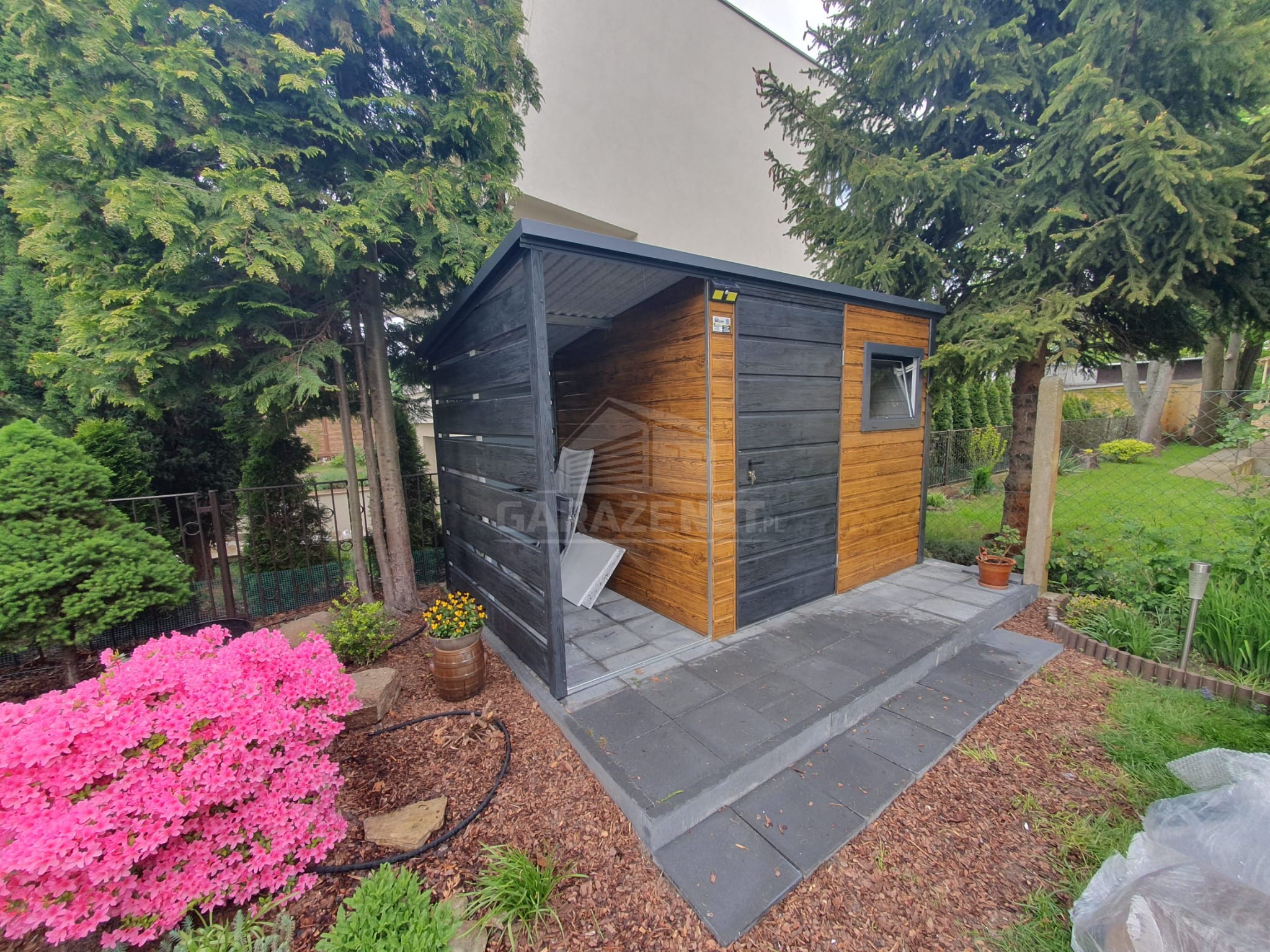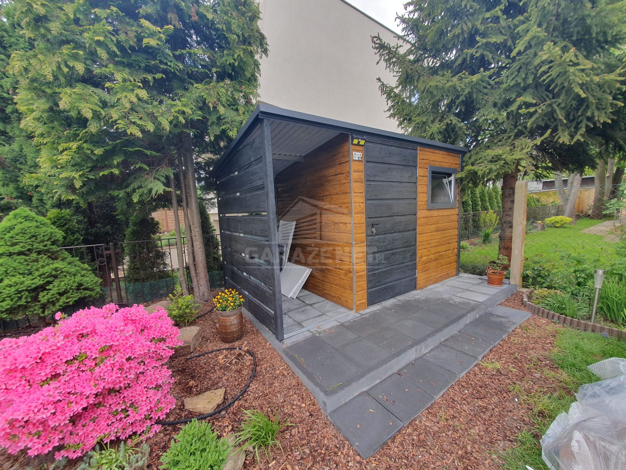 SCHOWEK - DOMEK OGRODOWY 2X2,5M + WIATA 1M - DRZWI - OKNO - SOSNA NORWESKA - JASNY ORZECH - DREWNOPODOBNY - DACH SPAD W TYŁ TS715