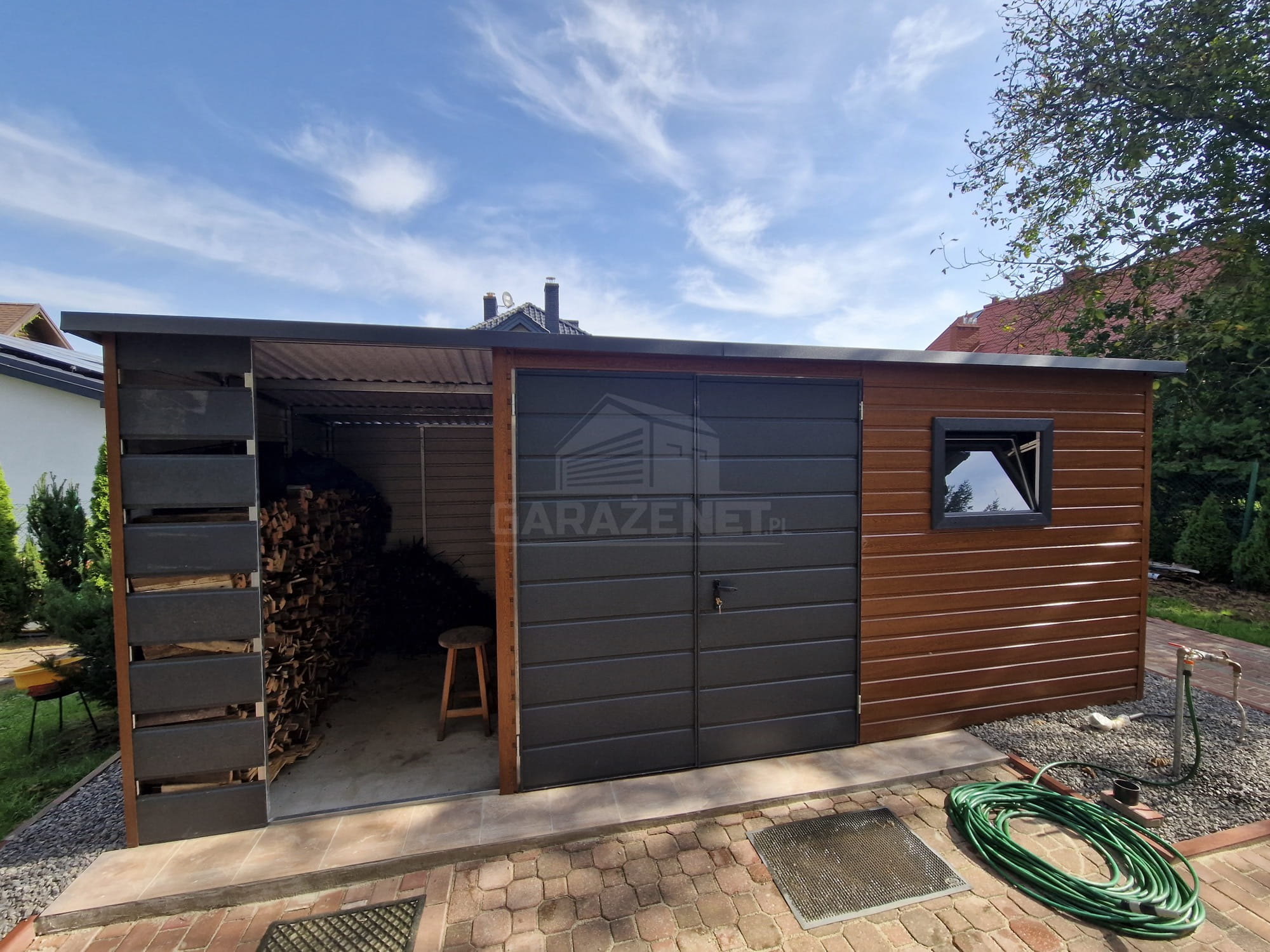SCHOWEK - DOMEK OGRODOWY 3,5X3M + WIATA 1,5M BRAMA DWUSKRZYDŁOWA - OKNO - CIEMNY ORZECH - DREWNOPODOBNY - DACH SPAD W TYŁ TS822