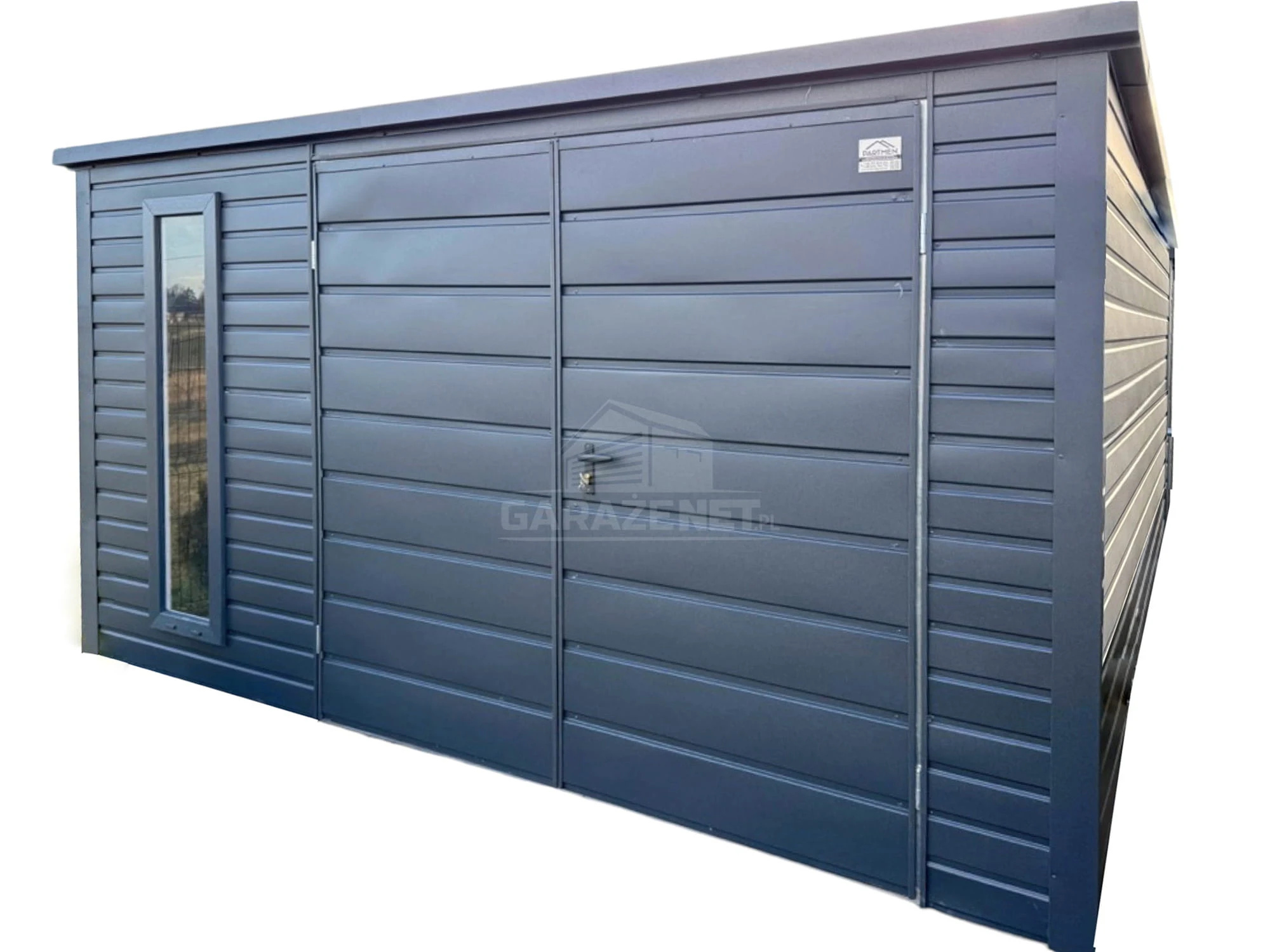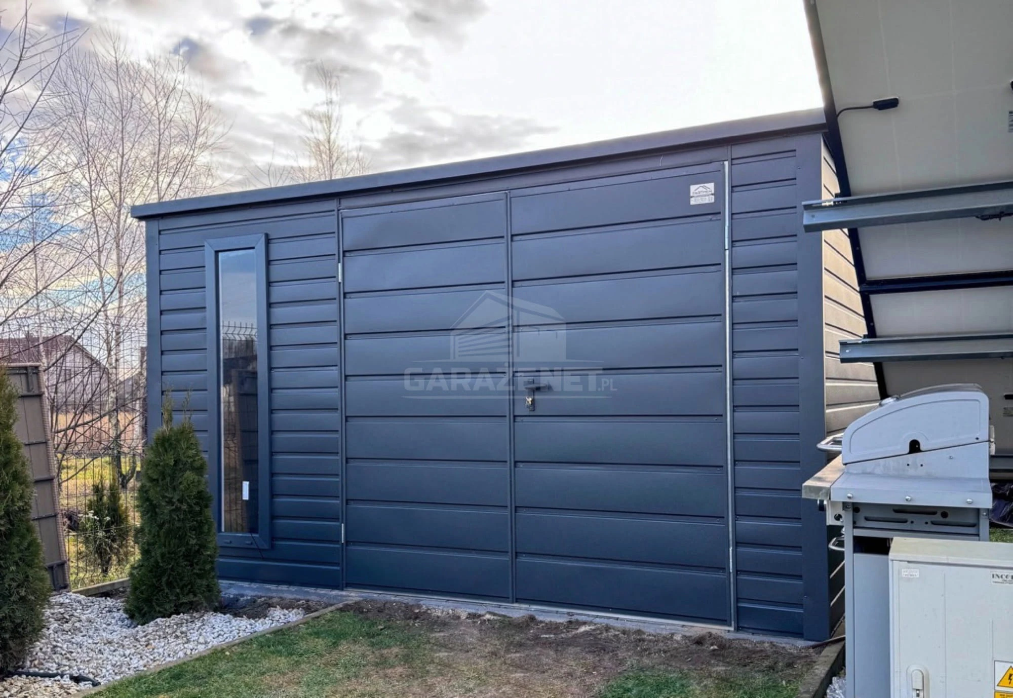 SCHOWEK – DOMEK OGRODOWY 3,5X4M + WIATA 0,5M – BRAMA DWUSKRZYDŁOWA – OKNO – ANTRACYT – DACH SPAD W TYŁ – RYNNY TS1155